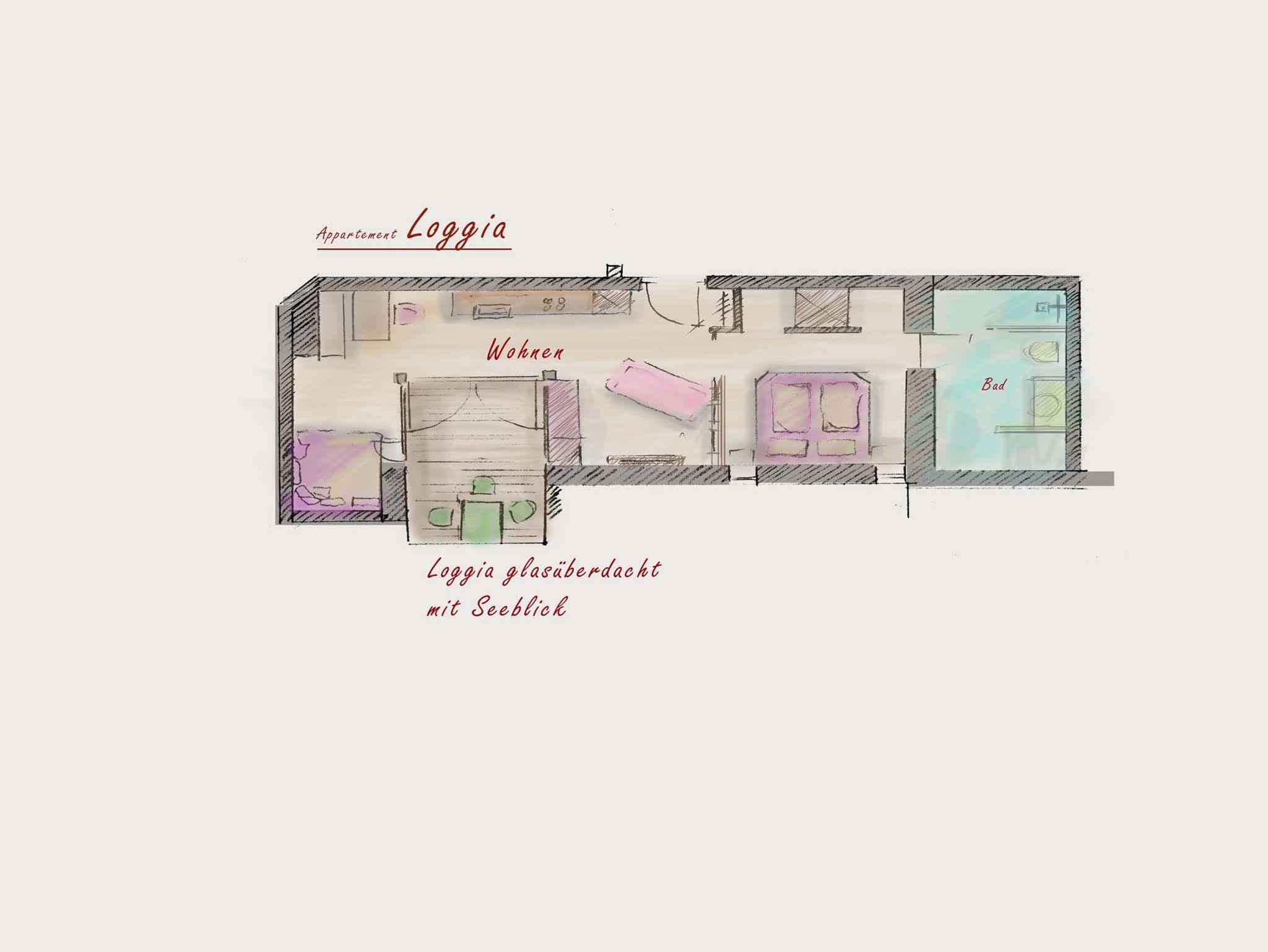 Lebensart am See, Loggia, 42 qm Dachgeschoss, Wohn-/Schlafraum kombiniert
