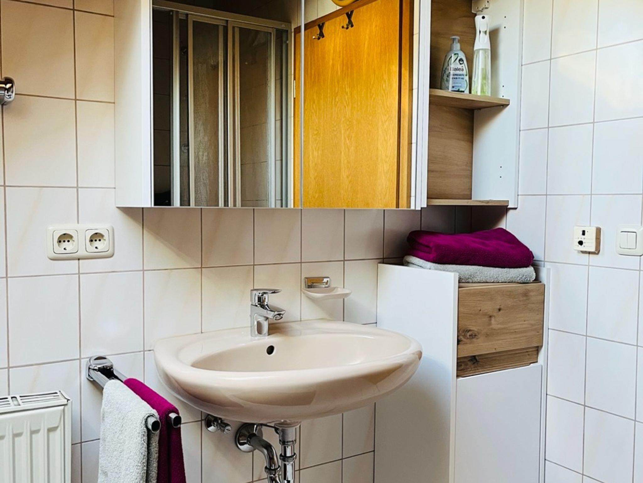 Ferienwohnung mit Bad mit Dusche, Wanne und WC. Sat-TV, Radio, Dänischer Kaminofen, Balkonsitzgruppe, Fahrradunterstand, Bandscheibenmatratzen, Möblierung ist im bayerischen Landhausstil. Die Wohnung befindet sich im Haus Herbststr. 10/ Dachgeschoss (ca. 80 Meter vom Haupthaus Haus Oberland entfernt).