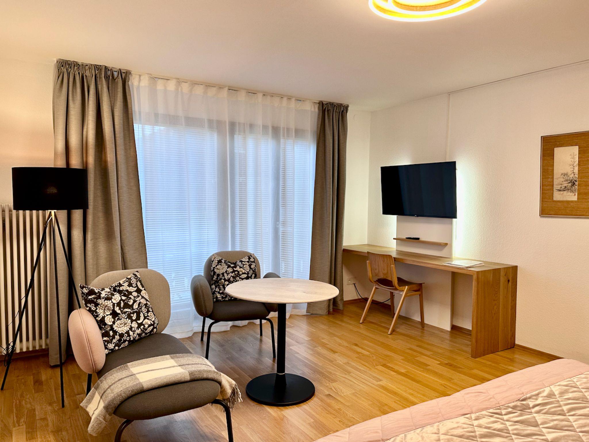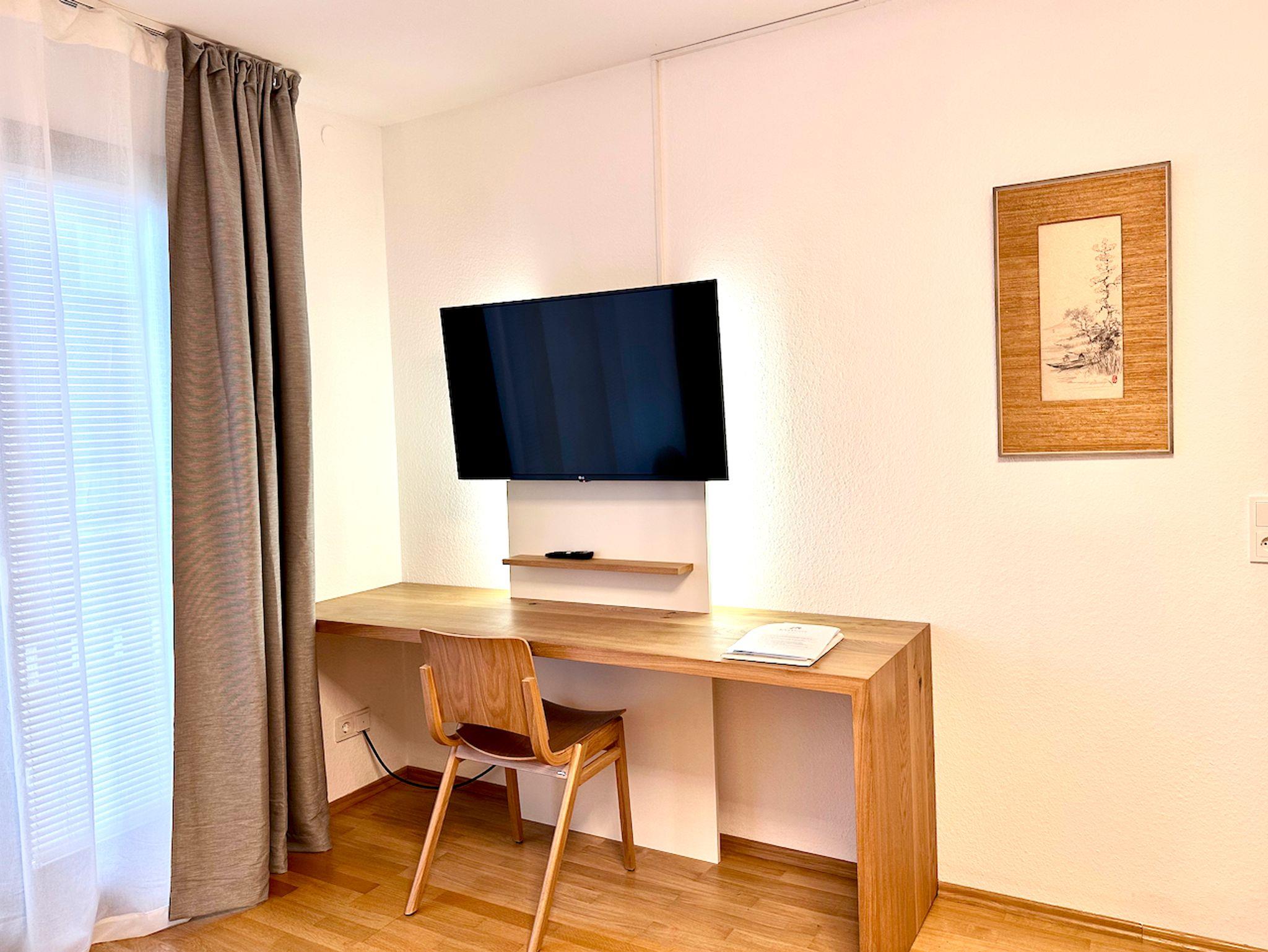 Sie wohnen in einem gemütlichen Apartment mit großem Wohn-/Schlafraum im ersten Stock mit Balkon. Das Apartment ist mit einem Doppelbett ausgestattet. Zudem verfügt es über eine Miniküche ohne Backofen mit Kochfeld im Eingangsbereich, mit der Sie eine Brotzeit oder Pause sehr gut zubereiten können. Im Wohn-/Schlafraum ist eine Sitzgruppe vorhanden. Der Balkon ist geräumig und mit einer Sitzgruppe und einem Sonnenschirm ausgestattet. Ein PKW-Stellplatz ist vorhanden. WLAN ist kostenfrei. Die Chiemgau Thermen sind ca. 200 m entfernt und der Bahnhof in 5 Minuten fußläufig erreichbar.
