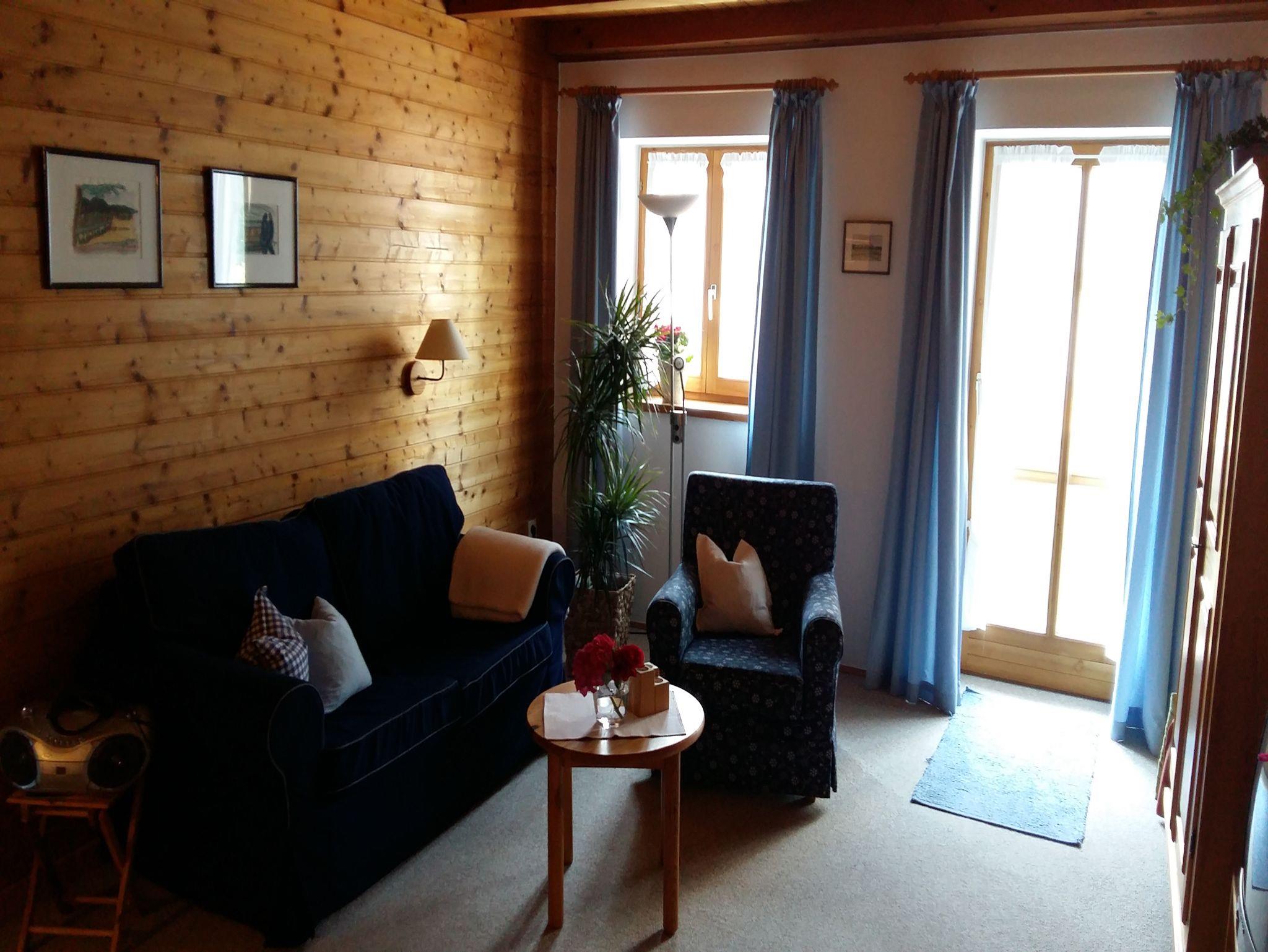 Freundliche, gemütliche Ferienwohnung im Landhausstil mit ca. 55 qm. Der Balkon ist nach Süden mit Blick auf die Chiemgauer Berge und die unverbaute Landschaft ausgerichtet. Der Wohnraum unterteilt sich in eine Küchennische mit Essplatz und einem großzügigen Wohnraum mit Couch, Sessel und TV. Das Schlafzimmer ist ausgestattet mit einem Doppelbett 1,80 m x 2 m und hat noch ausreichend Platz für ein Zustellbett für ein Kind. Das Zustellbett ist nur auf Anfrage verfügbar!