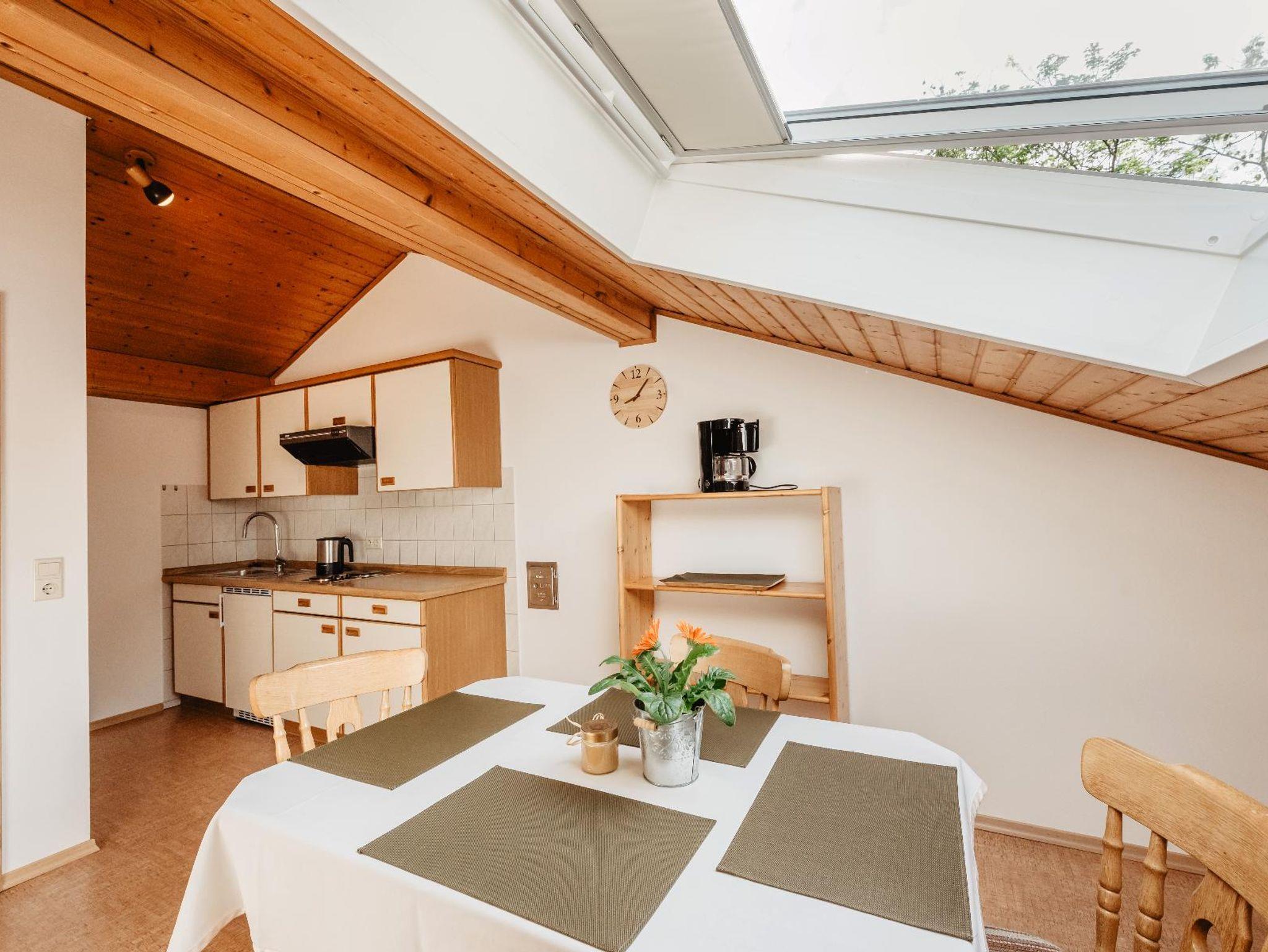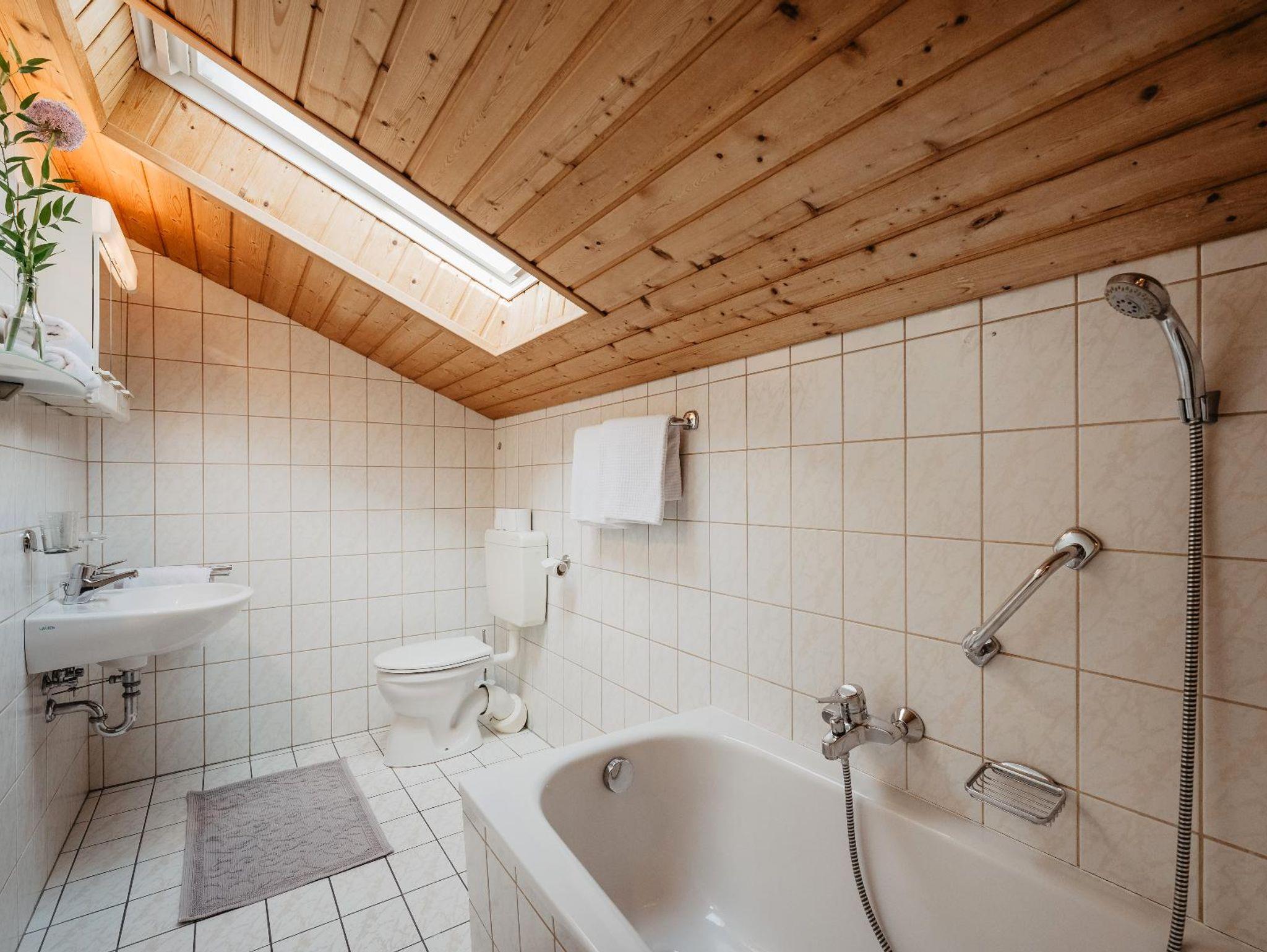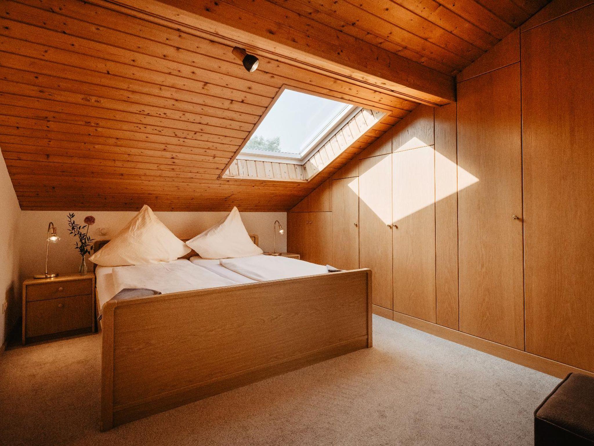 Die wohnliche 2-Zimmer-Mansardenwohnung im 2.OG verfügt über einen Balkon Richtung Westen mit Sitzgelegenheit. Die Einrichtung umfasst neben Bad mit Badewanne und WC, eine Wohnküche mit Küchenzeile, Tisch und Stühle, Kühlschrank inkl. Gefrierfach, Koch- und Speisegeschirr, sowie eine Kaffeemaschine, einen Wasserkocher und einen Toaster. Der Schlafraum ist mit Teppichboden, einem Doppelbett und Einbauschrank ausgestattet. Im Wohnzimmer befindet sich eine Couch, SAT Farb-TV, Radio, ebenfalls Teppichboden und ein feststehendes 3. Bett, das besonders wegen der Möglichkeit getrennt zu schlafen geschätzt wird. Bettwäsche, Hand- und Geschirrtücher sind vorhanden. Es ist ein Garagenstellplatz vorhanden.