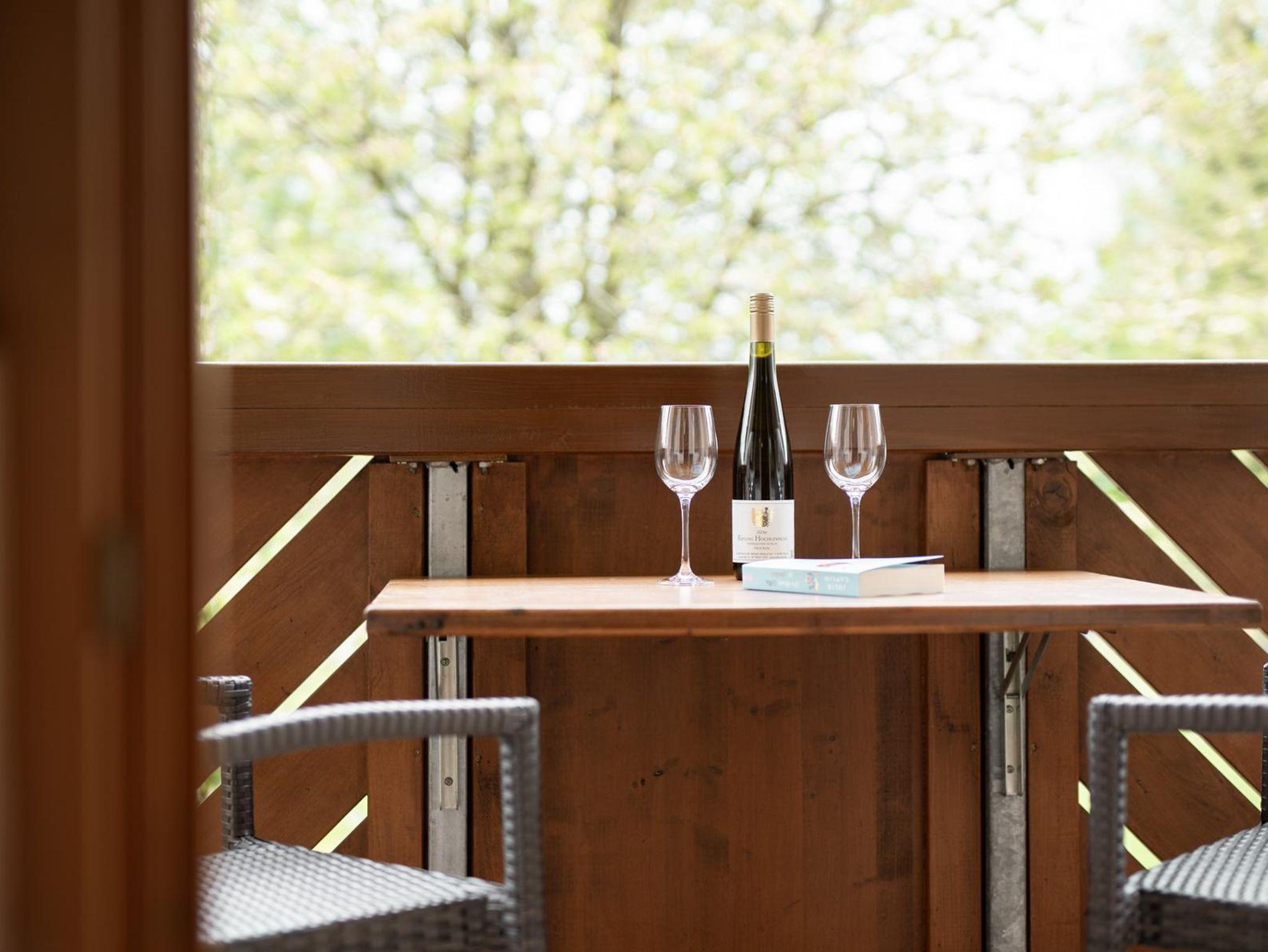 Der Balkon ist mit einer Liege, bequemen Stühlen und einem Klapptisch ausgestattet.