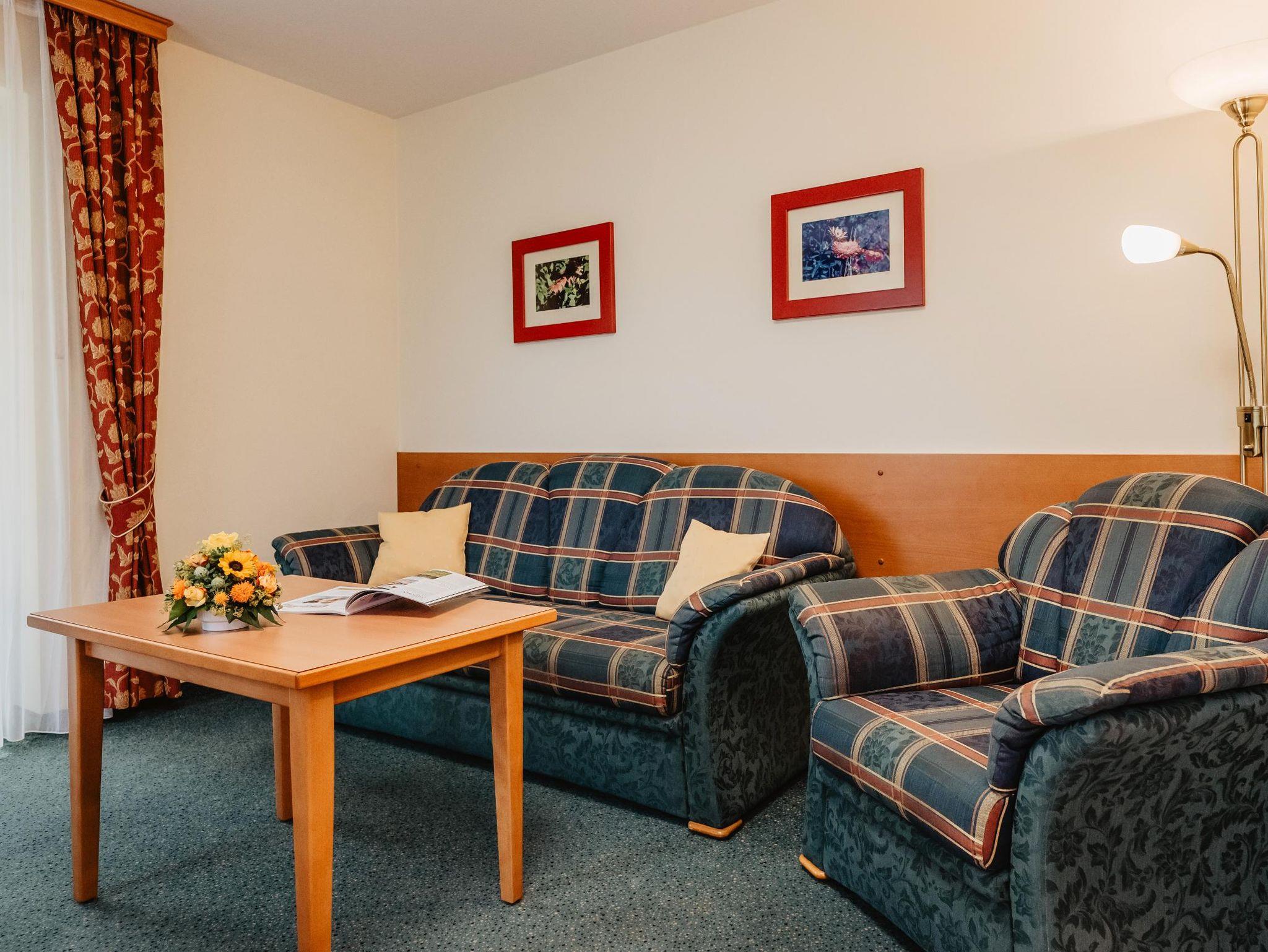 Kuren u. Erholen in komf. 1-2 Zimmer- App. mit Balkon, Du/WC getrennt, Familienbetrieb, Nichtraucherhaus, sehr ruhige Lage - mitten im Grünen am Ende einer kurzen Sackgasse, jedoch direkt im Ort, Geschäfte und Massagepraxen sind nur 120 m, eine Bushaltestelle 50 m entfernt.