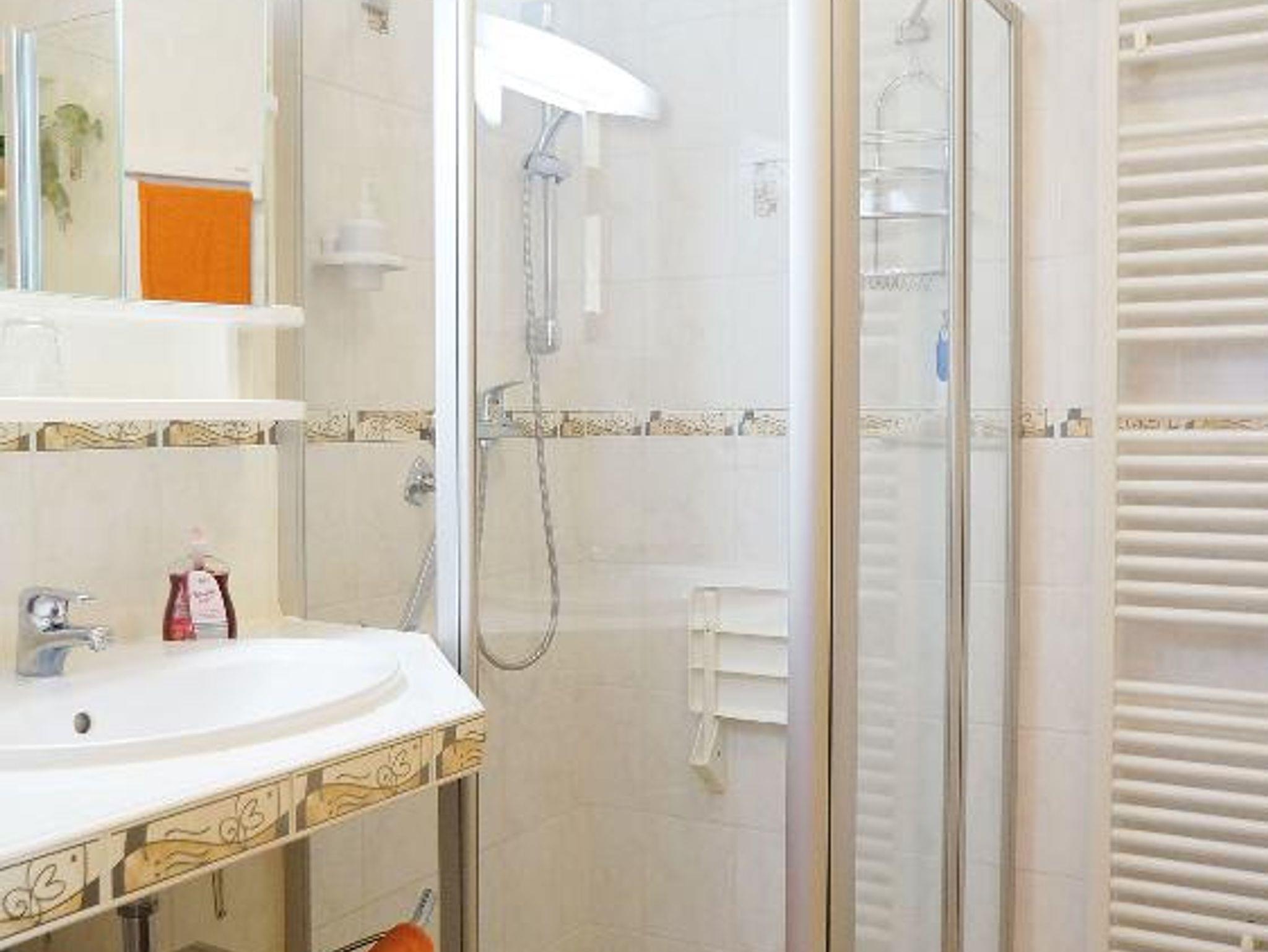 Das Badezimmer mit ebenerdiger Dusche, WC, Spiegelschrank, Fön und Handtuchtrockner rundet das Gesamtbild ab.