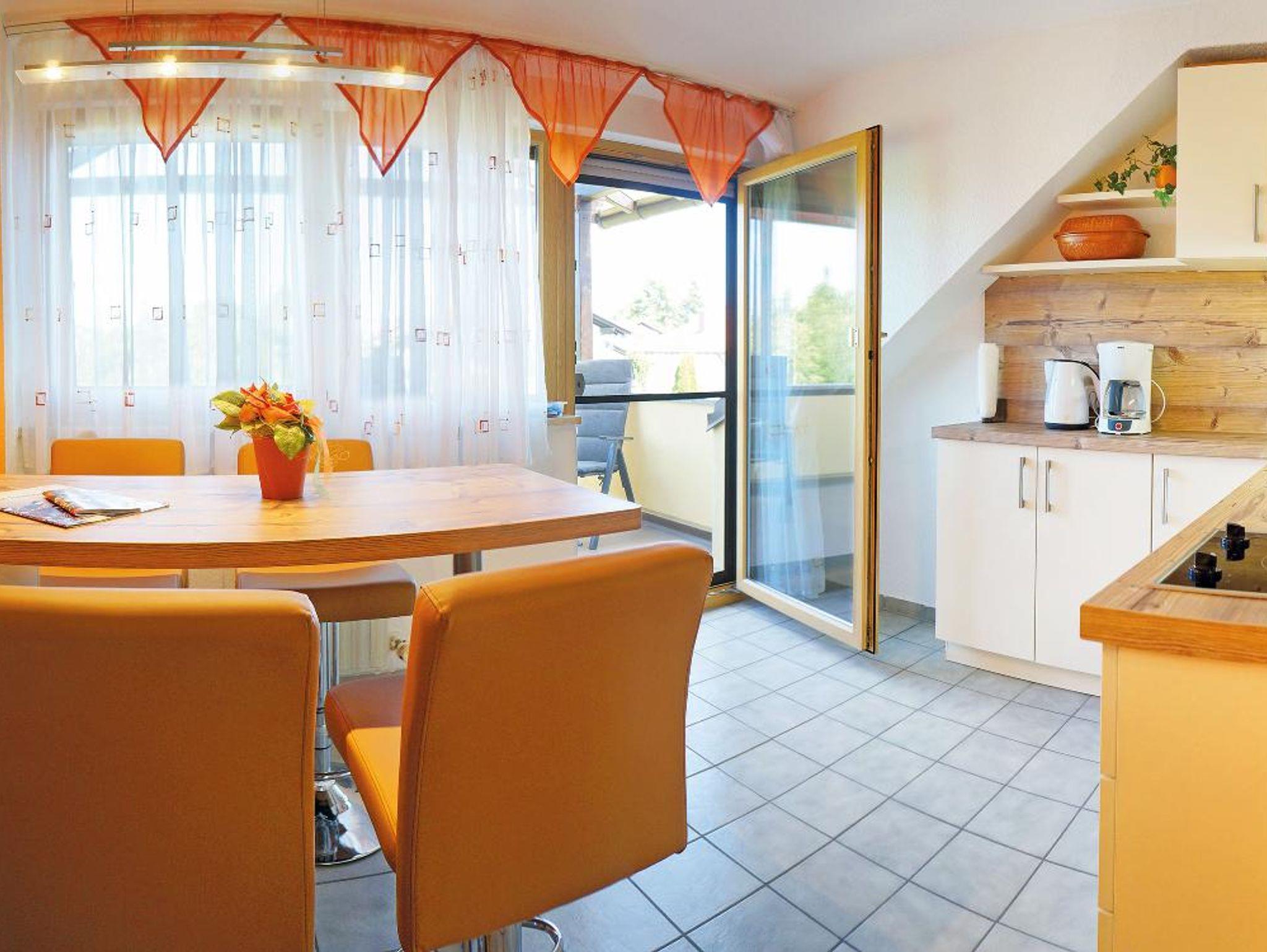 Die Ferienwohnung im Obergeschoß bietet mit ca 45qm und einem großen überdachten Balkon bis zu 4 Personen Platz. Es gibt 1 Schlafzimmer mit 2 feststehenden Betten. Das gemütliche Wohnzimmer mit 2 Schlafsofas und Flachbild-TV lädt zum Verweilen ein. Die gut ausgestattete Küche mit Kühlschrank inkl Gefrierfach, 2 Herdplatten, Mikrowelle, Wasserkocher, Eierkocher, Toaster und Kaffeemaschine lässt keine wünsche offen. Es gibt in der Küche einen Essplatz für 4 Personen und den Zugang zum Balkon. Das Badezimmer mit ebenerdiger Dusche , WC, Spiegelschrank, Fön und Handtuchtrockner rundet das Gesamtbild ab. Bitte beachten Sie das Haustiere nur mit einem Aufpreis von 3,50 € pro Tag erlaubt sind. Das WLAN, der Parkplatz vor dem Haus, und die Garage für mitgebrachte Räder können Sie kostenlos nutzen.