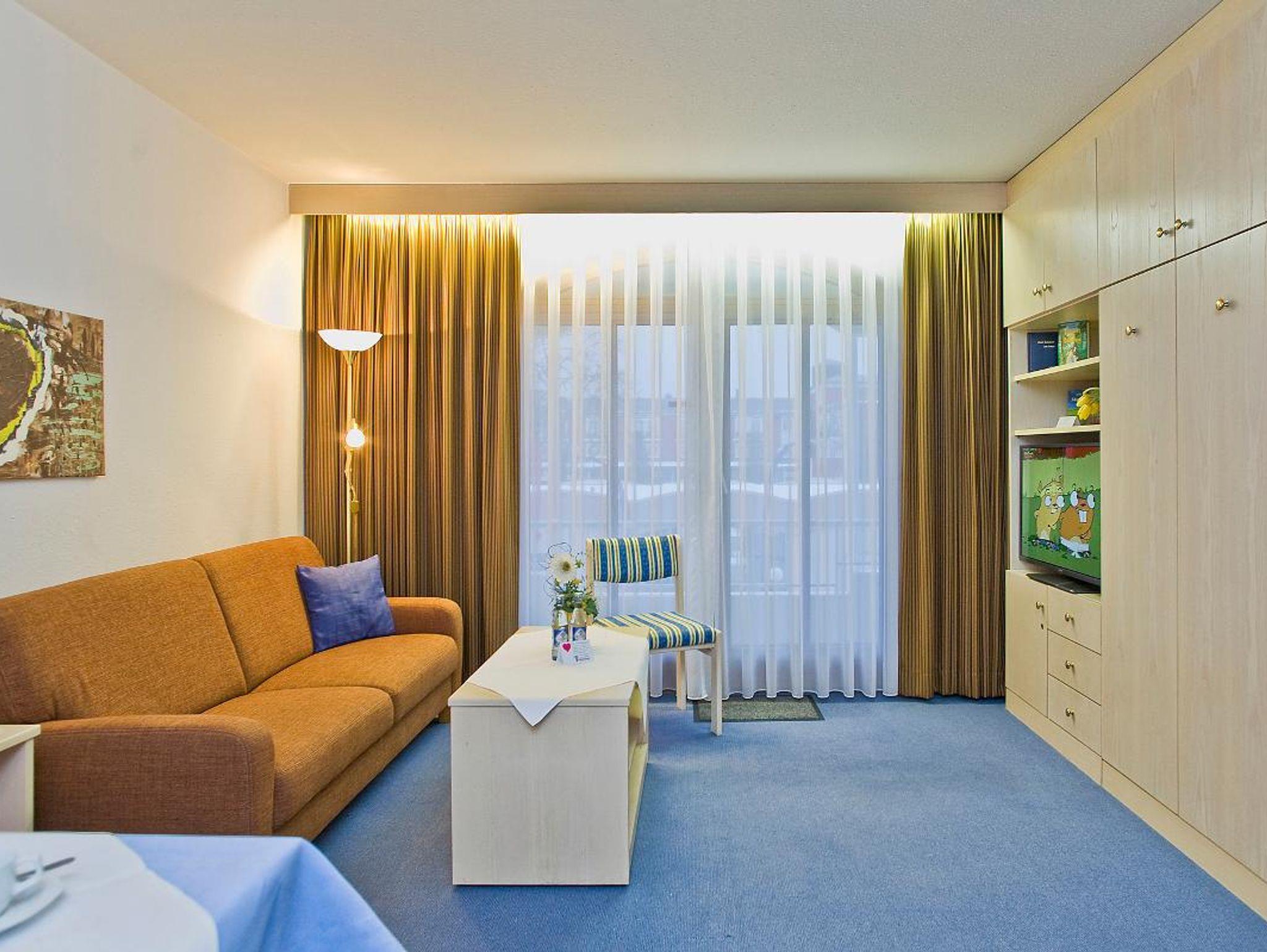 Gemütliche Ein-Raum-Appartement mit Balkon, Essecke, Küchenzeile, Flatscreen-TV, Telefon, Radio, Bad mit Dusche oder Badewanne.