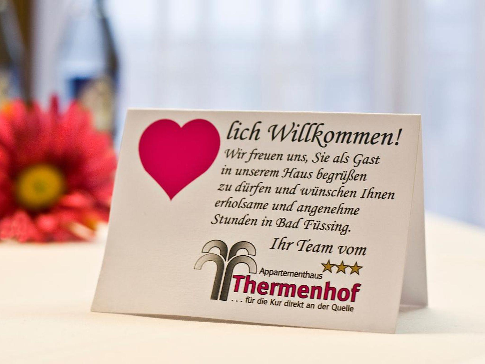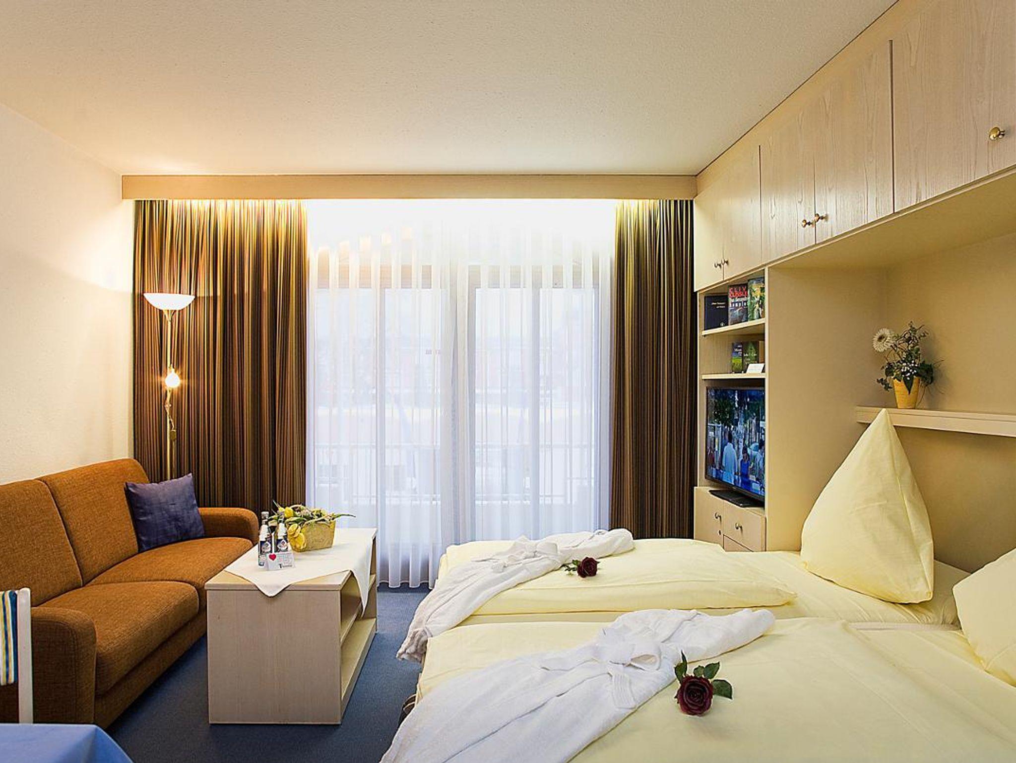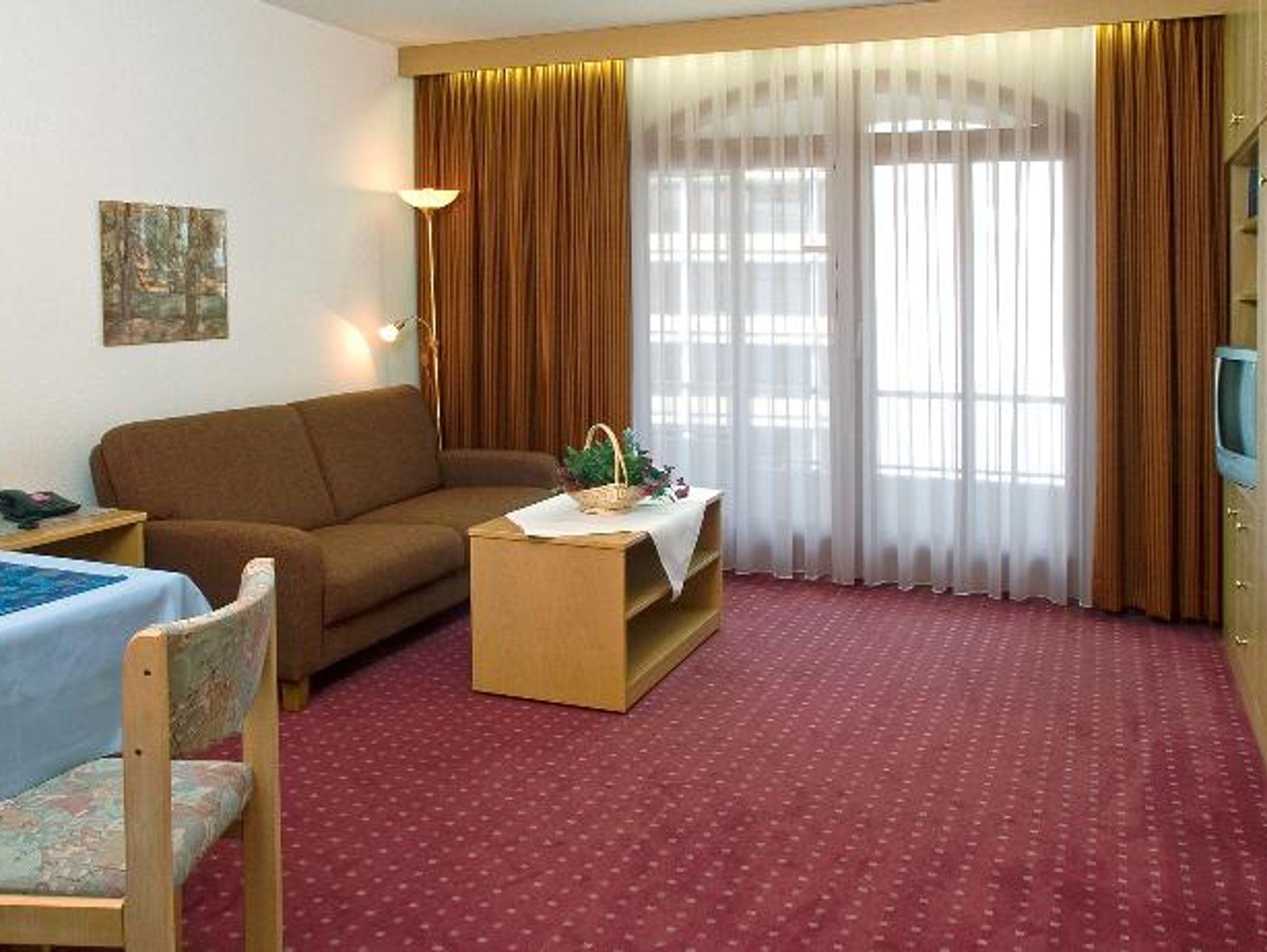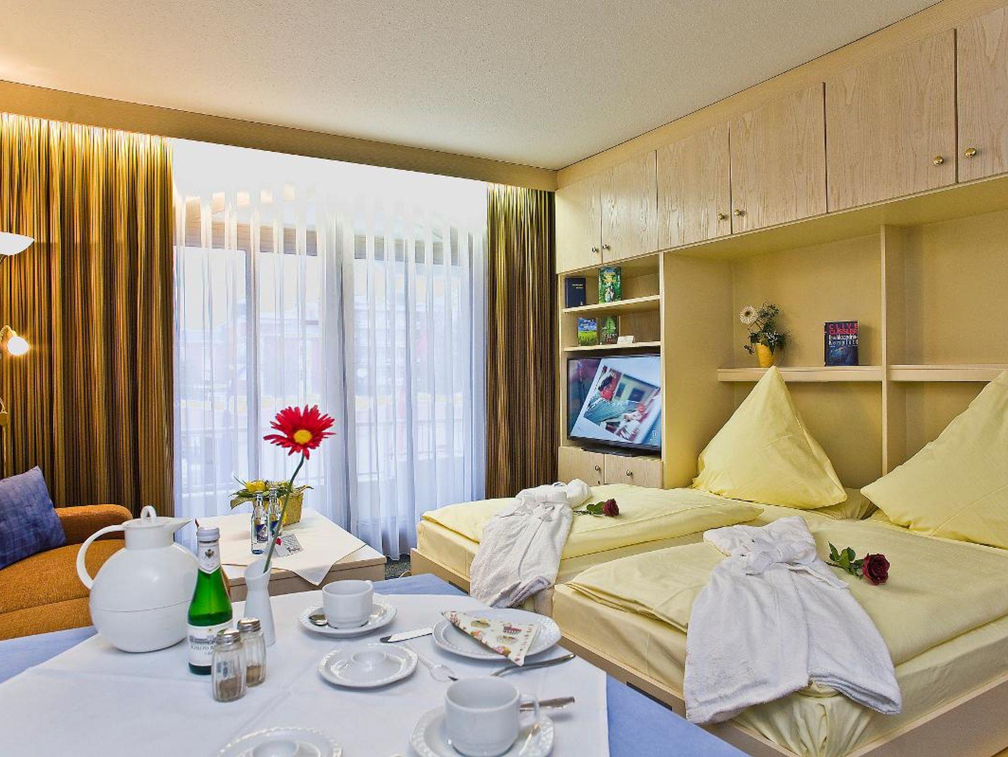 Für die Kur direkt an der Quelle - modern eingerichtete, behagliche Appartements mit Balkon, Kleinküche, Telefon (kostenlos ins deutsche Festnetz), Farb-TV/SAT, Radio, W-LAN, Lift, Liegewiese, stufenloser Hauseingang, Massagepraxis mit Naturfango, Arztpraxis im Haus.