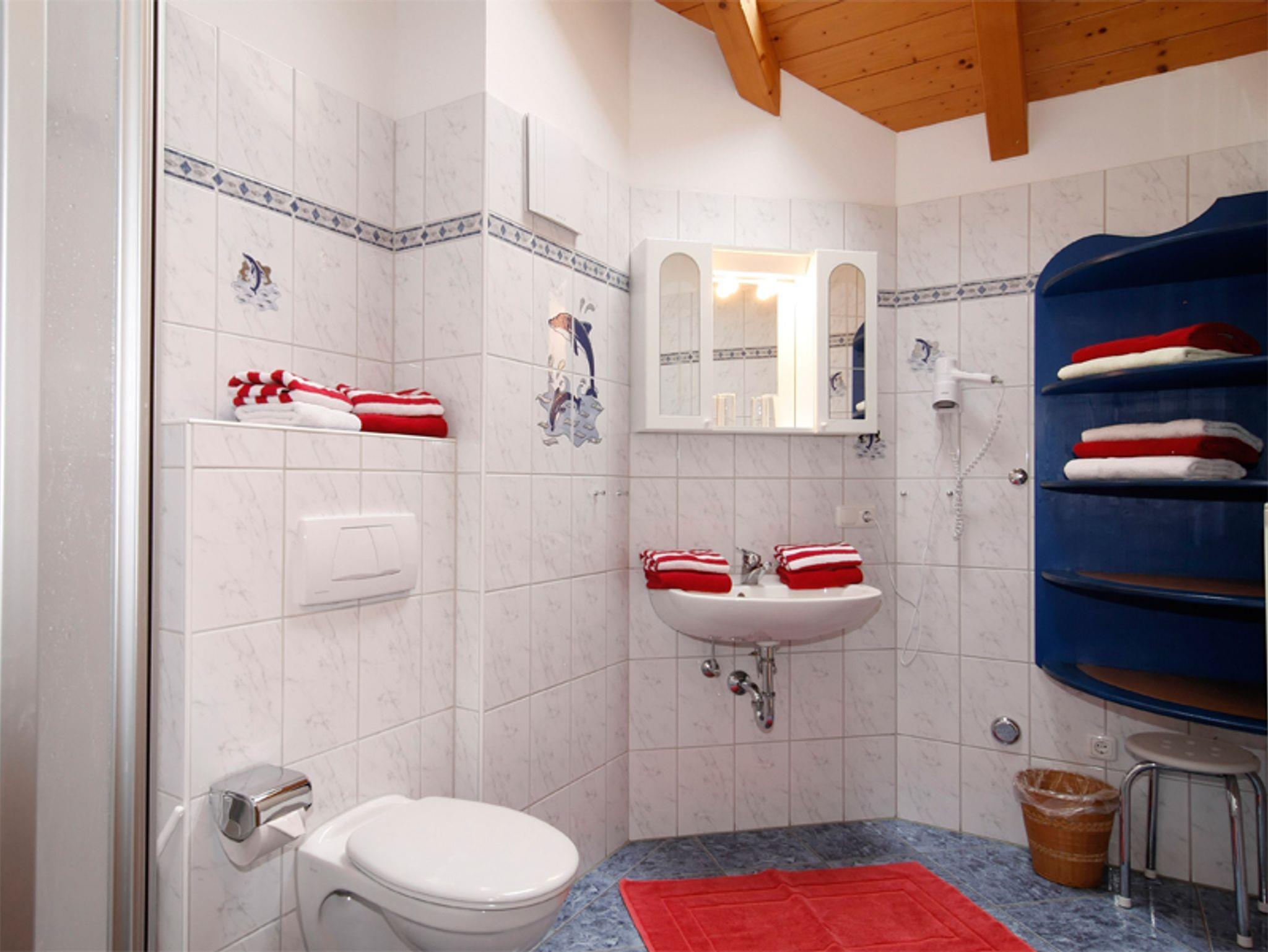 Die Ferienwohnung Kirsche im Dachgeschoss (55m²) bietet Platz für max. 4 Personen. Die Wohnung verfügt über zwei getrennte Schlafzimmer mit einem Doppelbett. Das Bad ausgestattet mit WC, Dusche, Föhn und Handtücher.