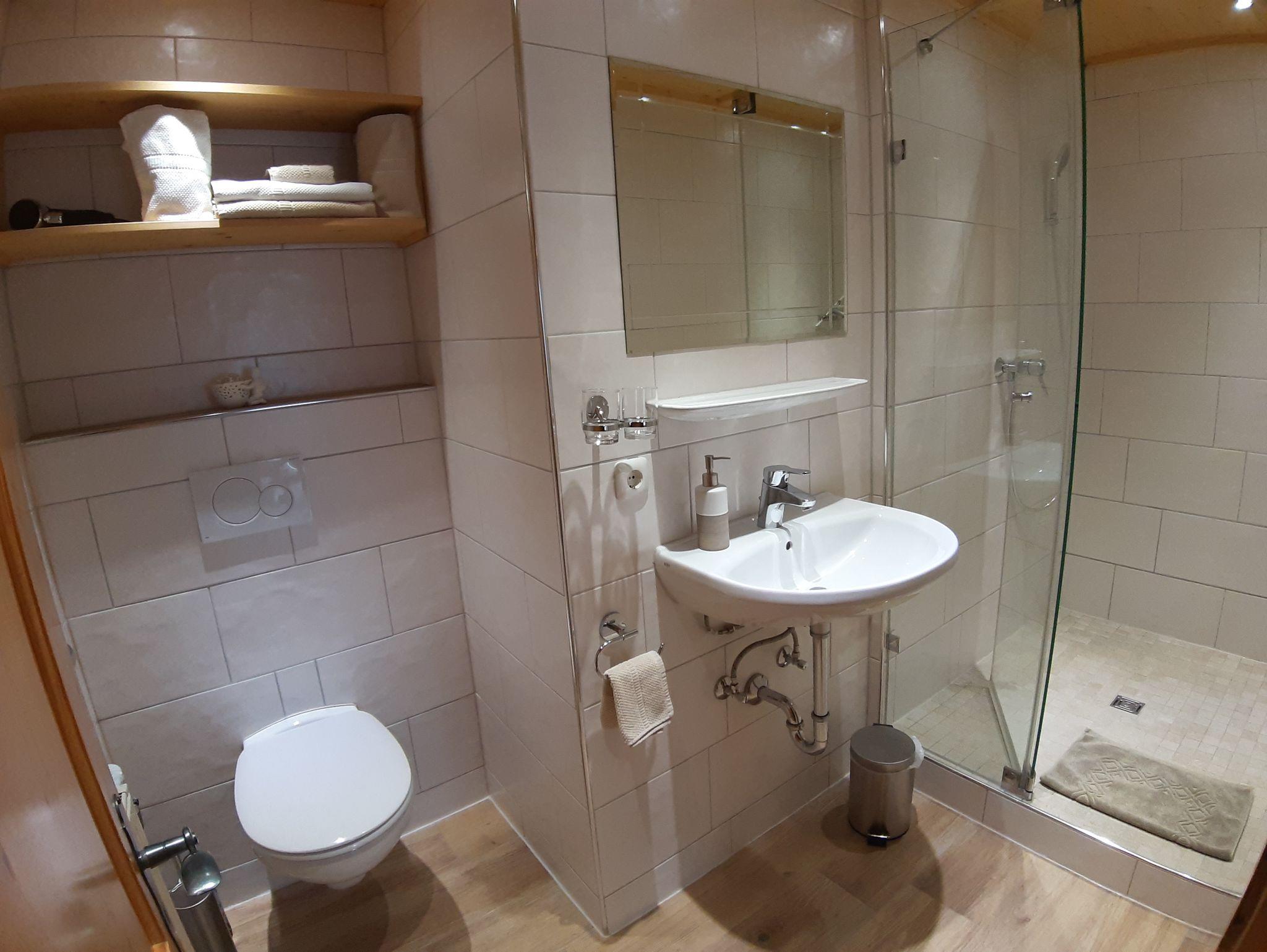 Großzügige Dusche mit WC. Gut ausgestattete Küche, die direkt an den Wohnbereich angrenzt.
