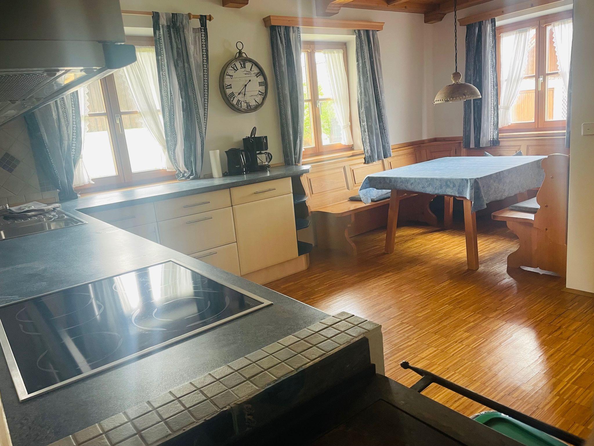 Die Ferienwohnung im Erdgeschoss ist ausgestattet mit einer großen Küche mit Eckbank, Herd und Ofen, Kaffeemaschine, Wasserkocher und Toaster.