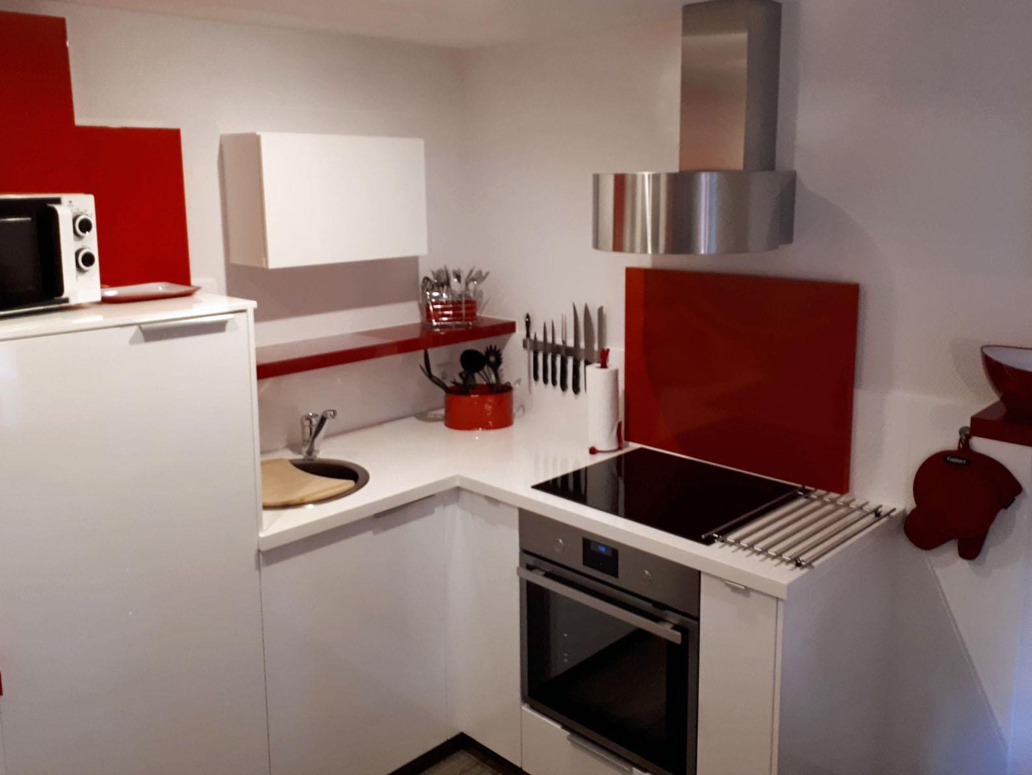Die moderne Küche schließt sich direkt an, ist ausgestattet mit einer Kühl-Gefrierkombination, Elektroherd mit Backofen, Mikrowelle, Kaffeemaschine, Toaster und Wasserkocher, ausreichend Geschirr steht zur Verfügung.