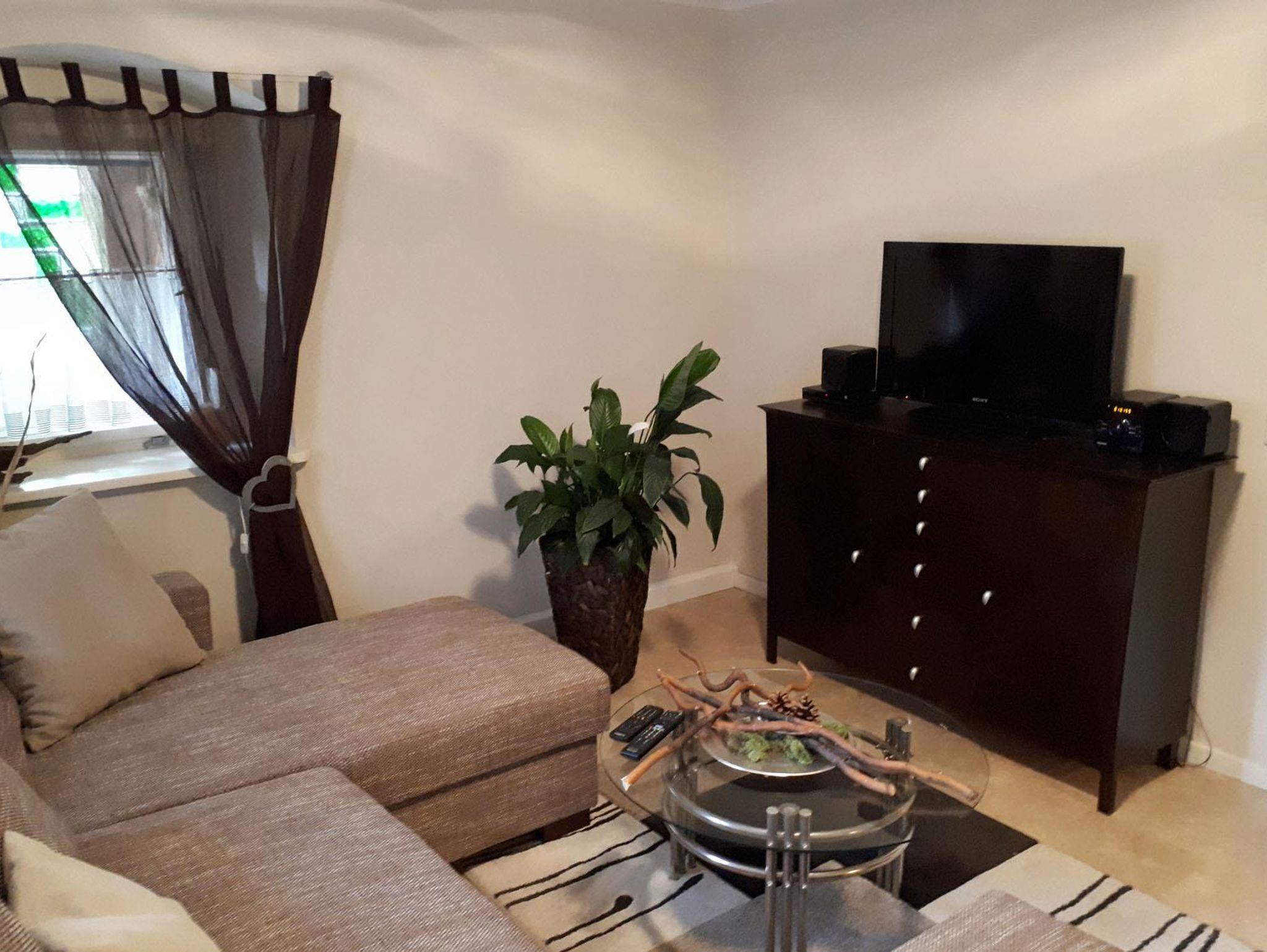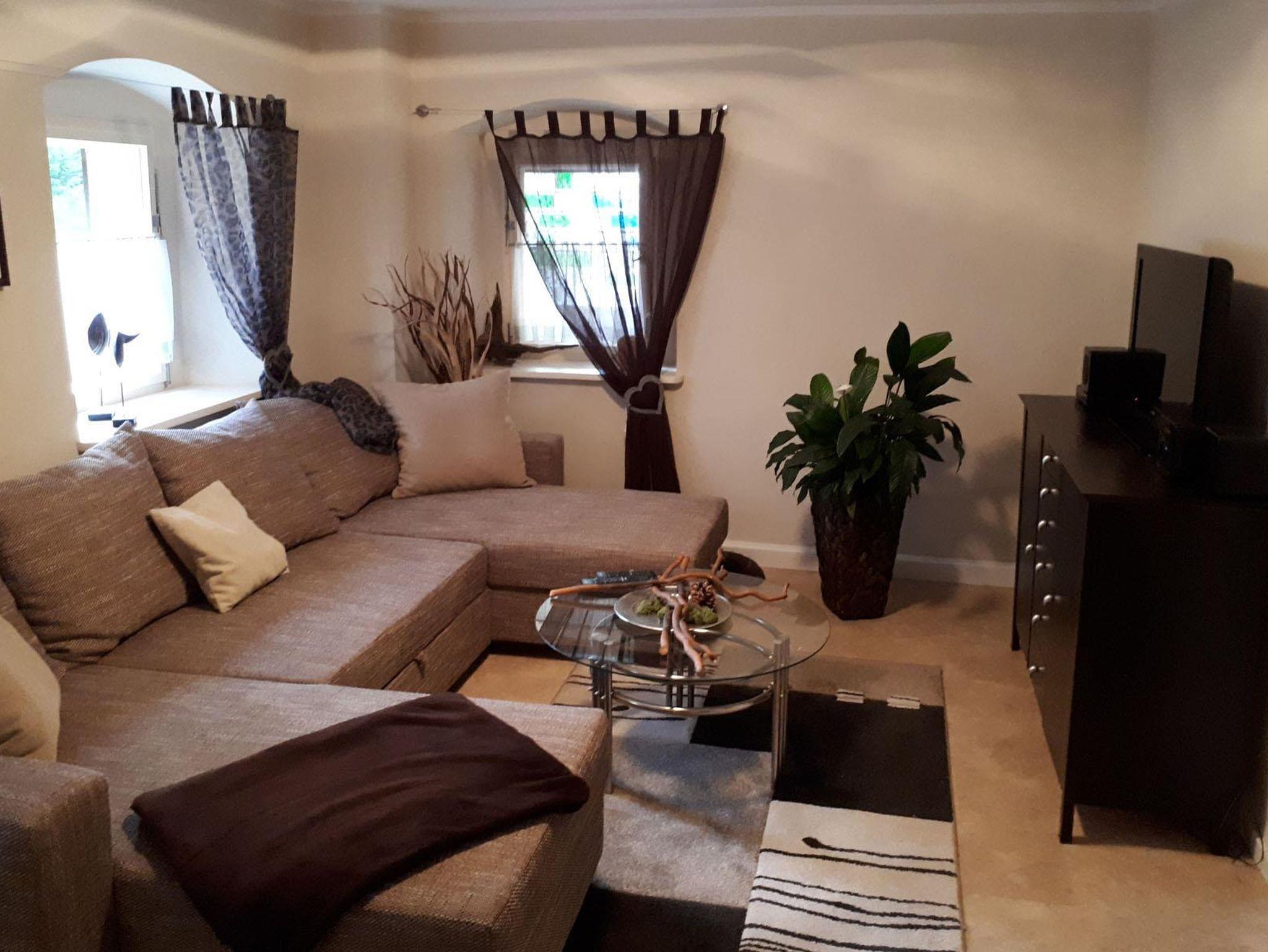 Über den Flur erreichen Sie das urgemütliche Wohnzimmer mit der großen Couch, Sideboard, Radio-CD-Anlage und Flachbildschirm.