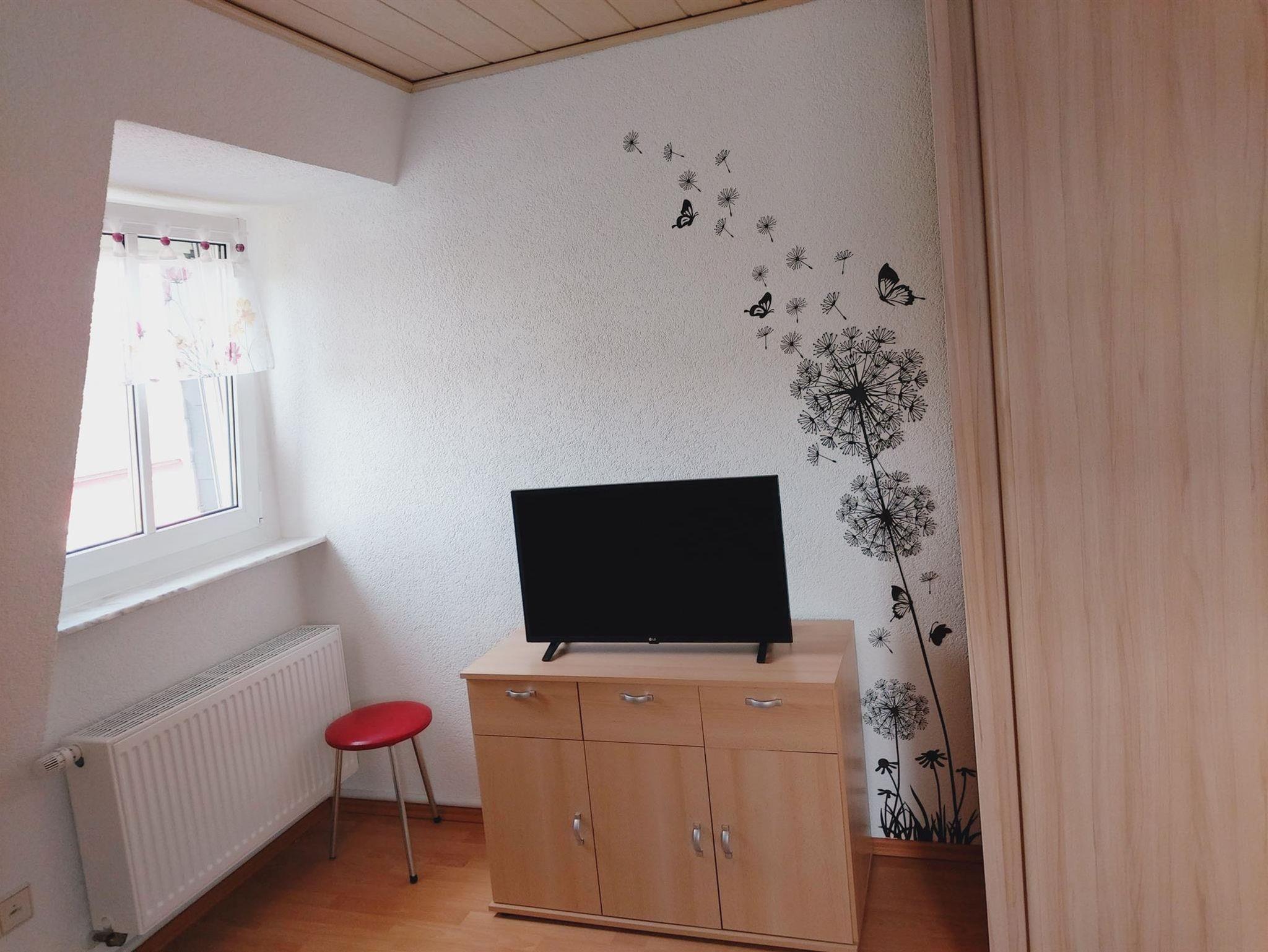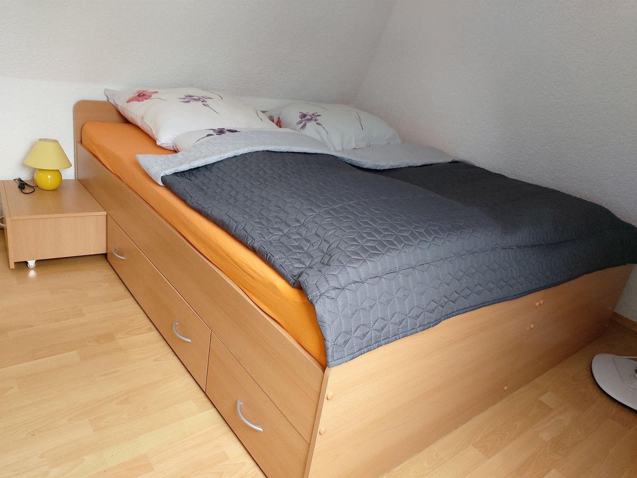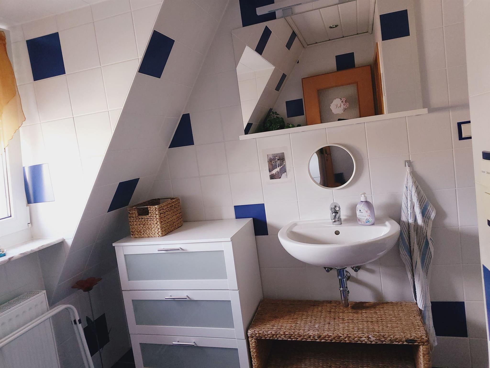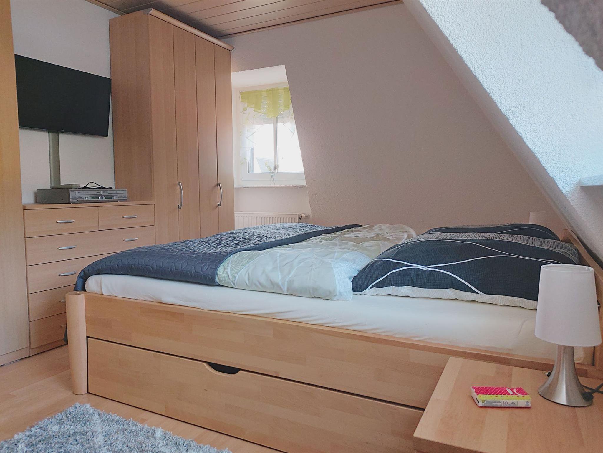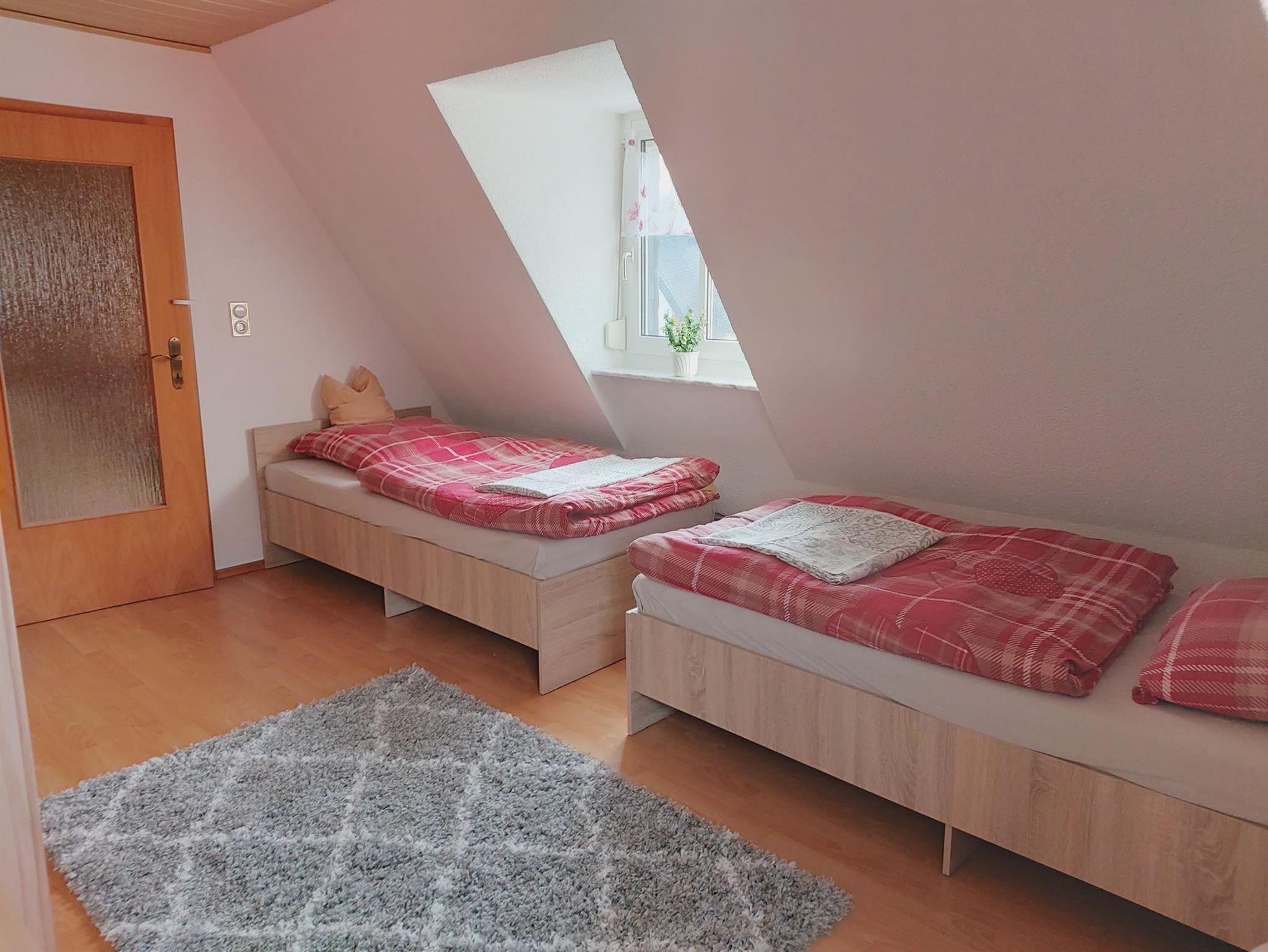 Ebenfalls im Erdgeschoss befindet sich das Badezimmer mit Badewanne, Dusche und Waschtisch und WC. Die zwei Schlafräume befinden sich im Obergeschoss. Ein Schlafraum ist mit einem Doppelbett und einem Kleiderschrank ausgestattet, das zweite Schlafzimmer mit zwei Einzelbetten und ebenfalls einem Kleiderschank. Beide Schlafräume sind mit einem TV-Gerät ausgestattet. Im Obergeschoss befindet sich auch die Gästetoilette mit WC und Waschtisch. Ab einer Gästeanzahl von mind. 5 Personen wird ein zusätzlicher Schlafraum im 2. Obergeschoss zur Verfügung gestellt, dieses Zimmer ist mit einem Doppelbett ausgestattet sowie 2 Schränken (Flachstrecke).
