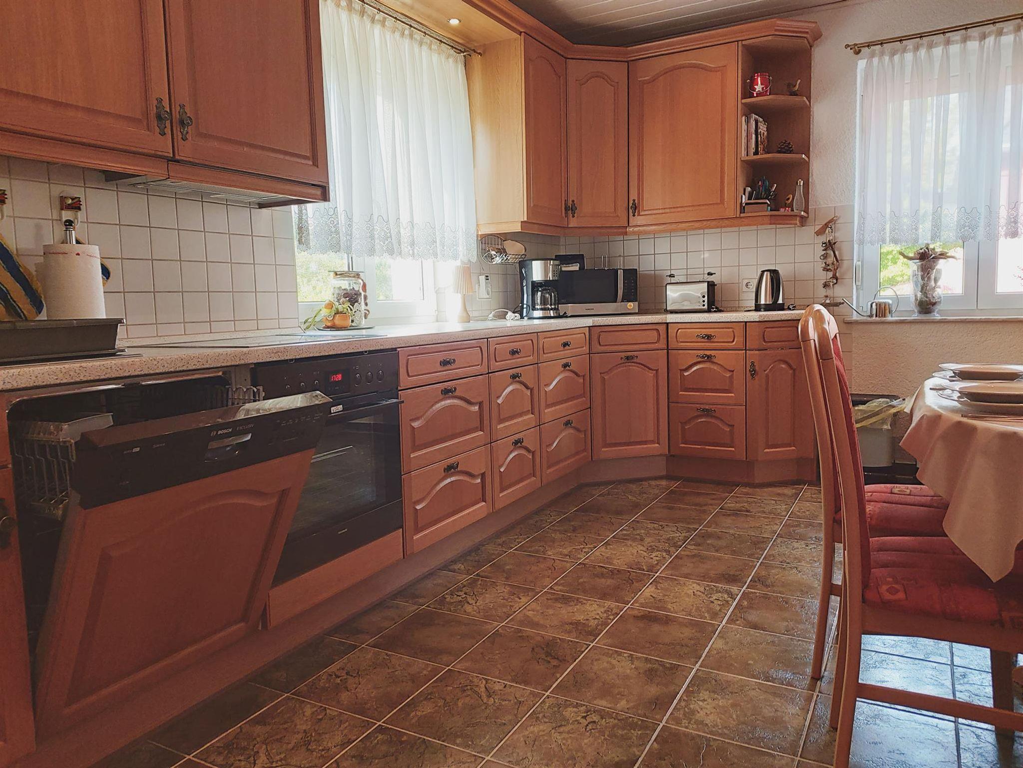 Im Erdgeschoss bietet die großzügige offene Wohnküche mit ca. 28 qm viel Platz zum gemeinsamen Kochen, Essen, Spielen oder einfach zum Ausruhen. Im Bereich der Küche befindet sich eine Essecke für bis zu 6 Personen, im Bereich des Wohnzimmer`s erwartet die Gäste eine großzügige Eck-Couch und ein höhenverstellbarer Couchtisch, hier kann man gemütlich Zeitung oder ein gutes Buch lesen, oder auch TV schauen. Vom Wohnzimmer aus gelangen Sie auf die überdachte Terrasse, von der aus auch der Garten und die PKW-Stellplätze erreichbar sind.