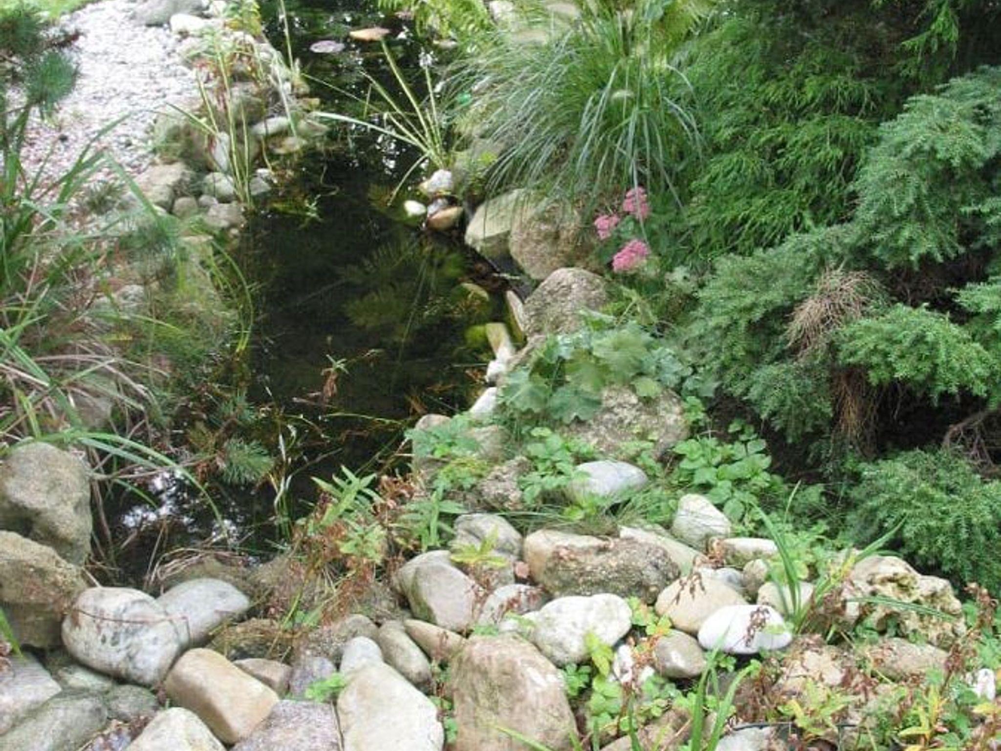 Idyllischer Garten mit Wasserlauf und Zierteich ist über das Treppenhaus erreichbar, die Liegewiese ist mit Gartenmöbel ausgestattet. Sehr ruhige Lage