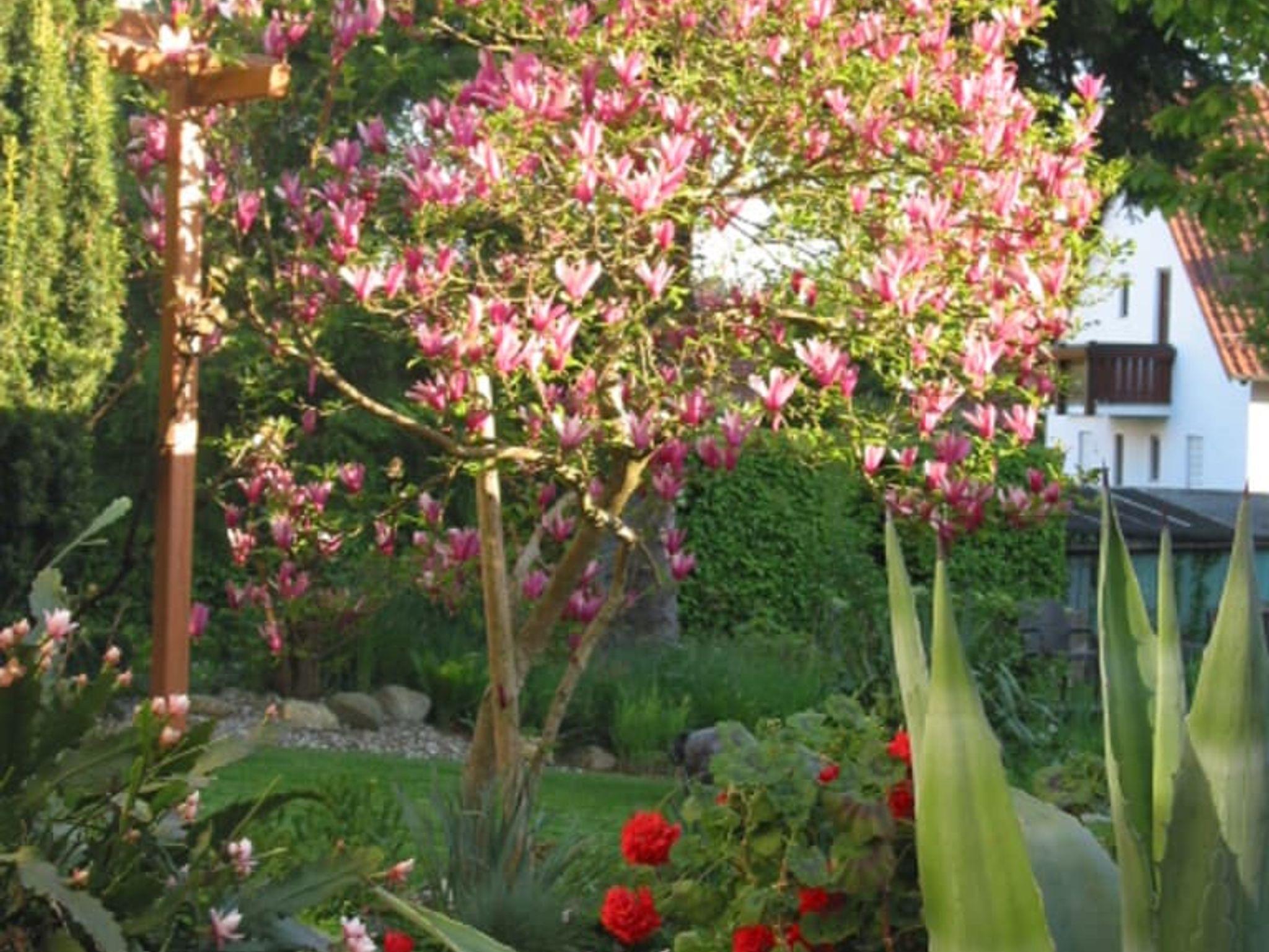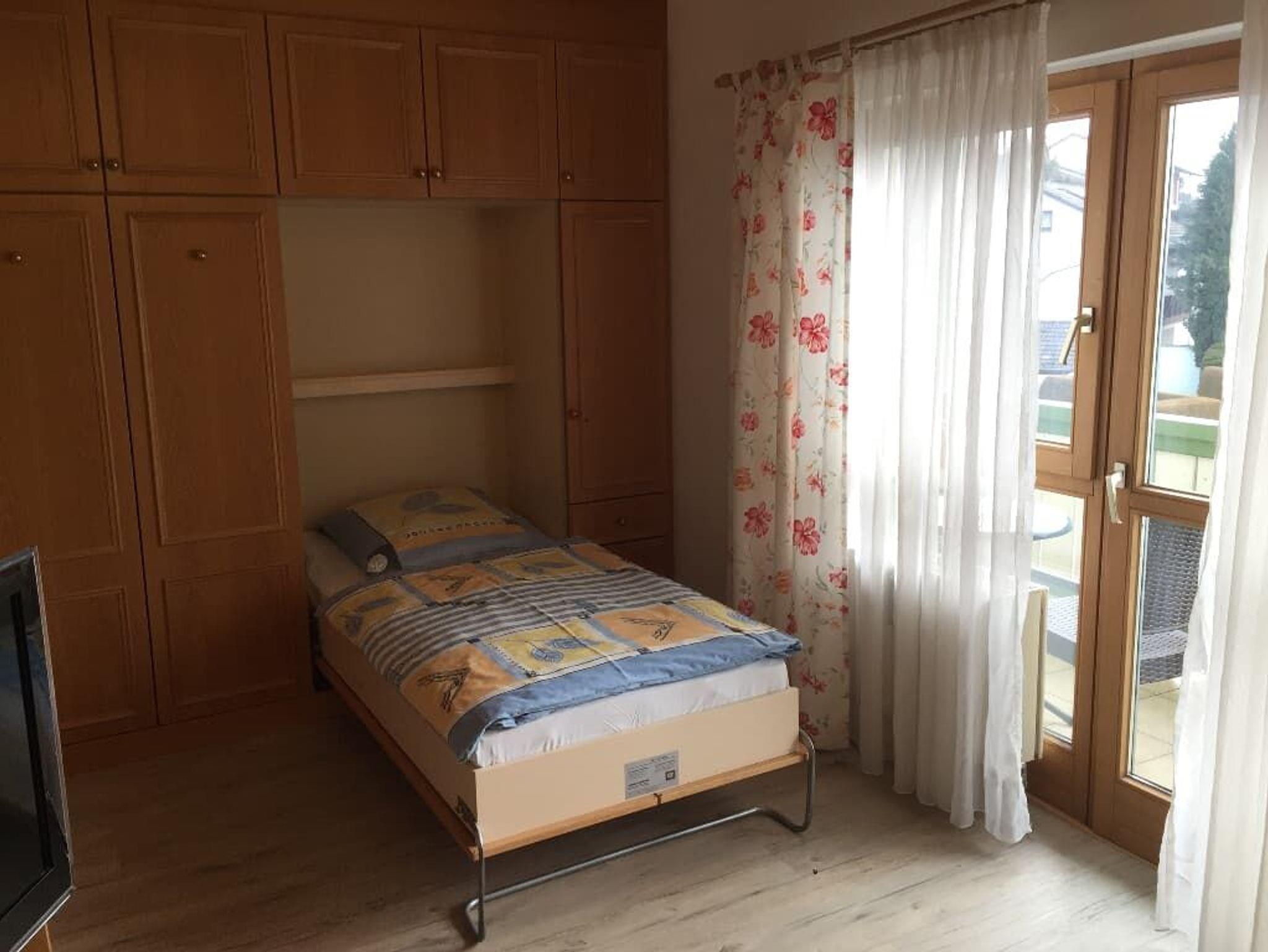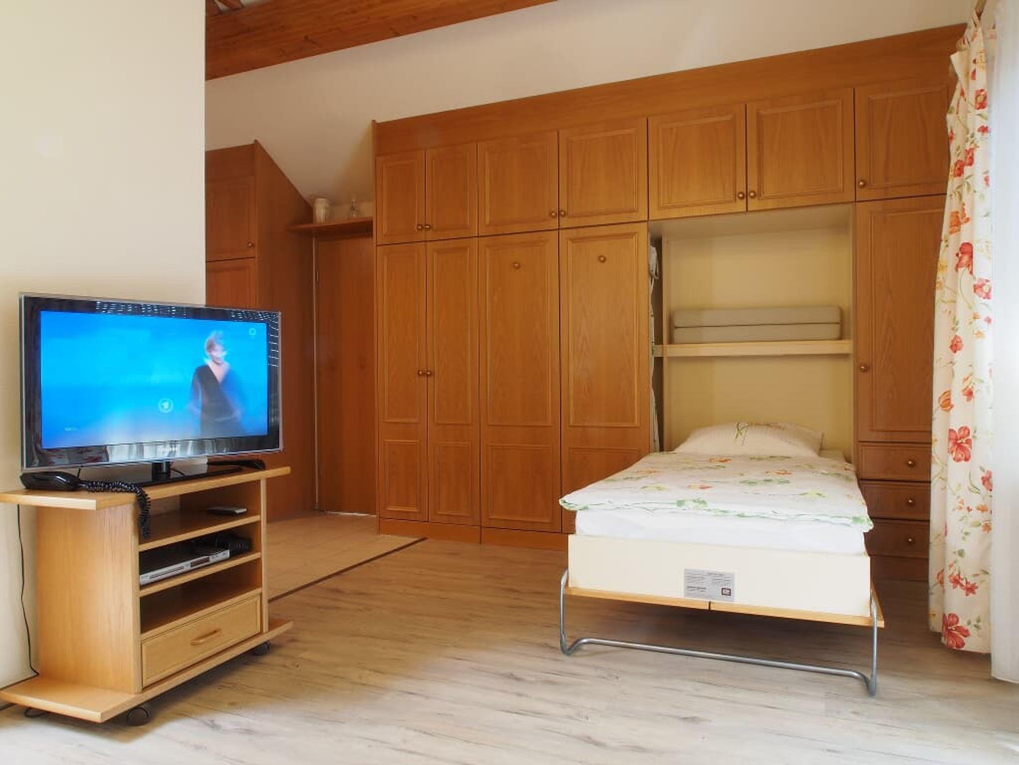 Liebevoll und hell eingerichtetes Appartement mit DU/WC, Telefon, SAT-TV, Balkon möbeliert, Zugang zu idylischem Gatren mit Wasserlauf und Zierteich über Treppenhaus, Liegewiese mit Gartenmöbel, sehr ruhig gelegen.