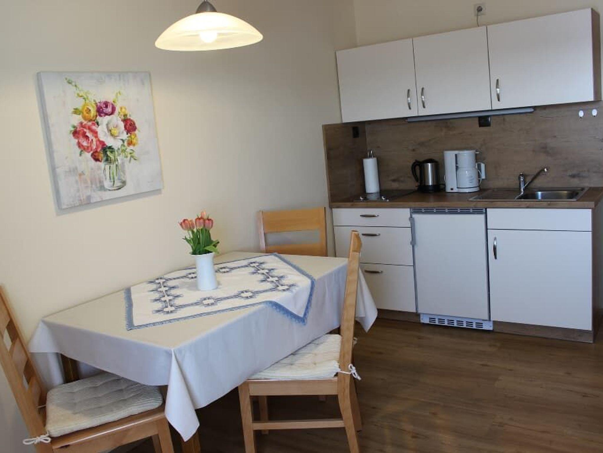 Die Ferienwohnung 1 ist 48qm groß und für 2 Personen ausgelegt. Es gibt ein Schlafzimmer mit einem bequemen Doppelbett und einem Schrank. Die Wohnküche ist ausgestattet mit einem Kühlschrank, einer Kaffeemaschine und einem Toaster, eine Brotmaschine, einen Wasserkocher, außerdem ist Tisch- und Küchenwäsche vorhanden. In der Wohnküche (getrennt vom Schlafbereich) finden Sie zudem einen SAT-TV, sowie ein Radio. Das Bad verfügt über eine Dusche. Ein separates WC befindet sich ebenfalls in der Wohnung. Die Ferienwohnung besitzt außerdem eine Terrasse, eine Liegewiese, sowie ein kleines Sommerhäuschen am Teich im Garten. Handtücher und Bettwäsche sind kostenfrei vorhanden. Nichtraucherwohnung