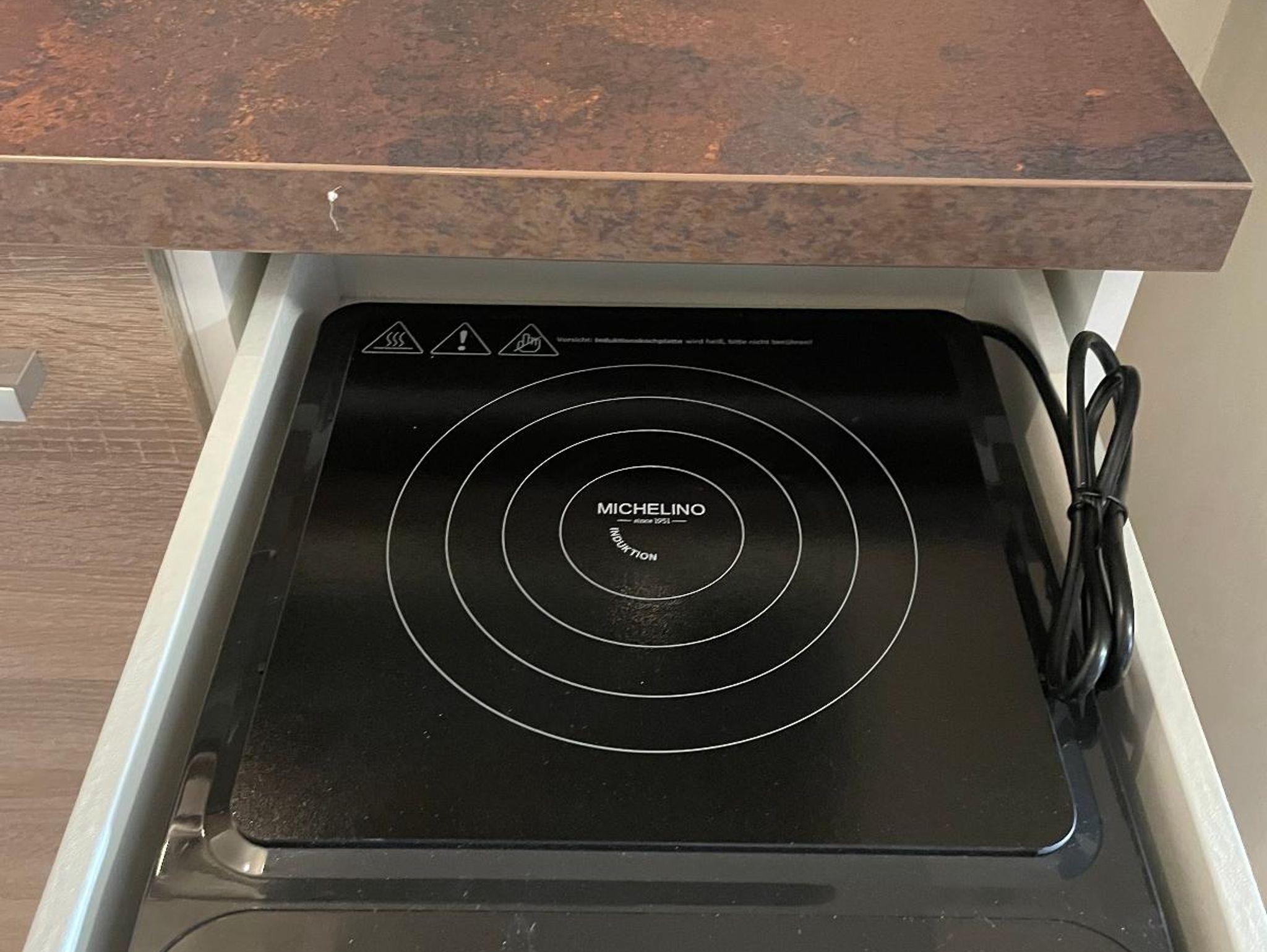 Kaffeemaschine, Toaster, Kühlschrank mit Gefrierfach, Mikrowelle, Induktionskochfeld.