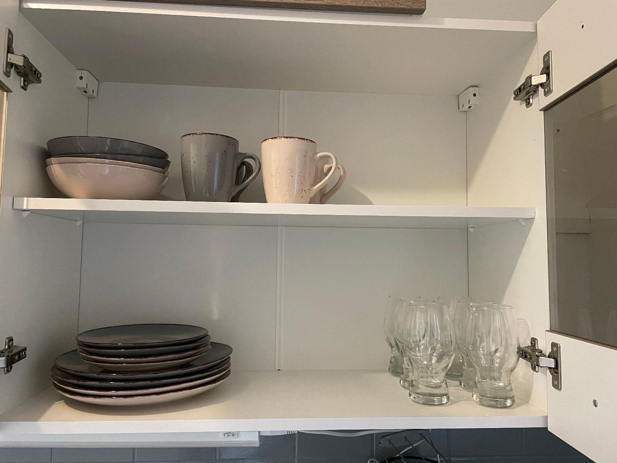 Dazu gehören Besteck, Geschirr, Töpfe und Pfannen, sowie ein Begrüßungsset mit Spültüchern, Spülmittel und Schwamm.