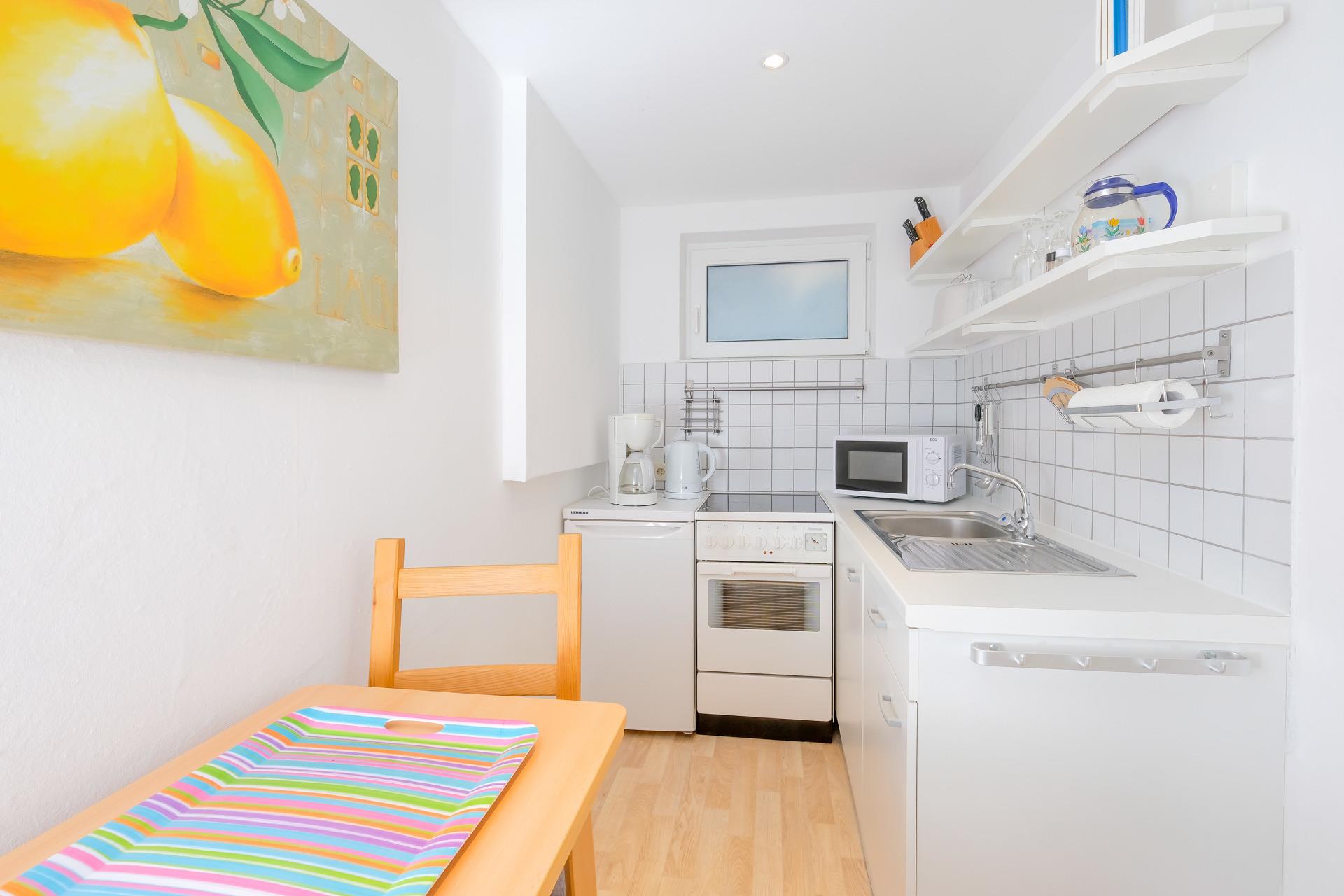 Ihnen stehen neben einem Kühlschrank auch eine Kaffeemaschine und eine Mikrowelle zur Verfügung.