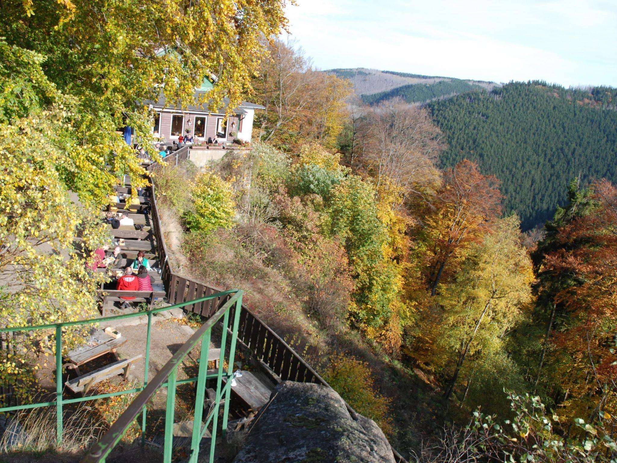Stepping outside, you'll be greeted by a spacious, covered balcony furnished with a table and chairs - perfect for enjoying meals al fresco or greeting the morning sun with views of the castle hill, surrounding mountains and the town of Bad Harzburg. The neatly kept lawn around the house offers further seating for moments of tranquillity in the greenery.