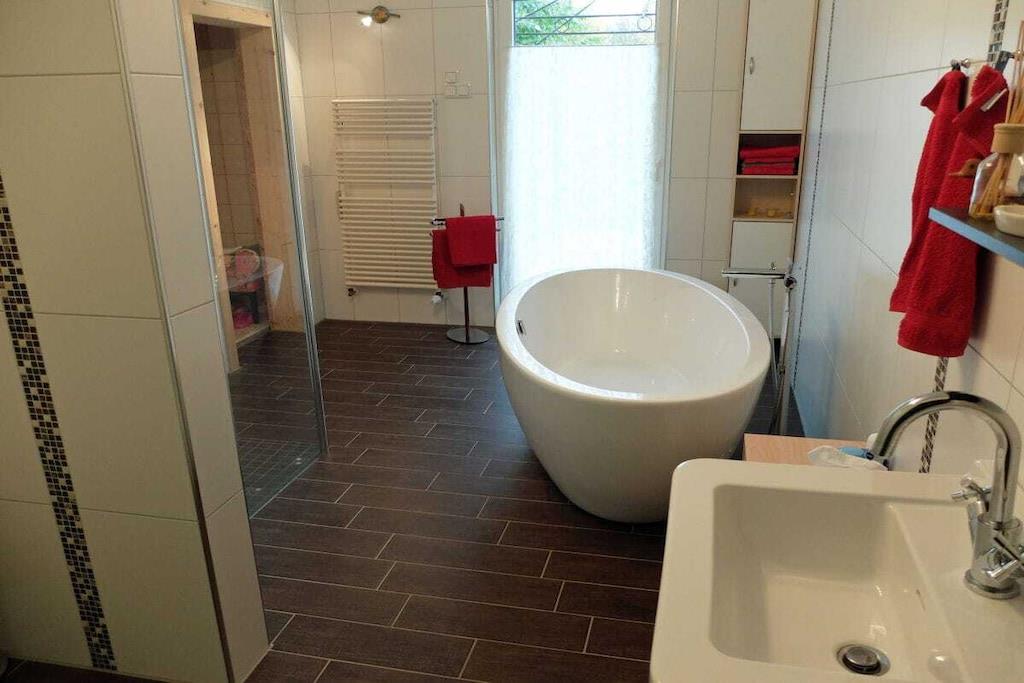 Stueetage: (Stue(, enkeltsovesofa, Fjernsyn, kakkelovn), Køkken(, tekøkken, kogeplade, elkedel, brødrister, kaffemaskine, ovn, grill, opvaskemaskine , køleskab, fryser, tremmeseng), soveværelse(, , dobbeltseng, radio), soveværelse(, , enkeltsovesofa, dobbeltseng), badeværelse(, toilet, badekar, bruser, håndvask, Håndklæder inkl.), badeværelse(, toilet, håndvask, Håndklæder inkl.)) , loungerum(sauna), Internetadgang, varme, terrasse(, havemøbler, solstole), parkering, Parasol, cykler til rådighed, strygebræt, strygejern