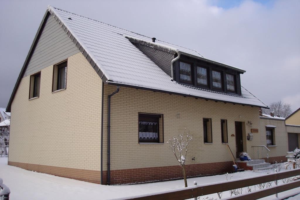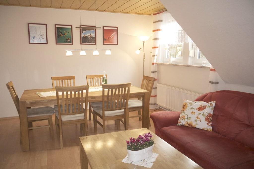 Nyd den dejligste tid på året... med 2-6 personer i vores komfortable, nyrenoverede ferielejlighed med en smagfuld stue, en stor spiseplads, 2 soveværelser (2. TV i det ene), et fuldt udstyret moderne køkken (opvaskemaskine, keramisk kogeplade, ovn) og en stor tagterrasse. (Parkering på stedet) (Wi-Fi inkluderet) Med 2-6 personer kan I bo i rolige og komfortable omgivelser, lige ved siden af skoven og 5 minutters kørsel fra Bad Harzburgs smukke boulevard med dens mange butikker og restauranter.