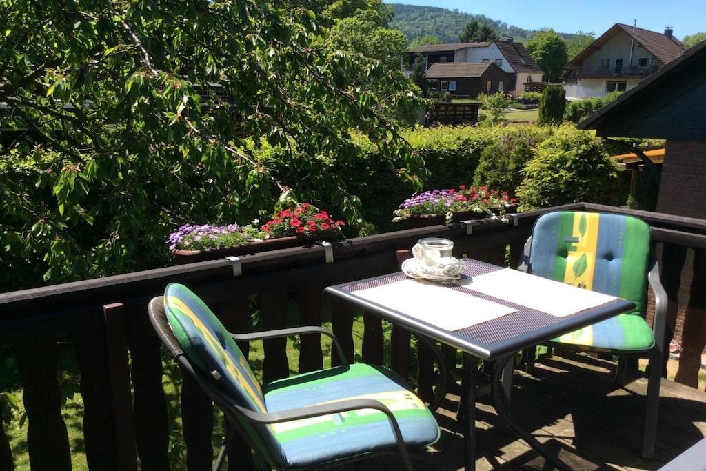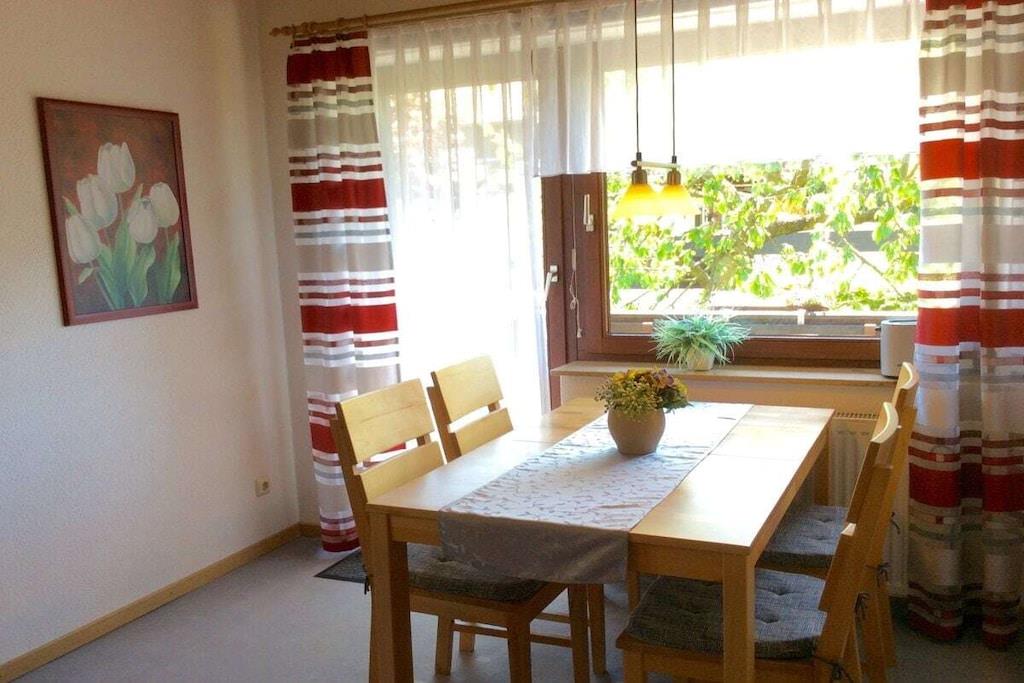 Ferielejligheden Am Wäldchen er smagfuldt og moderne indrettet. Den ligger på første sal og har separat indgang og direkte adgang til haven, som også har en privat terrasse til solbadning og grill. Opholdsstuen har en dobbeltsovesofa af høj kvalitet, der kan rumme to ekstra personer efter behov. Et LCD-farve-tv og radio sørger for afslapning. Det moderne tekøkken er fuldt udstyret til seks personer, inklusive kaffemaskine og brødrister. Du vil tilbringe masser af tid i spiseområdet med et udtræksbord foran et sydvendt vindue, hvorigennem du kan nyde udsigten over bjergene, selv ved morgenmaden. Et dobbeltværelse med justerbar hoved- og fodstøtte inviterer dig til at putte dig sammen og nyde den absolutte fred og ro i Harzen. Et tv er tilgængeligt for natteravne. I det nye brusebad med håndvask, bruser og toilet vil du hilse morgenen velkommen med et smil. På den sydvendte balkon med havemøbler kan du nyde de sidste solstråler, selv om aftenen. Jeres børn vil helt sikkert have det sjovt i vores have, i træhuset, i sandkassen eller på gyngerne, mens I kan bearbejde dagens mange indtryk i fred og ro på den sydvendte altan. Ældre børn kan finde et bordtennisbord som et alternativ. Jeres firbenede ven er velkommen til at bo hos os efter anmodning. Der er parkering til jeres bil.
