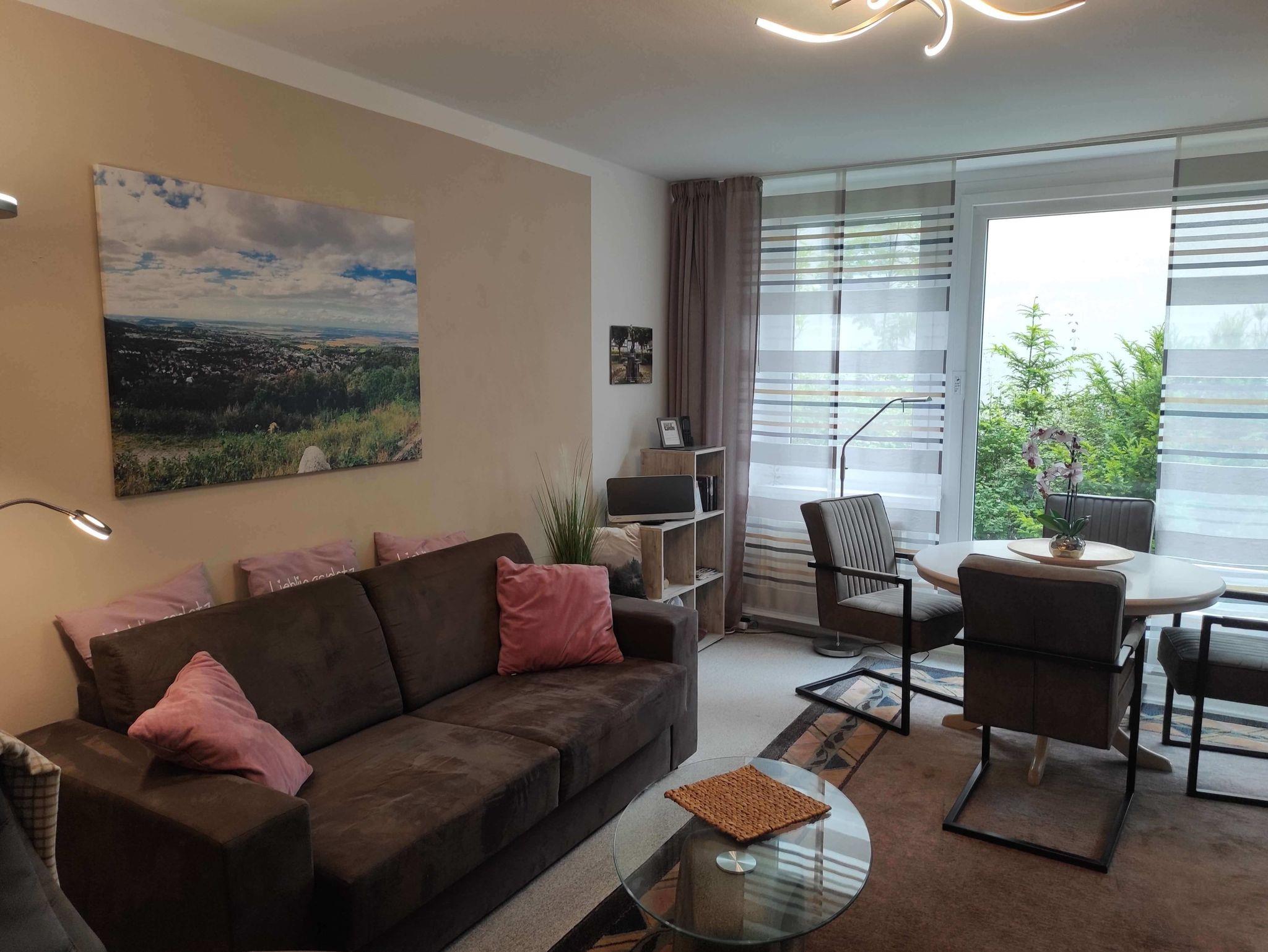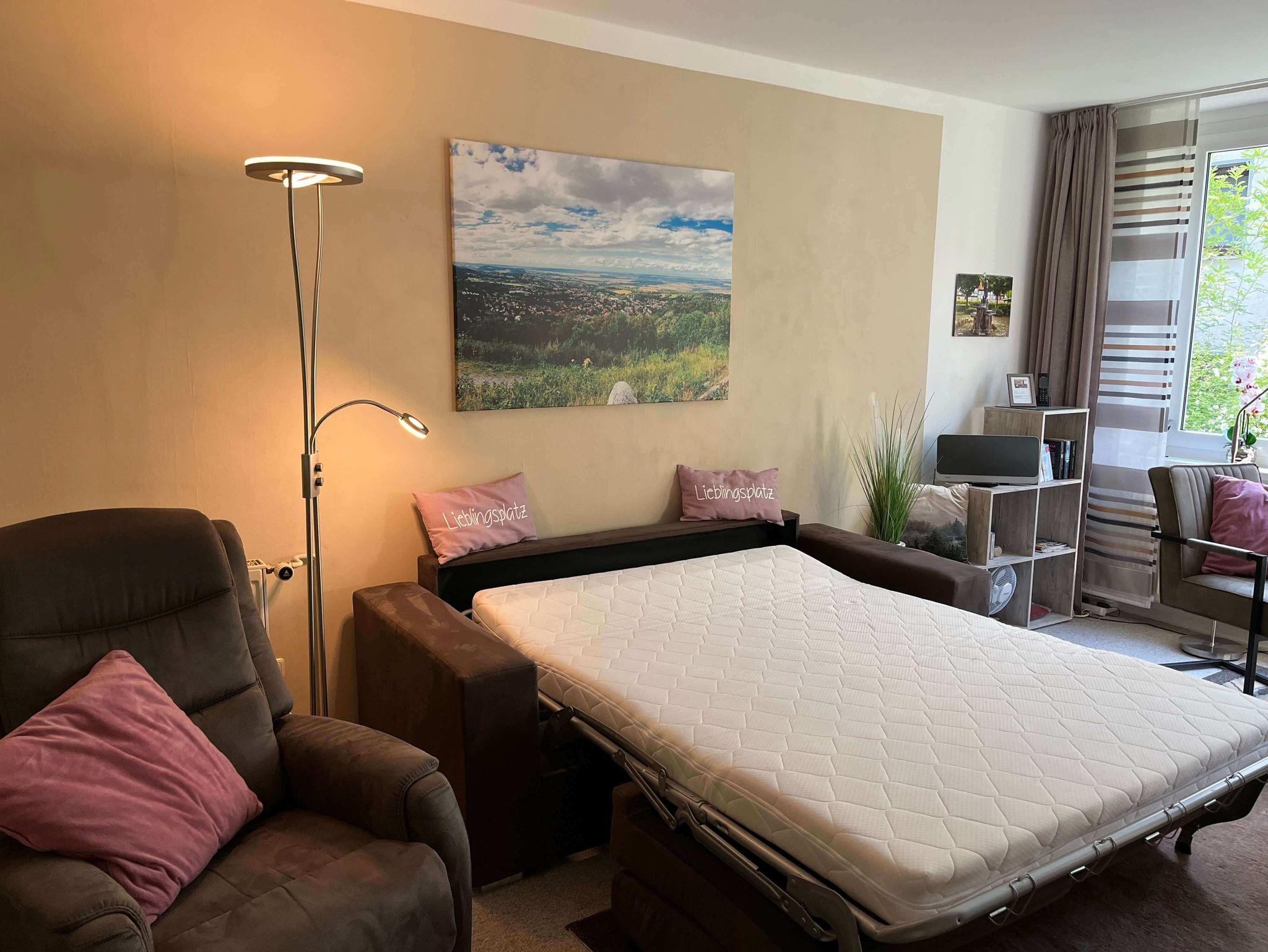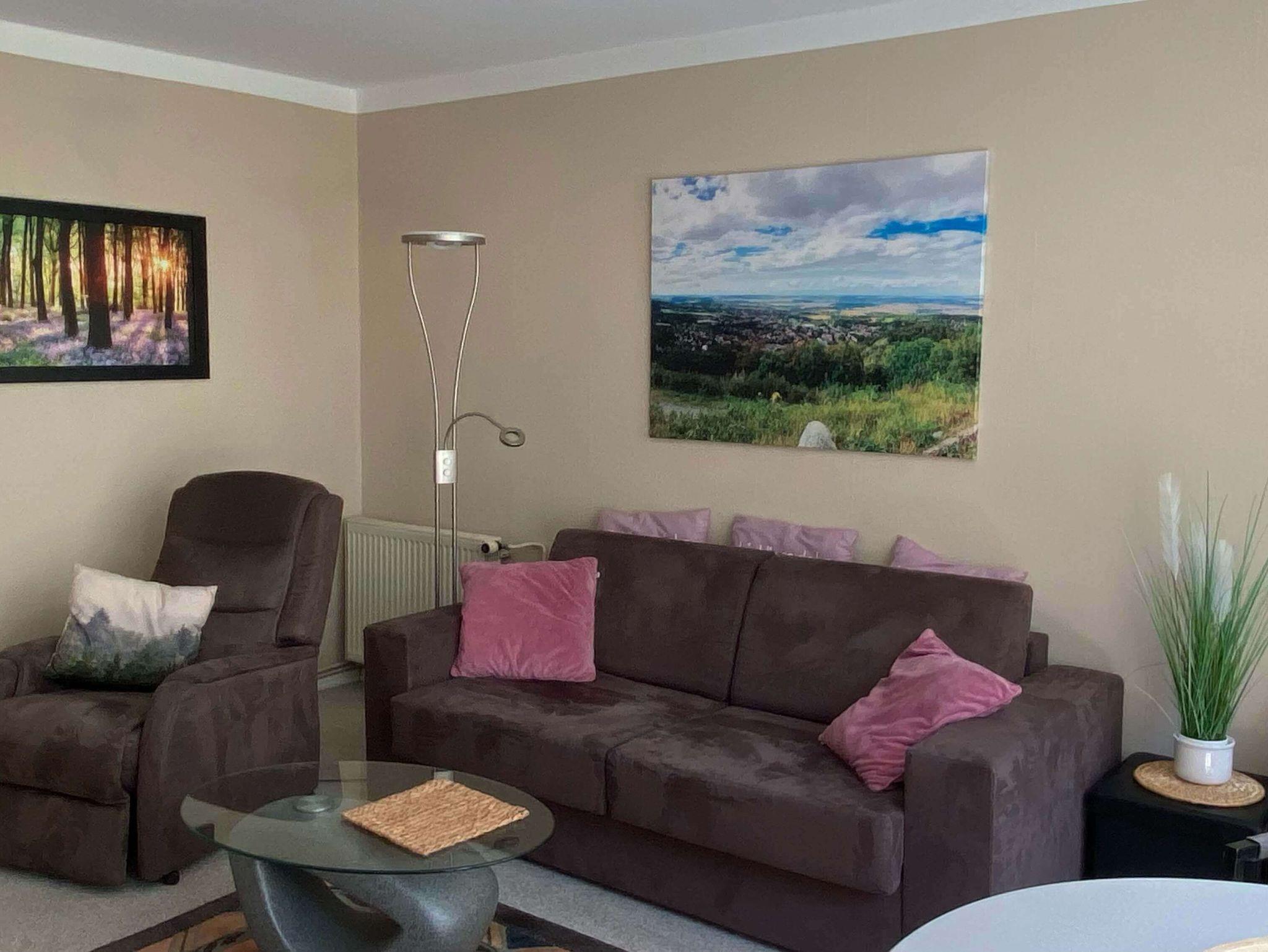 Im Wohnzimmer lädt Sie ein super bequemer Fernsehsessel und Couch, die zu einem Schlafsofa (150x190 cm) ausgezogen werden kann, ein, um Musik zu hören, ein Buch zu lesen oder einen Film zu schauen und abzuschalten. Ein schönes Essen oder etwas spielen können Sie am Esstisch vor dem großen Fenster.