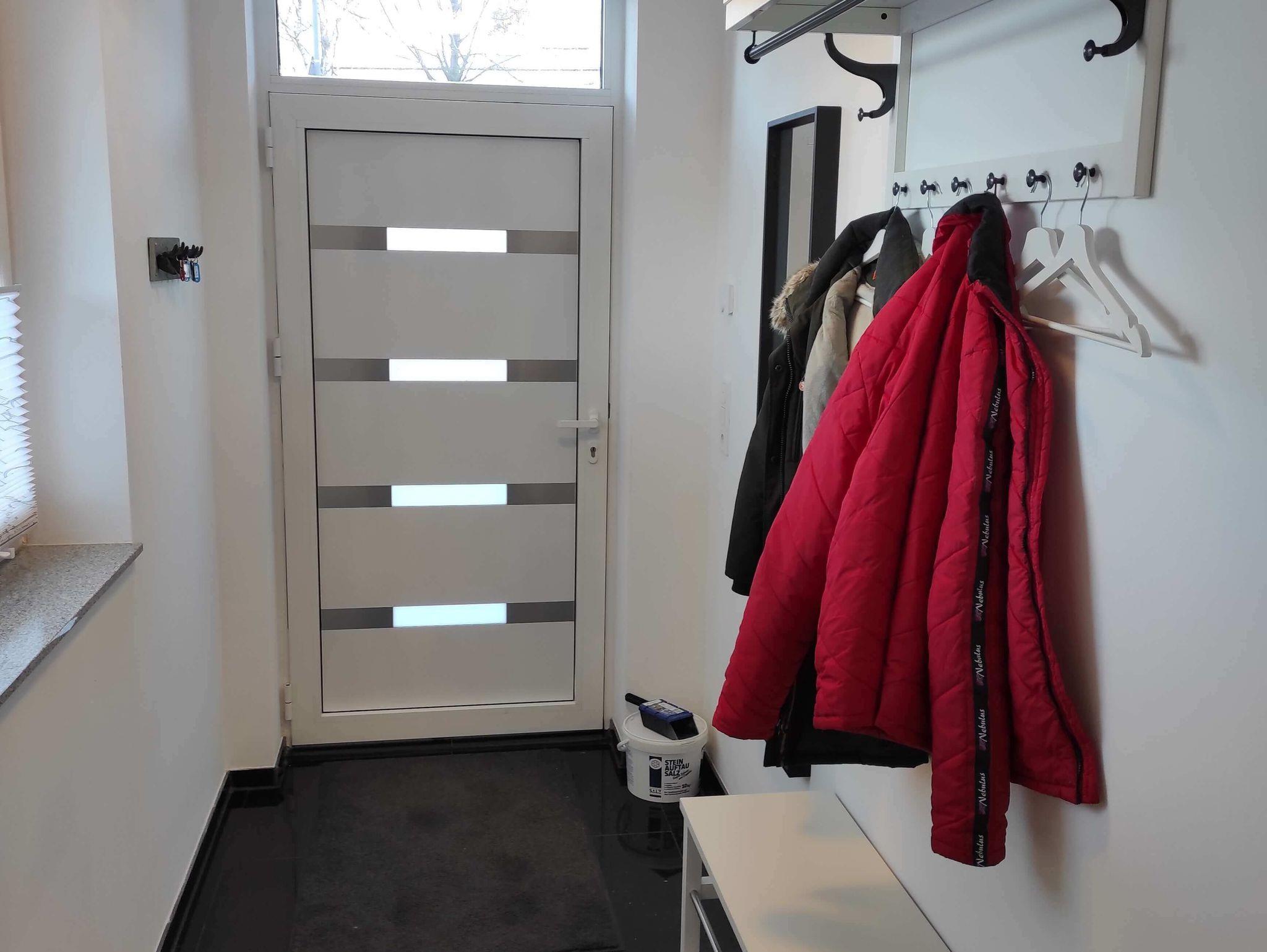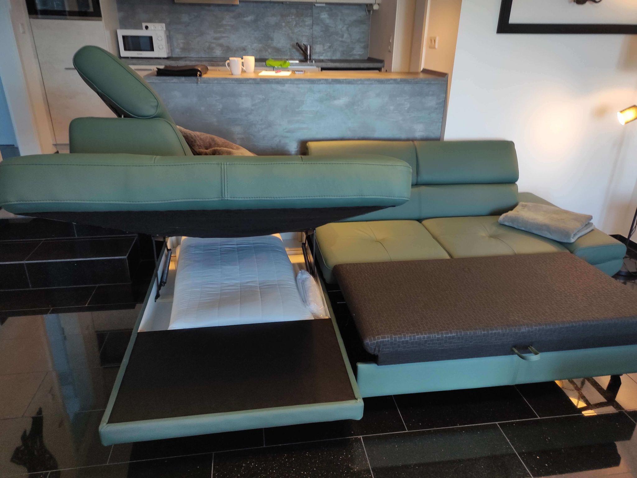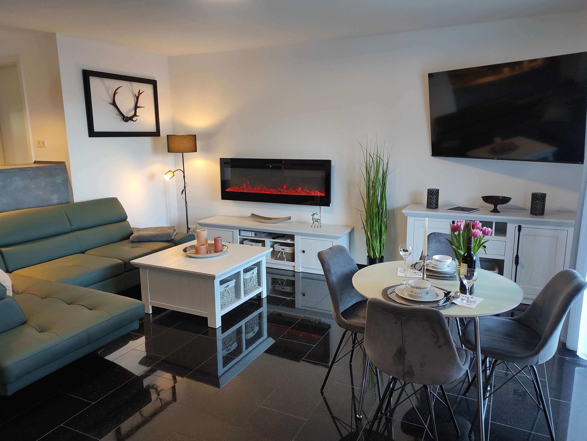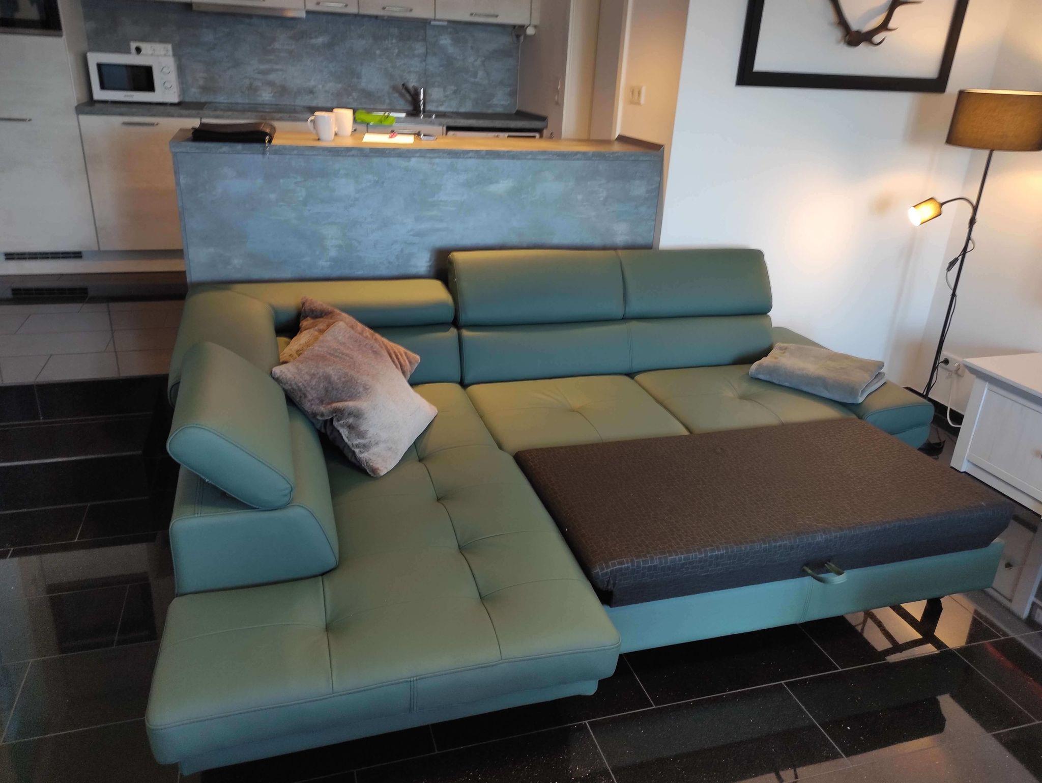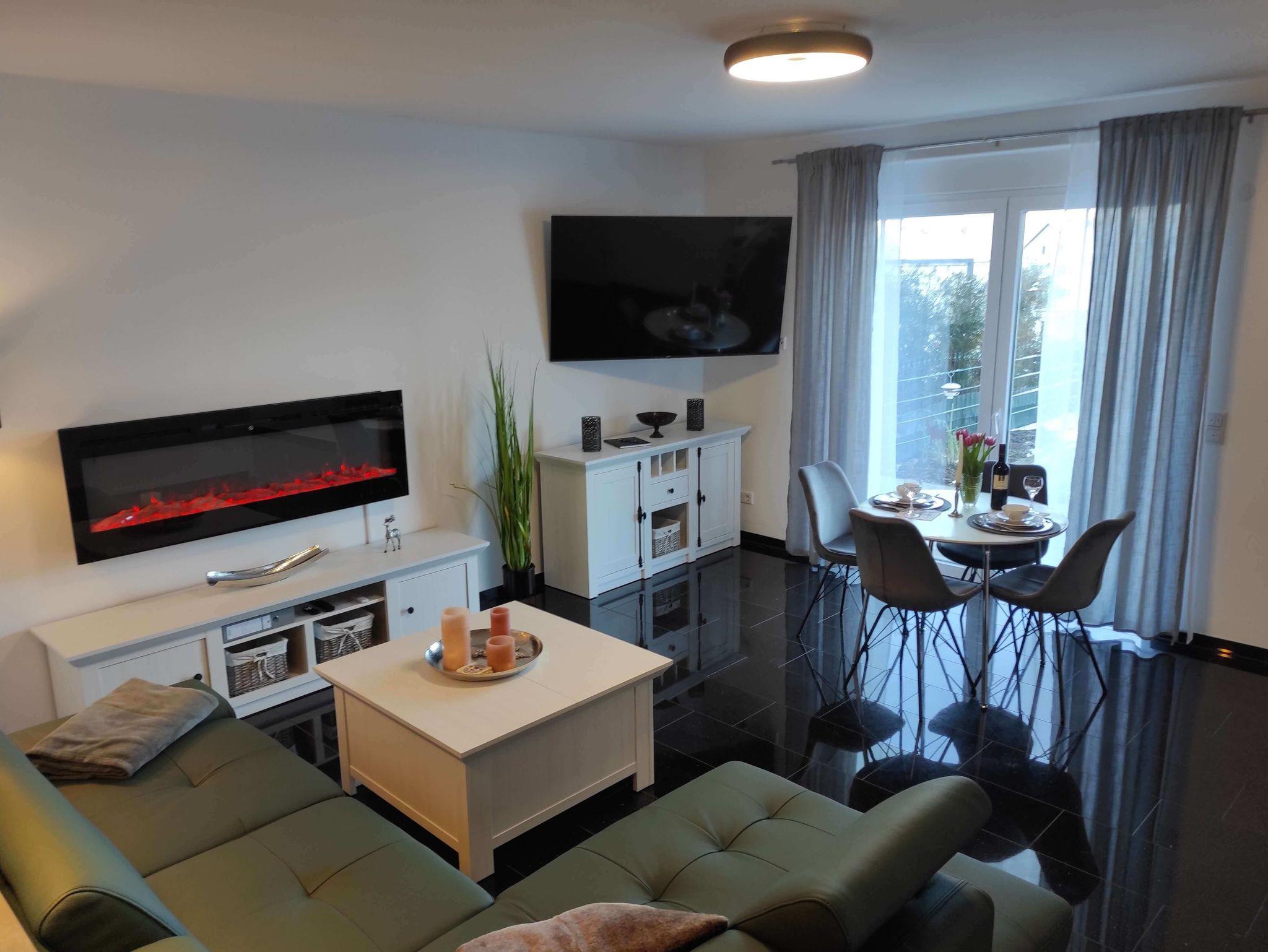 Im Wohnbereich befindet sich ein hochwertiges Lederschlafsofa mit einer ausziehbaren Liegefläche von 130 x 200 cm, der dazugehötige Schlaftopper befindet sich im Bettkasten des Sofas. Ein Elektrokamin für gemütlich ausklingernde Abende, sowie ein 65 Zoll großer Fernseher rundet die Einrichtung des Wohnzimmers ab. Für die gemeinsamen Mahlzeiten befindet sich der Esstisch mit 4 Stühlen vor dem Terrassenfenster.
