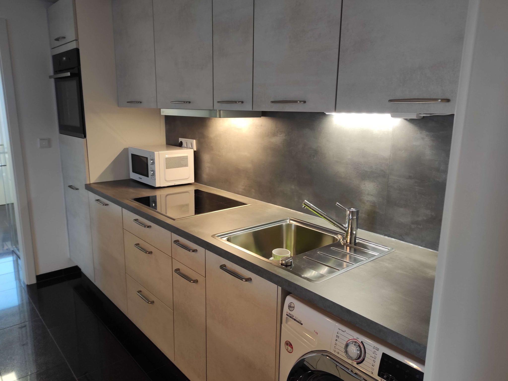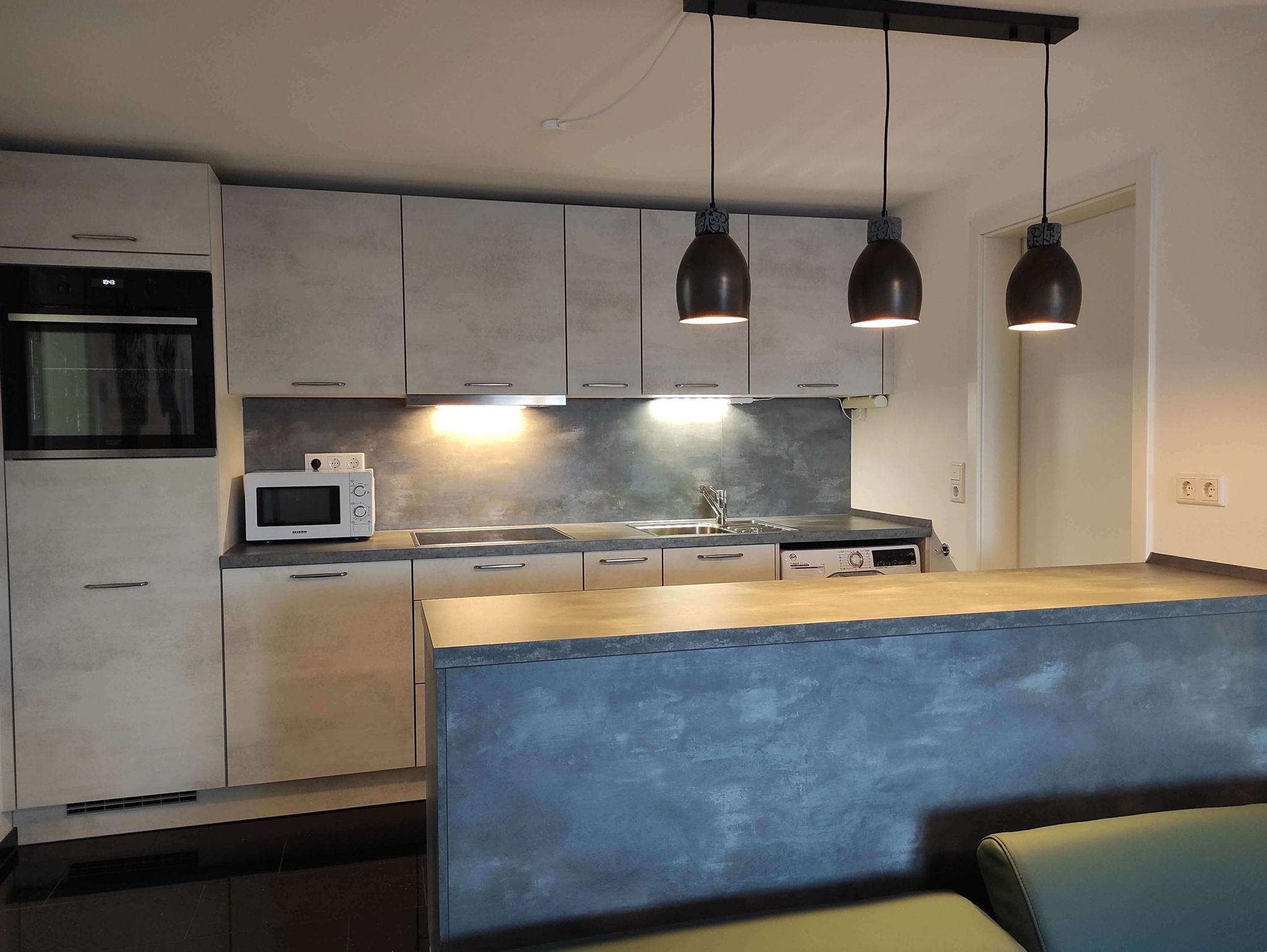 Die offene, bestens ausgestattete Küche erreichen Sie über 2 Treppenstufen. Zur hochwertigen Aussstattung gehören u. a. eine Kaffeemaschine, eine Tschibo Caffissimo, eine Mikrowelle, ein Induktionskochfeld, ein Ofen, eine Waschmaschine, ein Wasserkocher, ein Toaster etc...