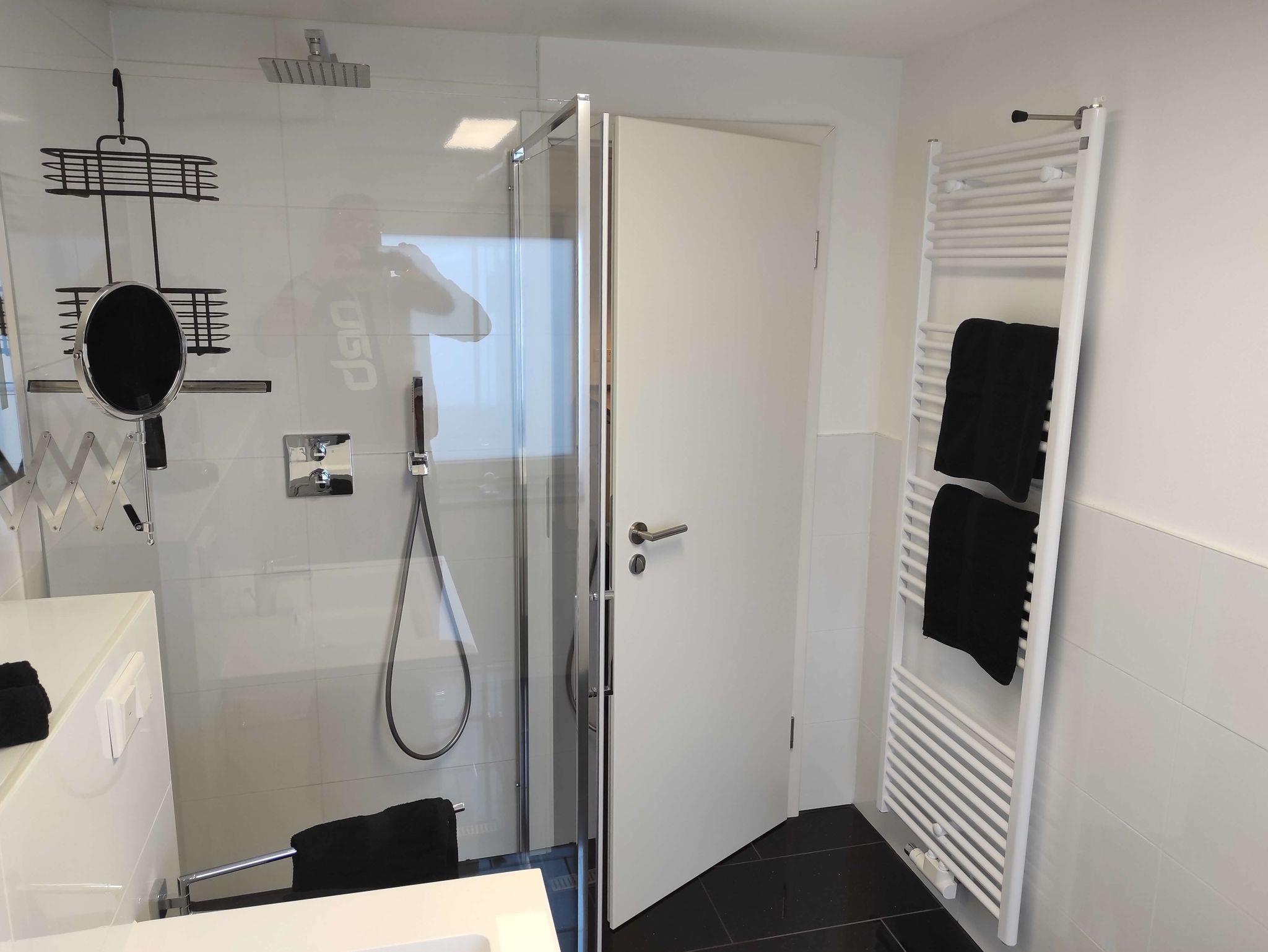 Im Bad befindet sich eine ebenerdige Dusche, ein Vergrößerungsspiegel und ein Fön.