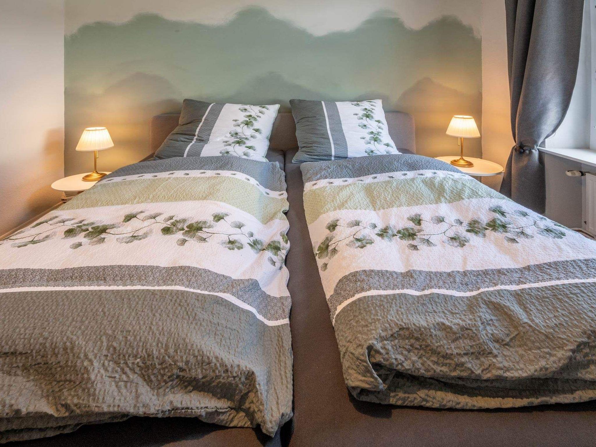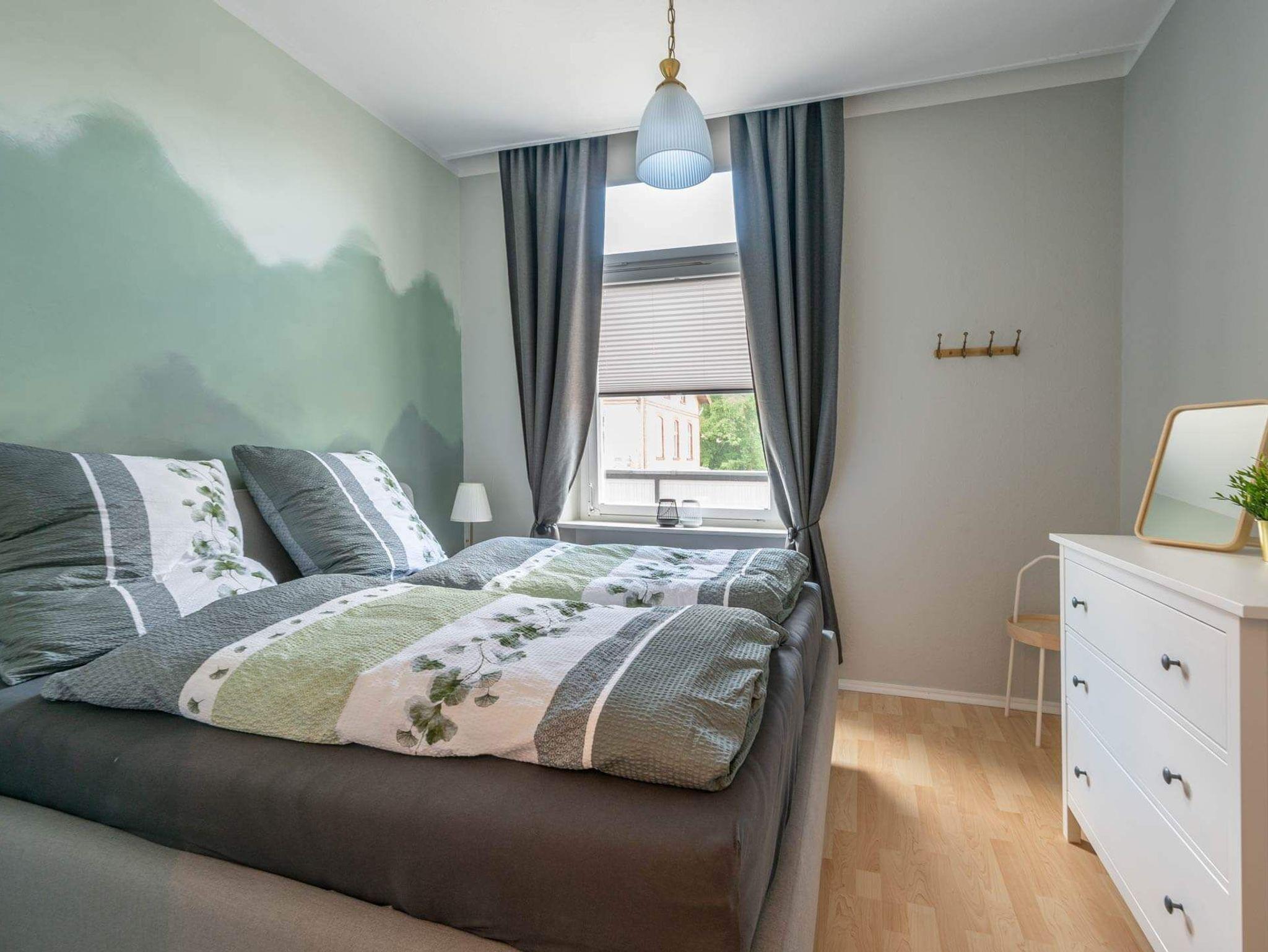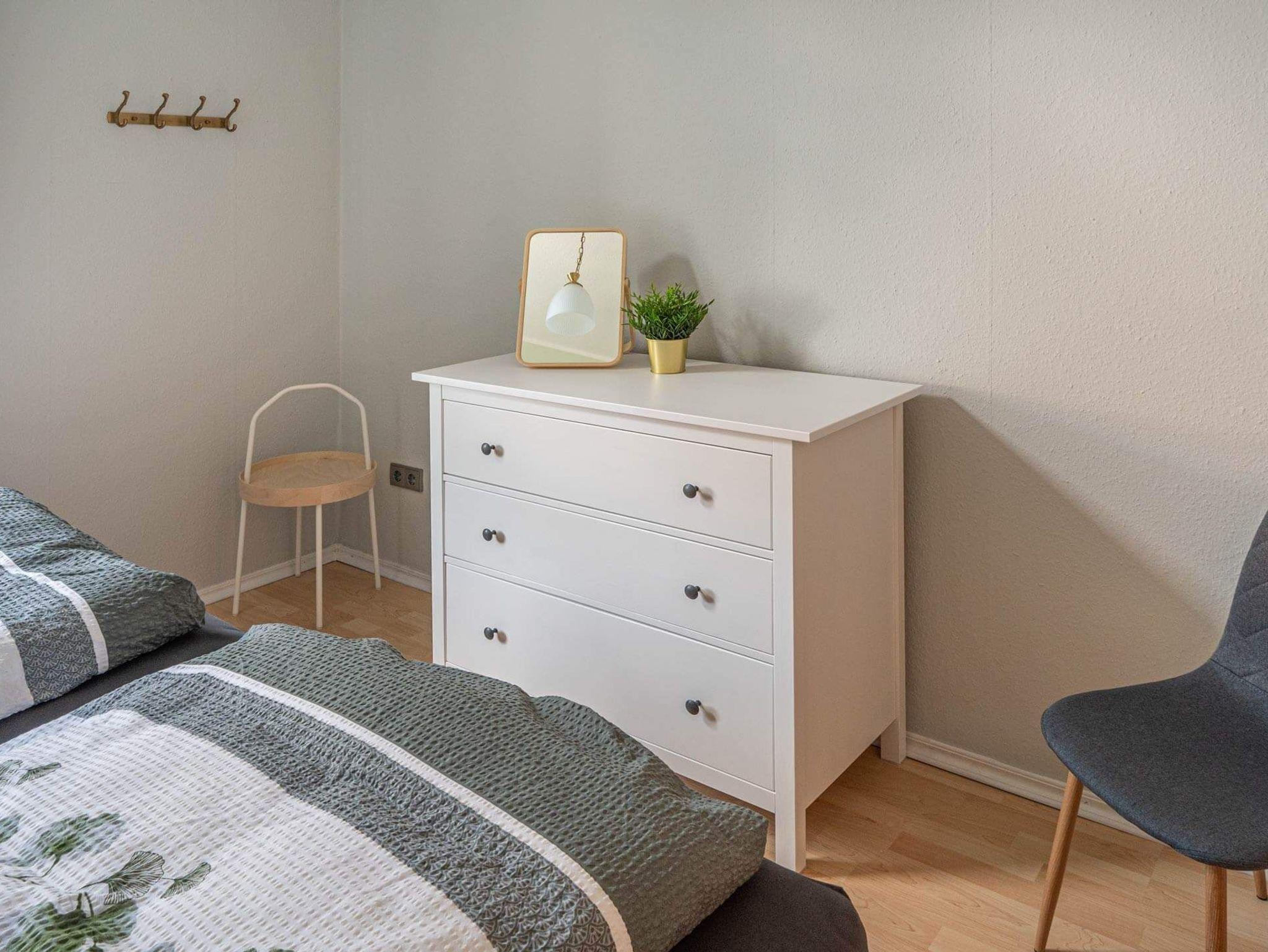Im Schlafzimmer finden 2 Personen im 1,80 m Doppelbett auf hochwertigen Matratzen ihre Ruhe. Genügend Stauraum in moderner Kommode oder großem Einbauschrank ist vorhanden.