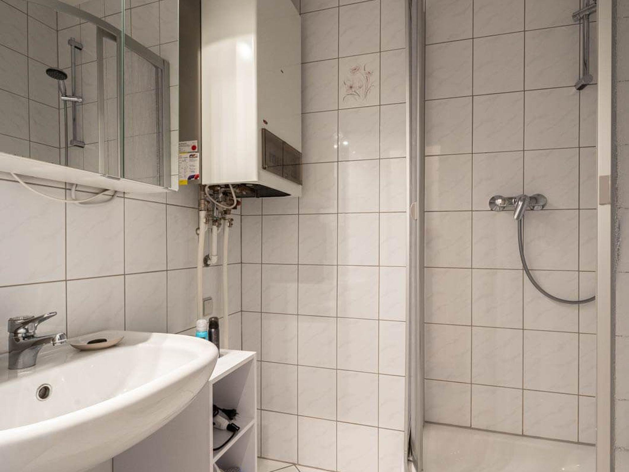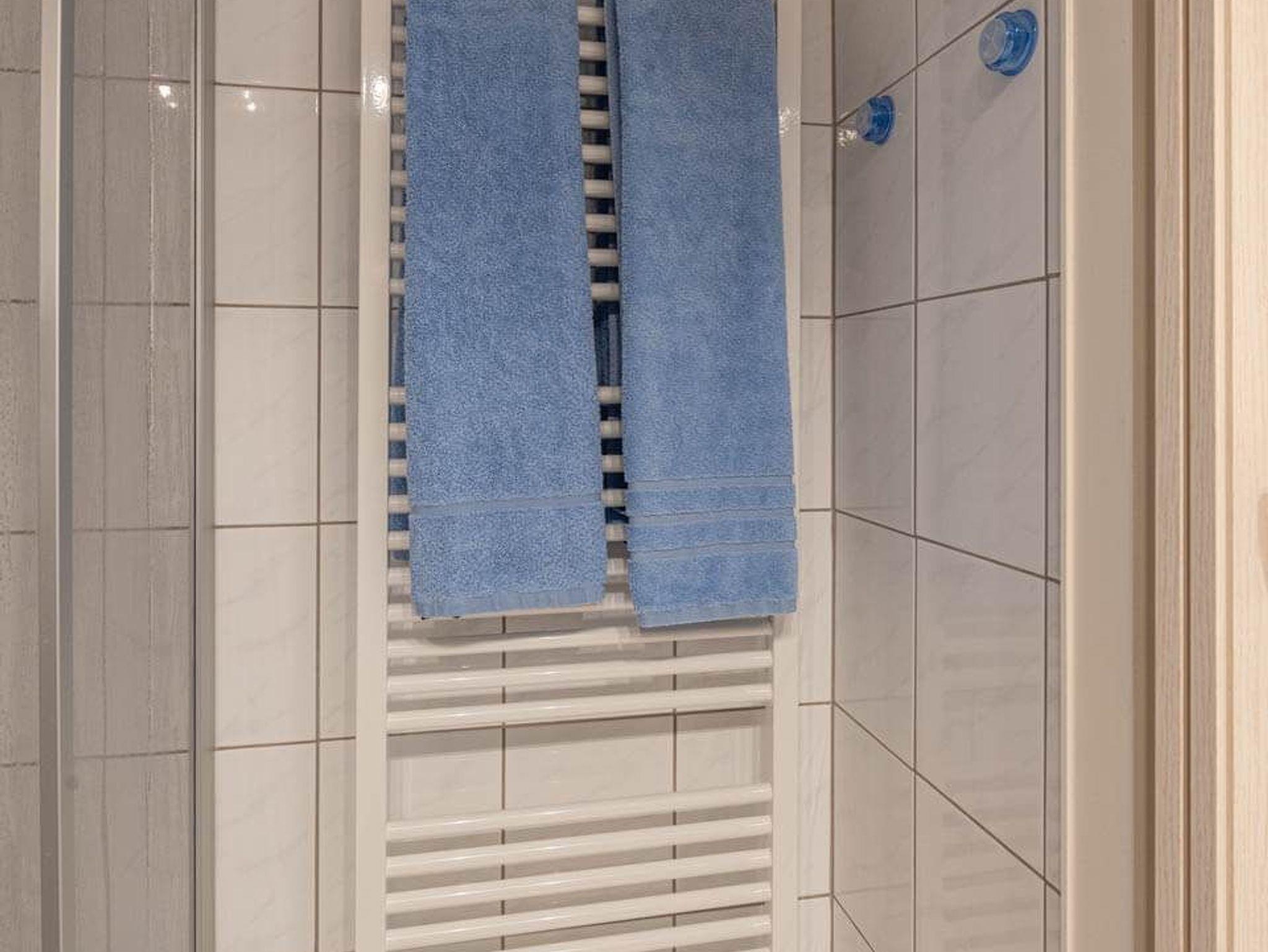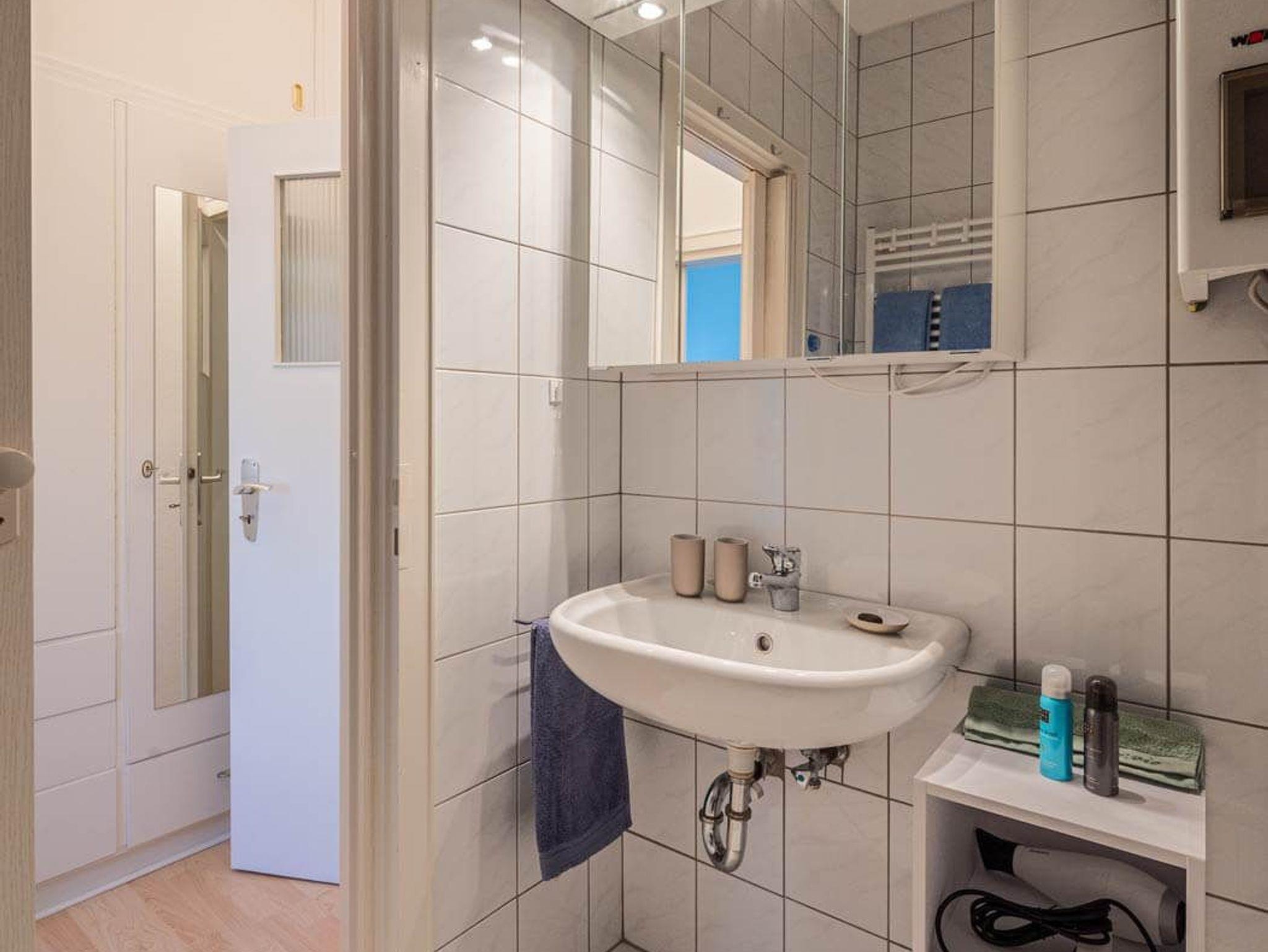 Das funktionale Duschbad mit Föhn und die separate Toilette in schlichtem weiß, runden das Bild ab.