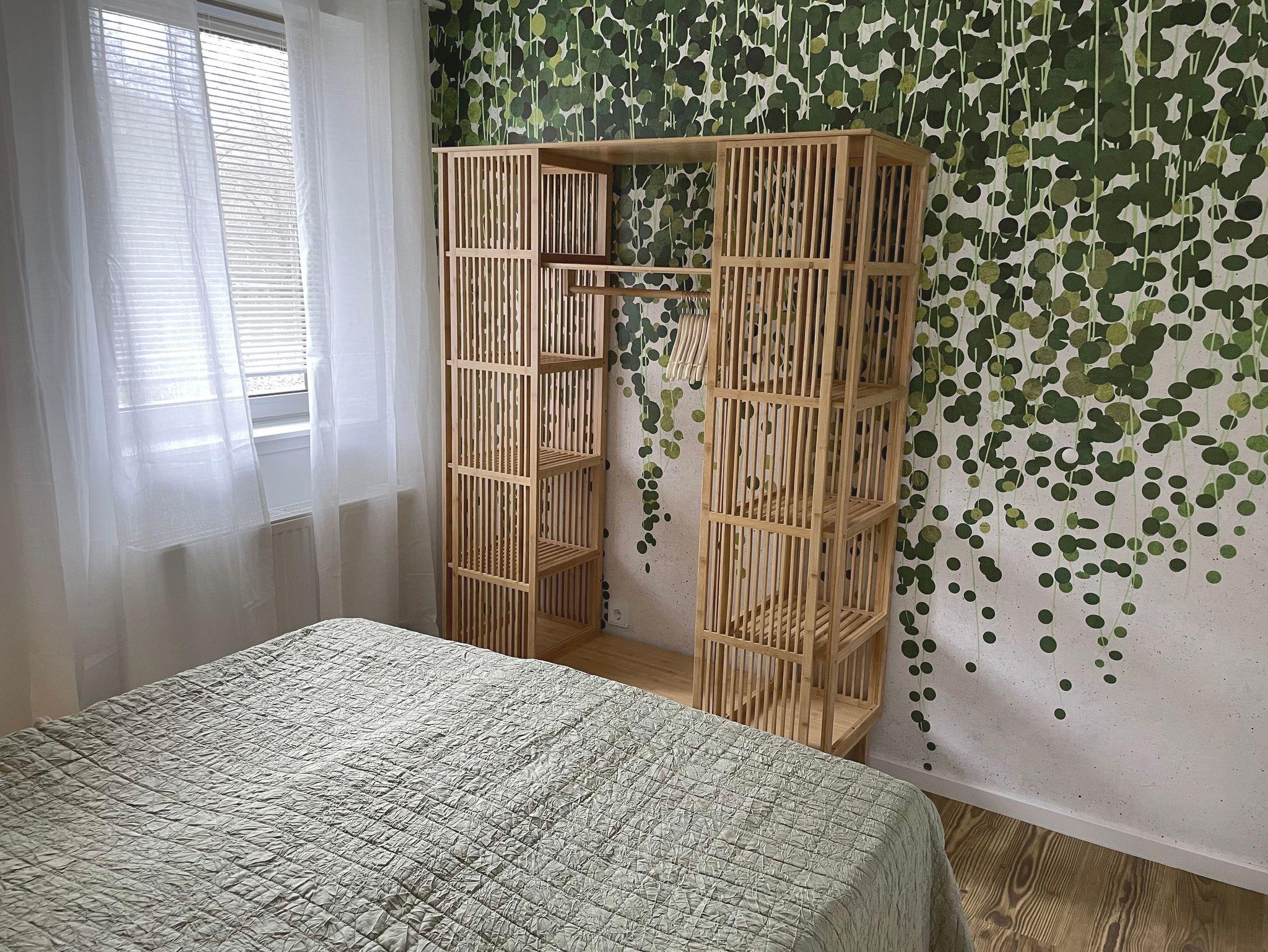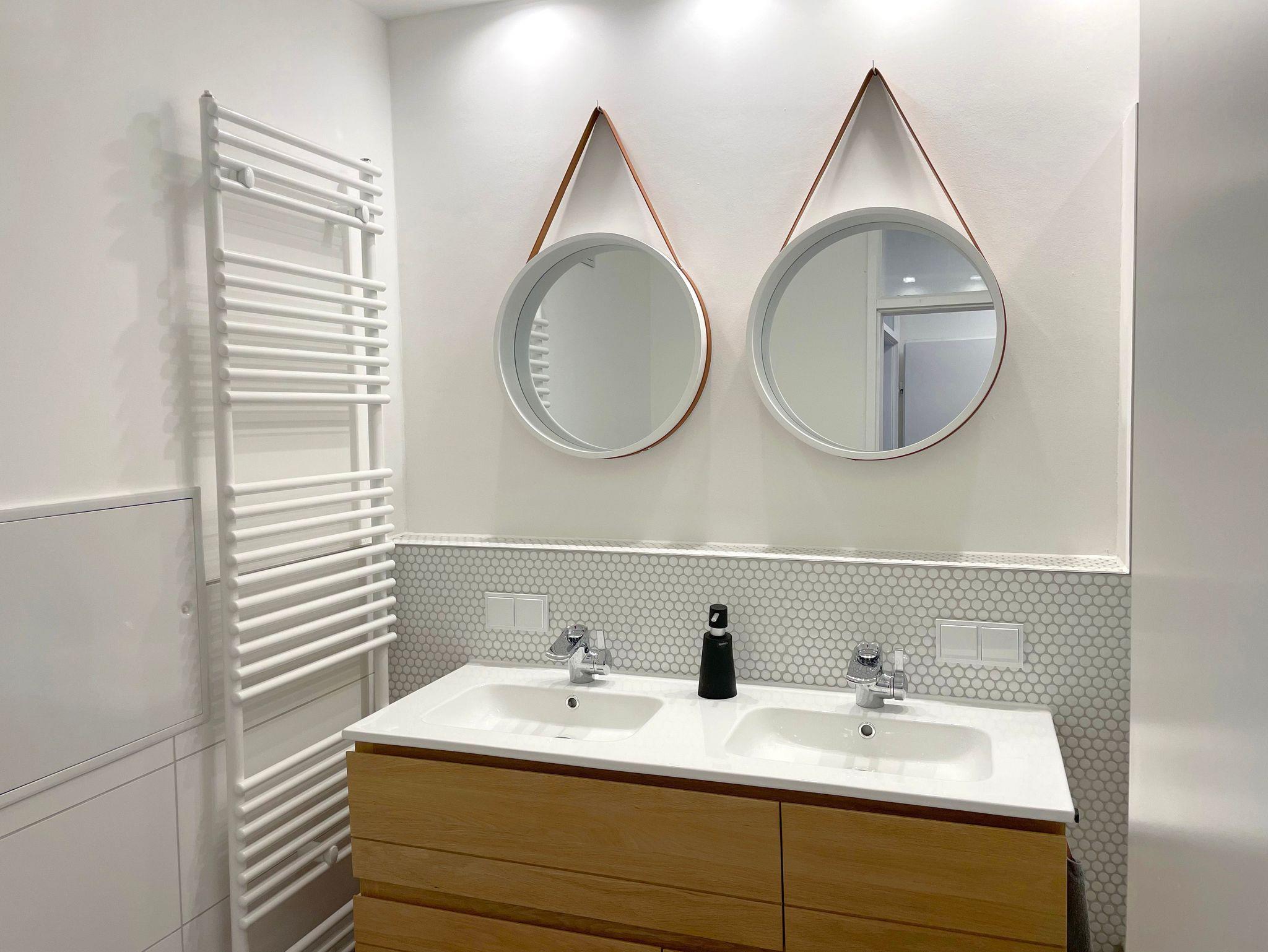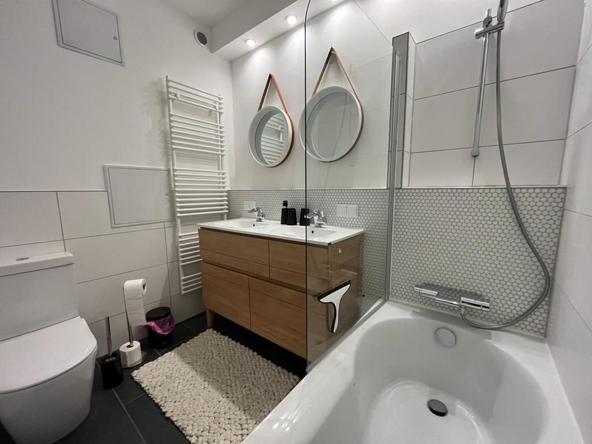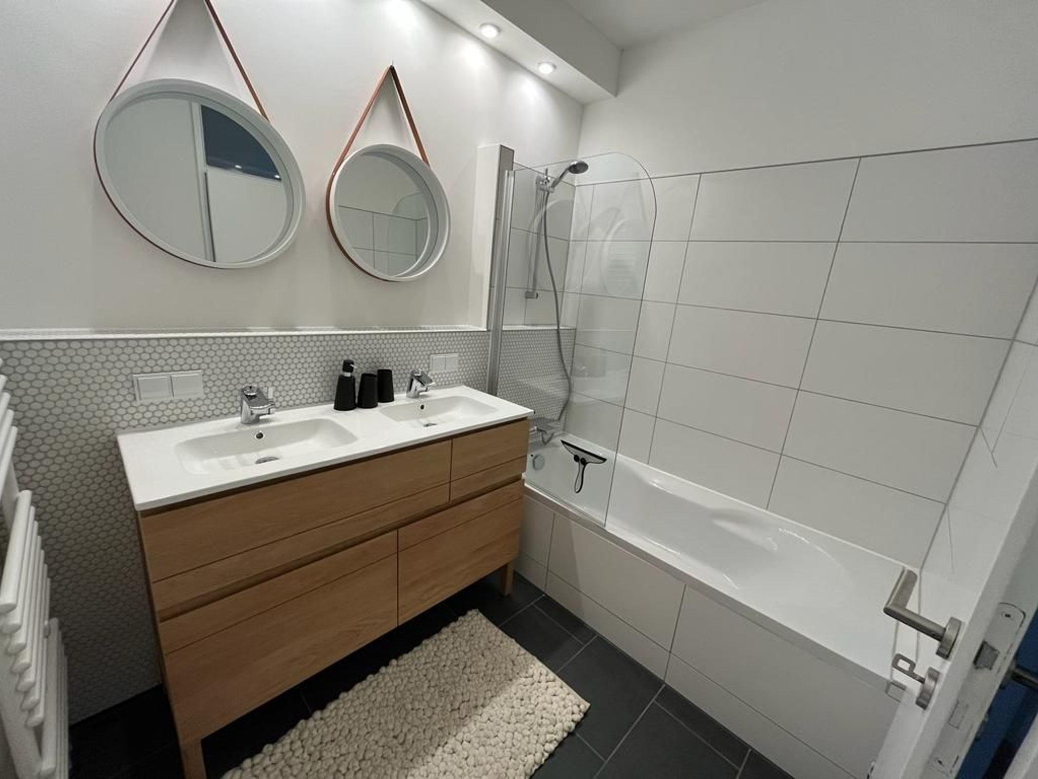 Hinter dem Wohnzimmer ist ein kleiner Flur, von dem die beiden Schlafzimmer (jeweils mit Doppelbett, keine Einzelbetten!) und das große Bad abgehen. Wer sich am Tag sportlich ausgetobt hat, wird es zu schätzen wissen, dass man hier ein entspannendes Bad nehmen kann. Ein echter Hingucker sind die Wasserhähne, die sofort Spa-Atmosphäre verströmen. Das etwas kleinere Bad gegenüber der Küche bietet noch eine weitere Dusche. Das größere Schlafzimmer (180x200 Bett) verfügt über einen separaten Zugang zum Balkon, der die halbe Wohnung umschließt … und die vielleicht niedlichsten Nachtleuchten der Welt. Hier kann man morgens im Bett sitzend den Blick ins Grün der umliegende Bäume schweifen lassen und bei geöffneter Tür den benachbarten Bach plätschern und den Vögeln beim Schwatzen zuhören ? so ruhig ist es hier.