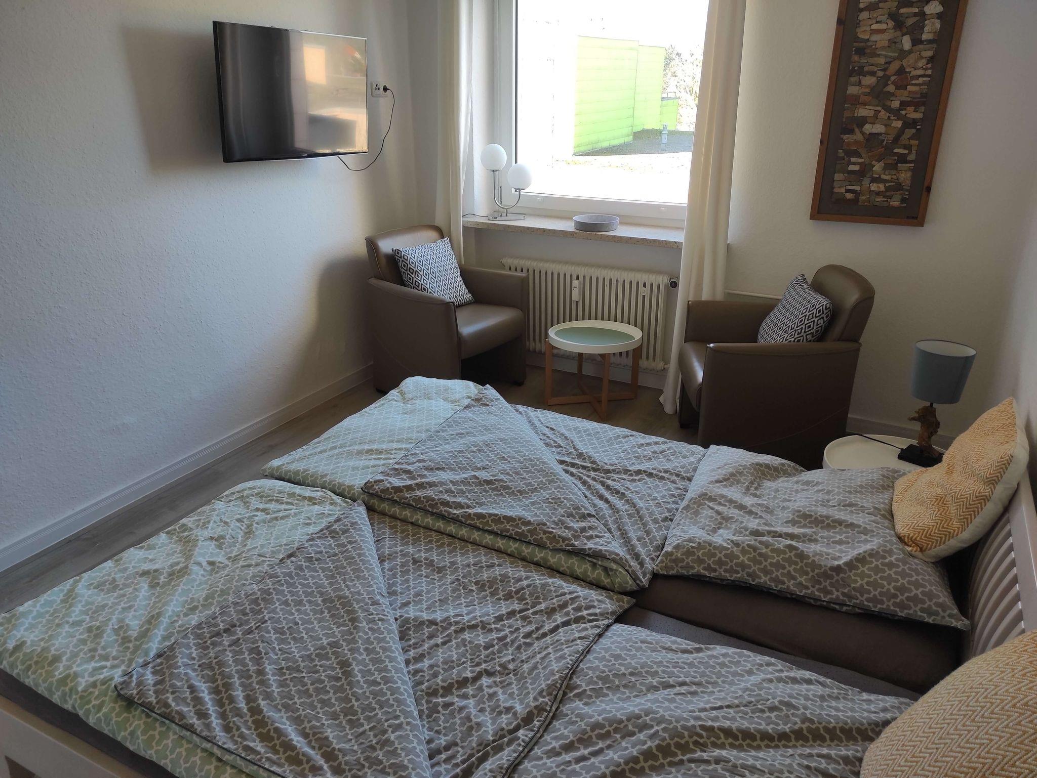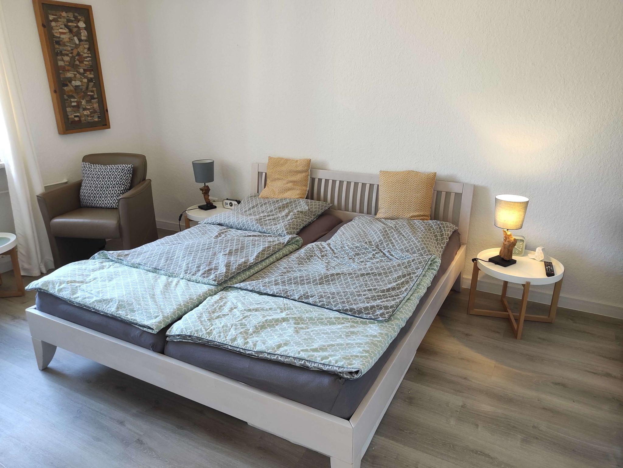 Das geräumige 21qm große Schlafzimmer verfügt über ein 1,8 x 2m großes Doppelbett. Ein Fernseher und eine bequeme Sitzecke mit zwei Sesseln bietet einen zusätzlichen Rückzugsraum zum Lesen, Fernsehen und Entspannen.