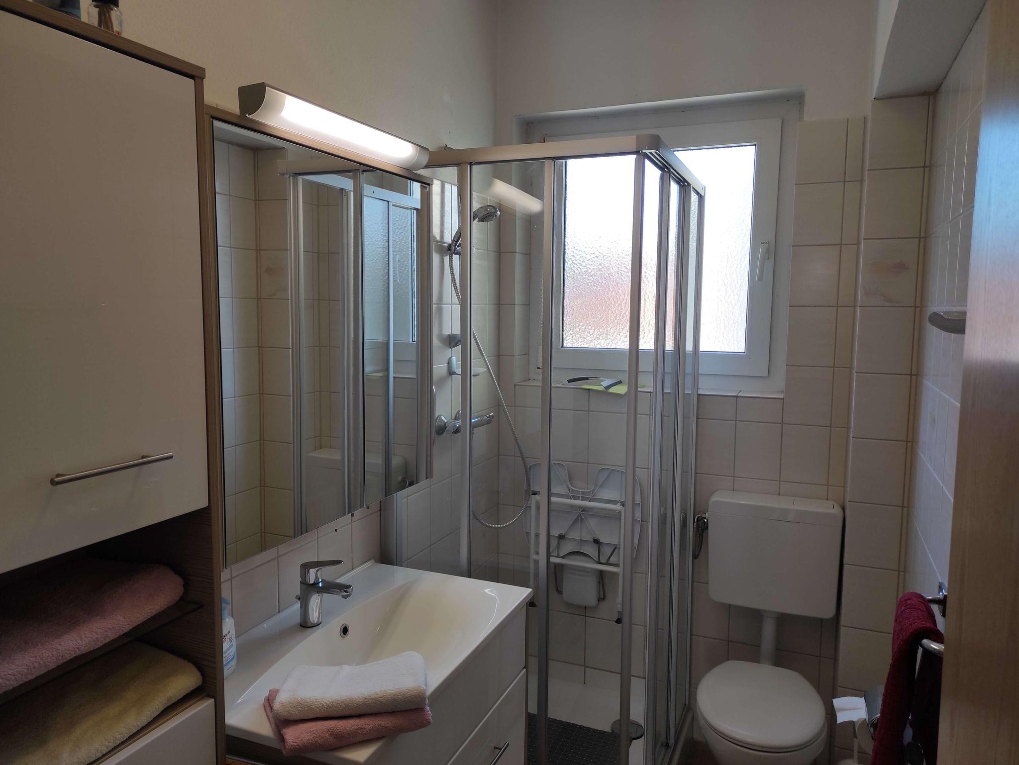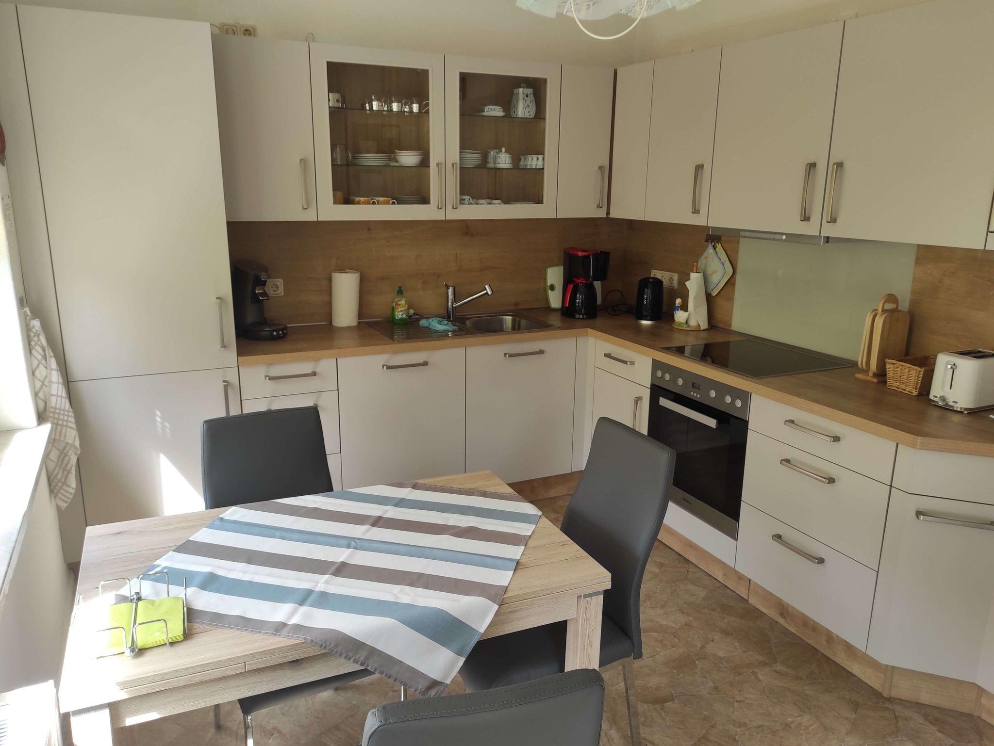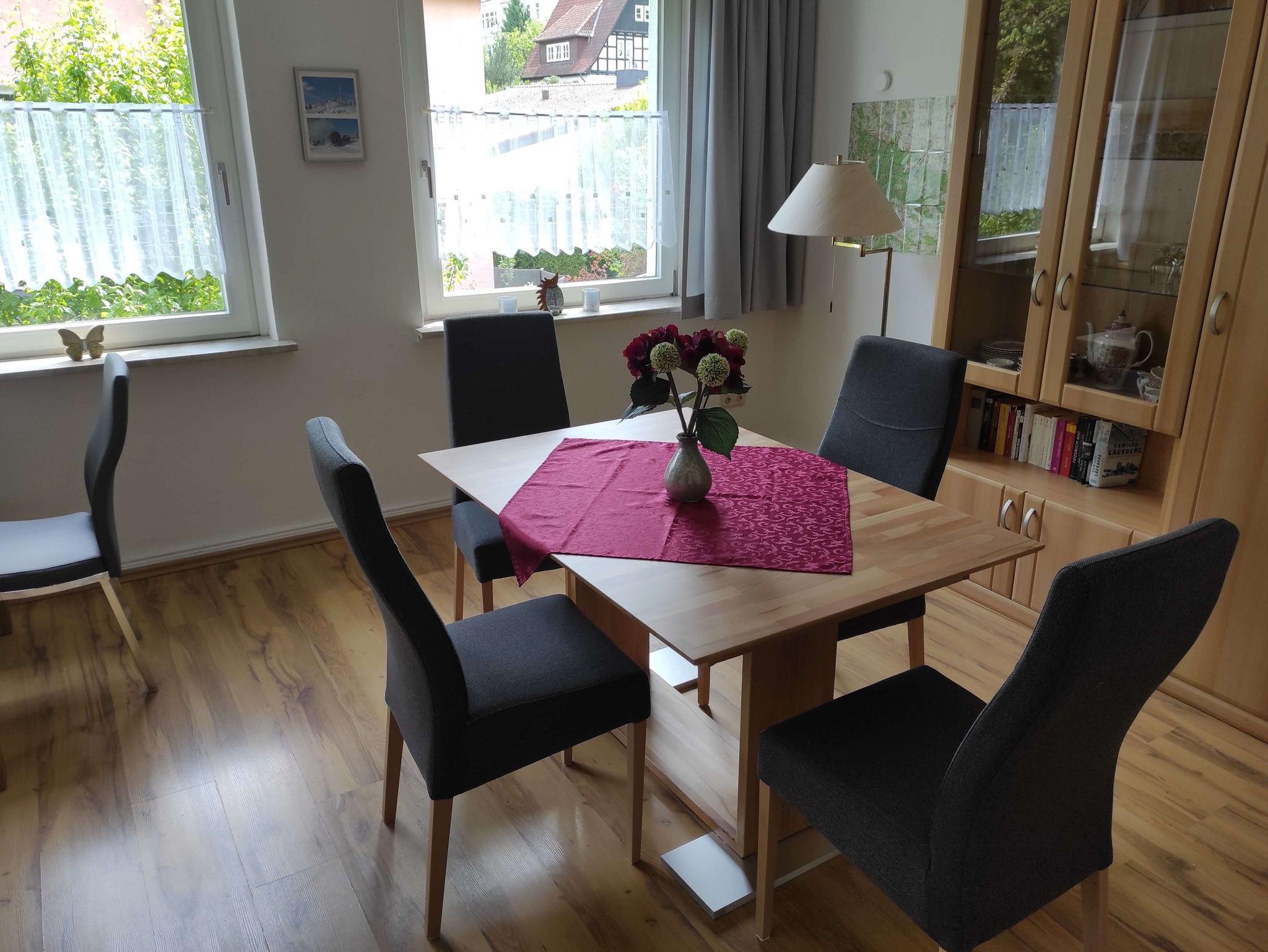 Die Ferienwohnung liegt im 1. Obergeschoss. Sie hat 3 helle, freundlich eingerichtete Zimmer. Sie verfügt über ein Schlafzimmer mit Doppelbett. Eine zusätzliche Schlafgelegenheit bietet das Schrankklappbett (0,90 x 2m) das sich im Esszimmer befindet.