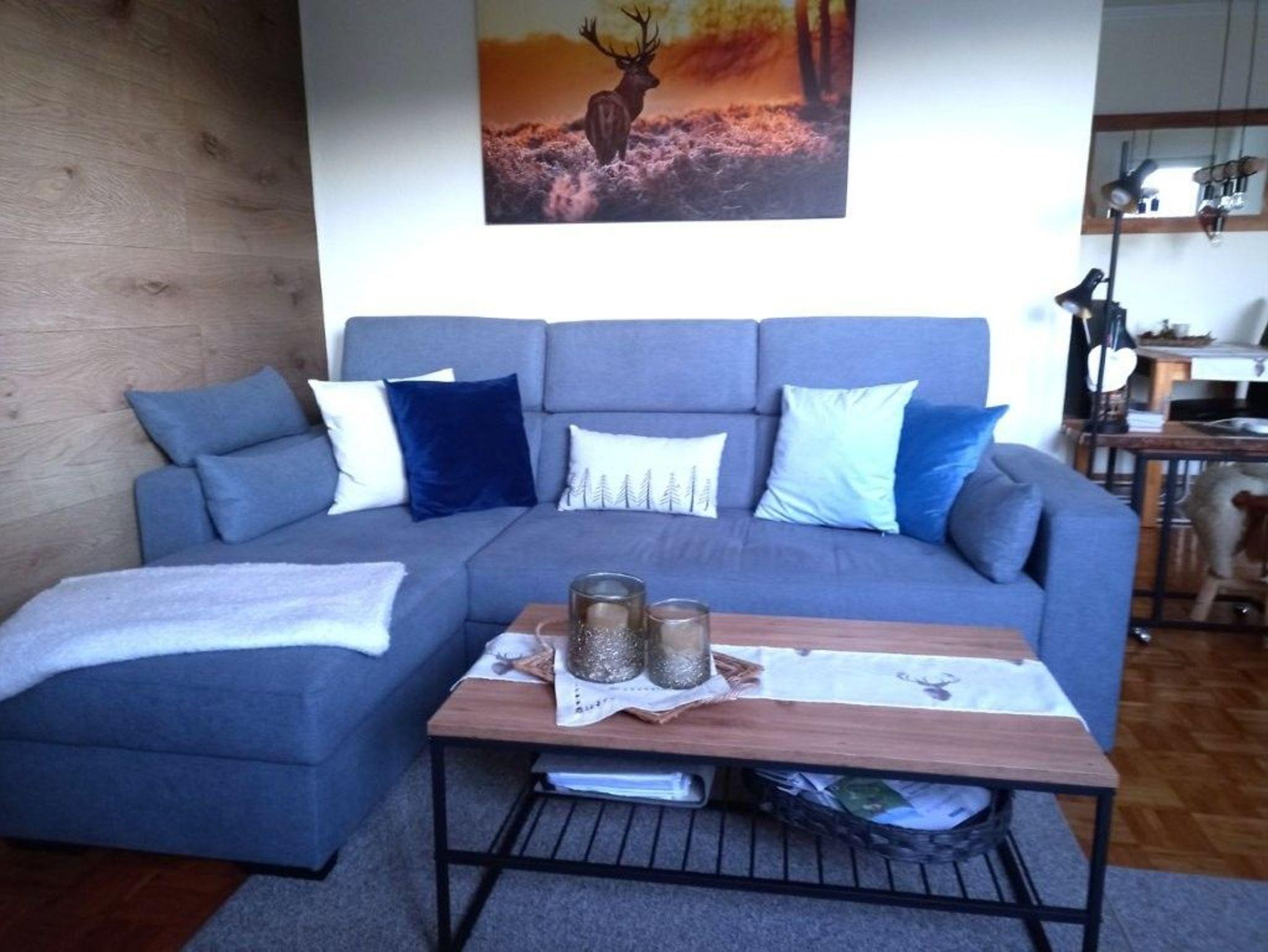 Im Wohnbereich - direkt vor der Küche - steht ein Esstisch mit 4 Stühlen. Eine Eckcouch mit Schlaffunktion und Bettkasten für einen dritten Gast ist vorhanden. Die Sessel vor dem großen Panoramafenster (neu seit der Sanierung) laden Sie herzlich ein - Sie lesen etwas, genießen ein Getränk oder schauen einfach nur zum Fenster hinaus... Ein Flachbildschirm, eine Radio-Musik-Anlage mit USB-Anschluss ist ebenfalls vorhanden.
