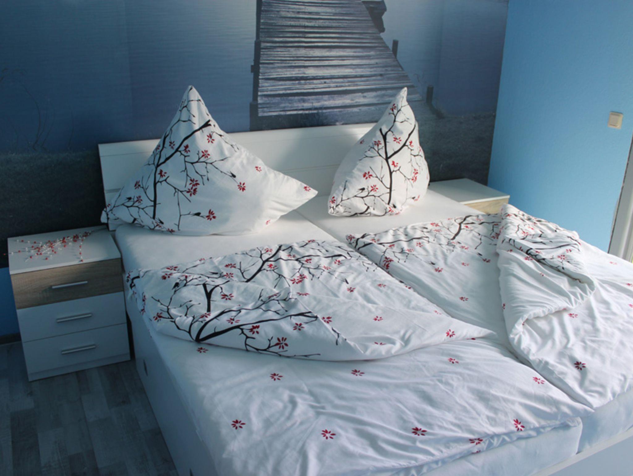 Ausstattung: Separater Schlafraum mit Doppelbett, Aufenthaltsbereich und Küchenbereich mit vierflammigem E-Herd und Backofen, Terrasse, TV(Kabel), Radio mit CD, separates Bad mit Dusche, Aufbettung für eine weitere Person möglich.