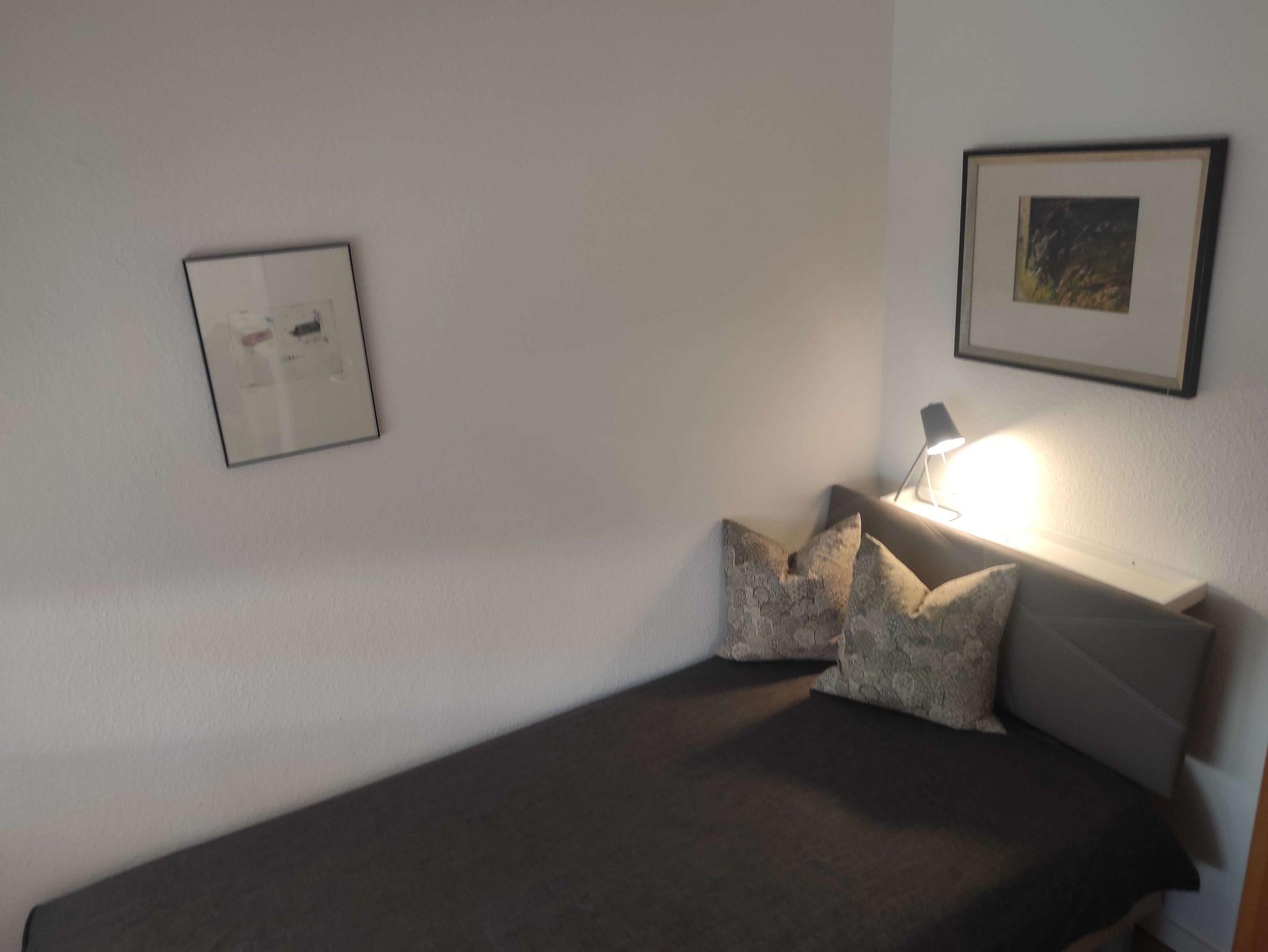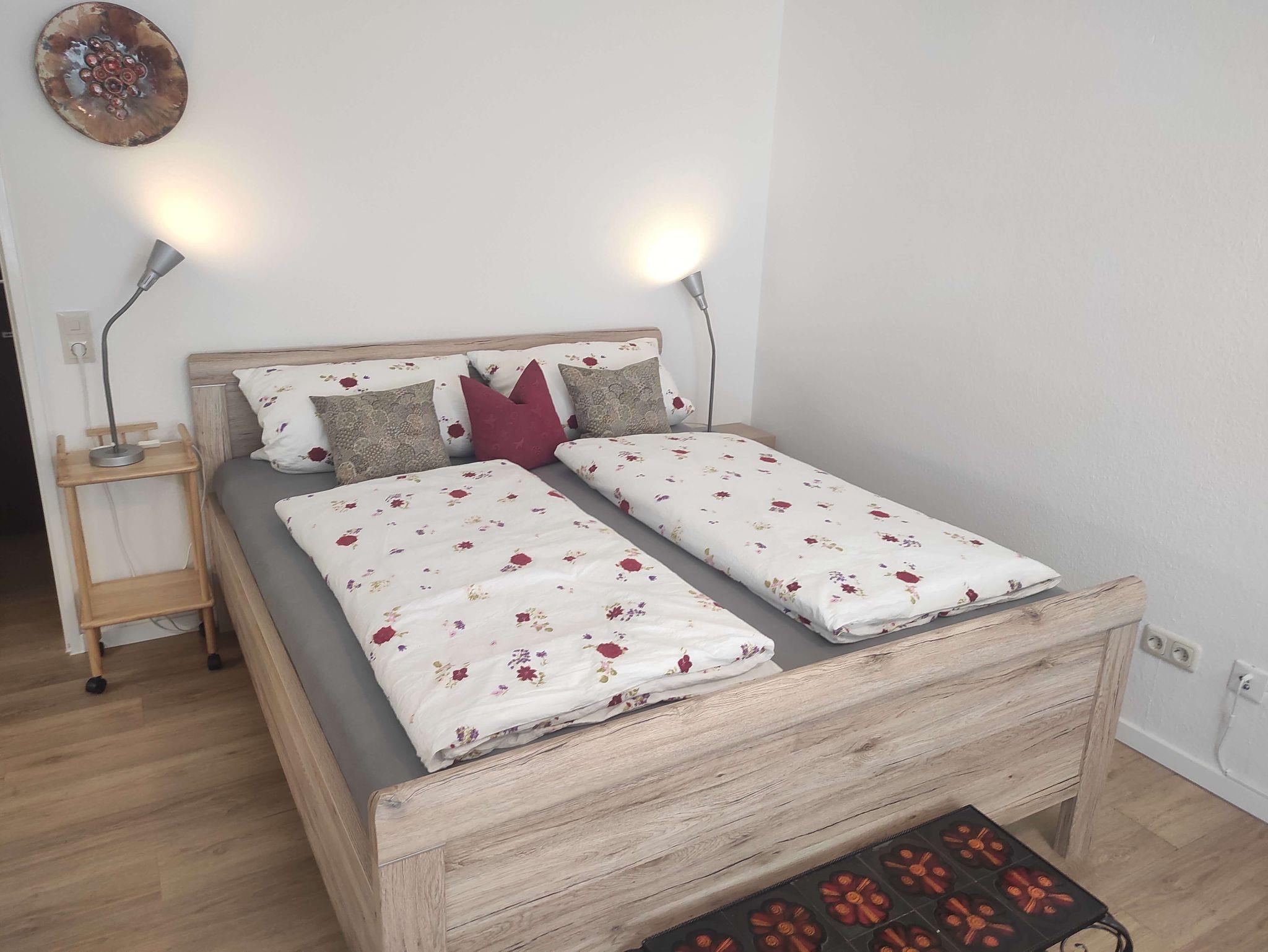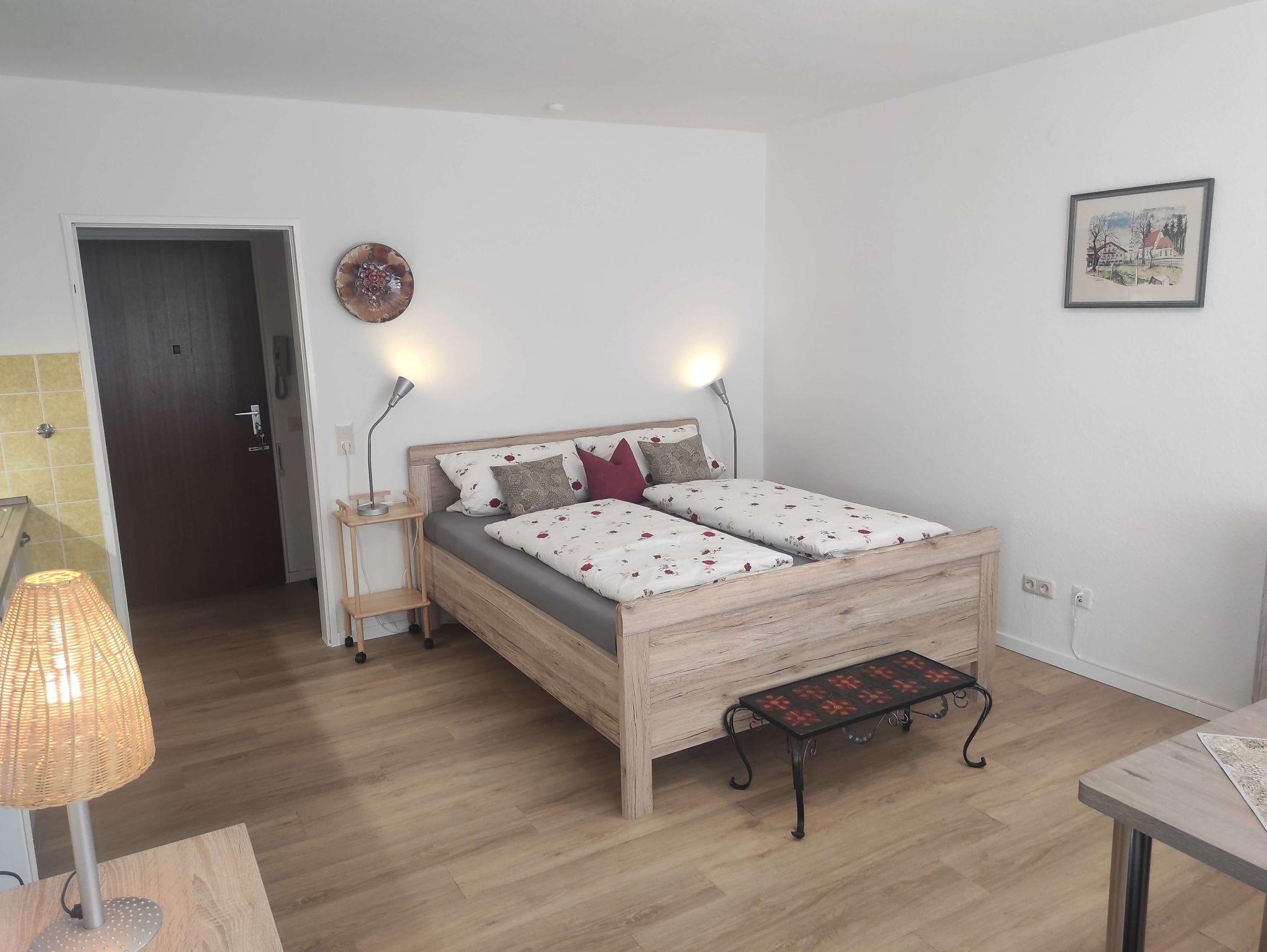 Doppelbett (200-160) im Wohn-/Schlafbereich, Kommode, TV, Radio und WLAN.