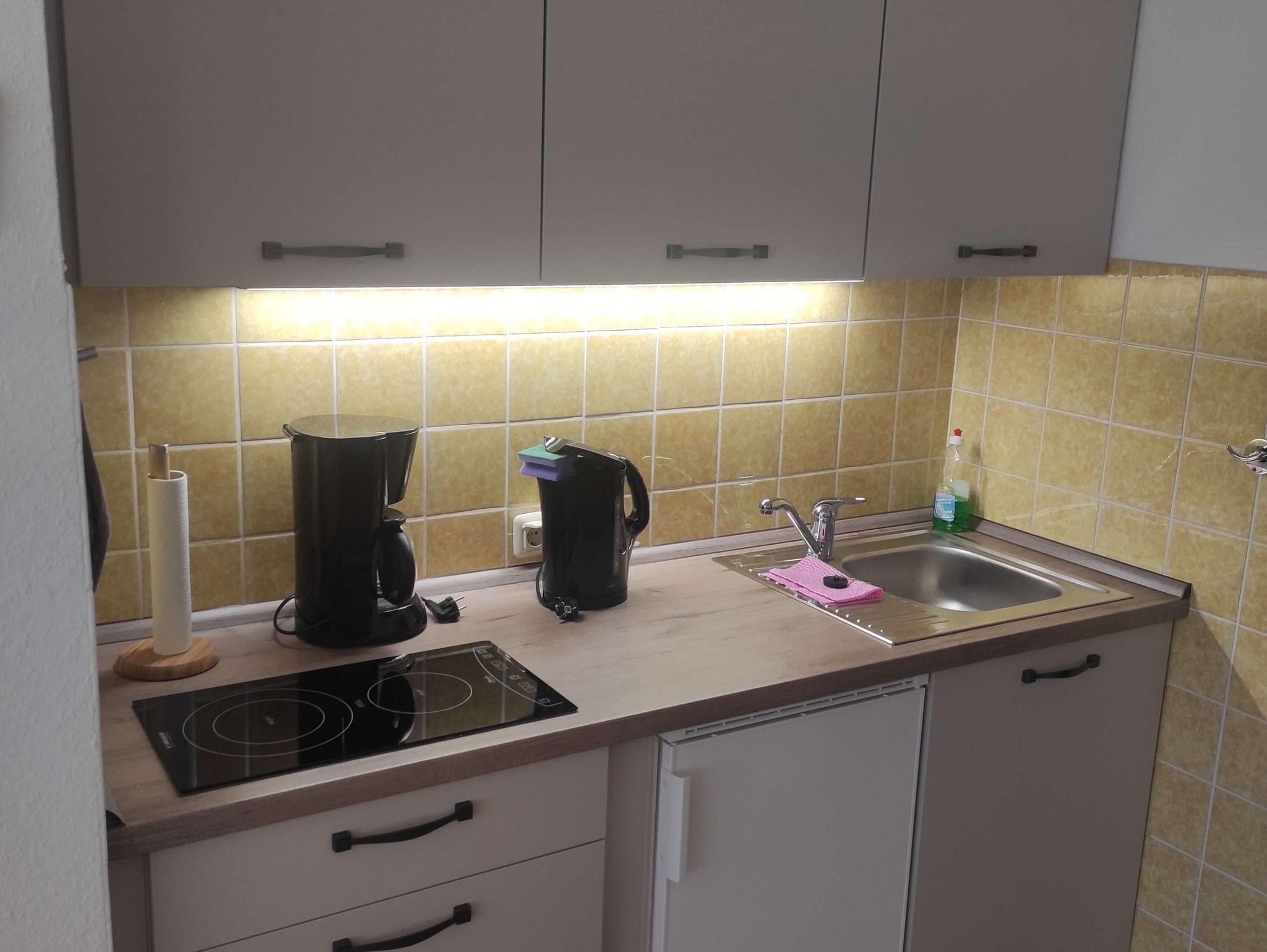 Einbauküche mit 2(3)-Felder-Cerankochfeld, Kühlschrank mit Gefrierfach, Kaffeemaschine, Toaster, Wasserkocher Mixer, diverse Kochutensilien, Besteck und schönem Geschirr.
