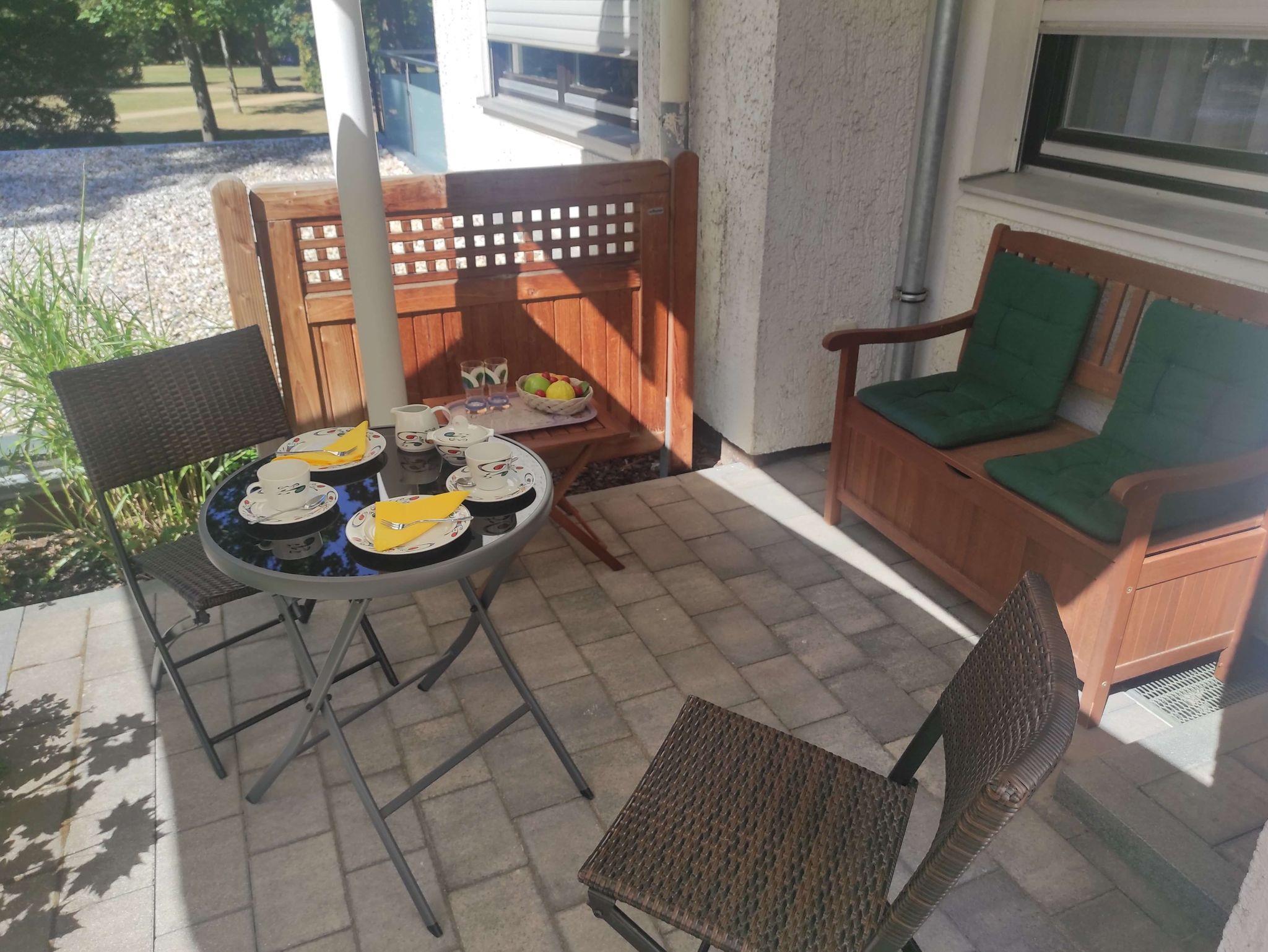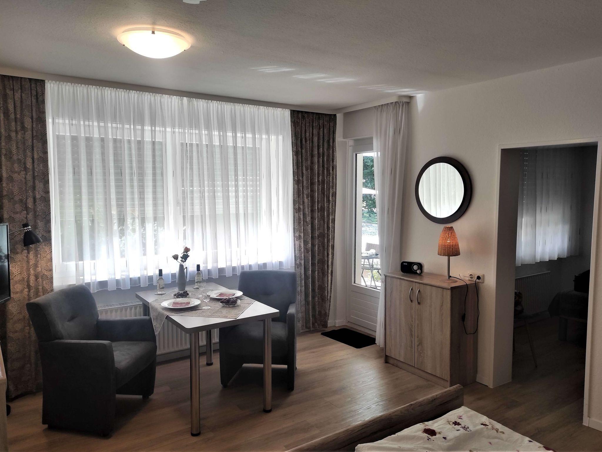 Ferienwohnung Magdalena ist auf ca. 40 qm ideal für 2- 3 Personen. Besteht aus Wohn-/Schlafbereich mit separatem kl. Schlafzimmer, Einbauküche und Essplatz. Flur mit Garderobe. Duschbad und Sonnenterasse mit Blick in den Stadtpark.