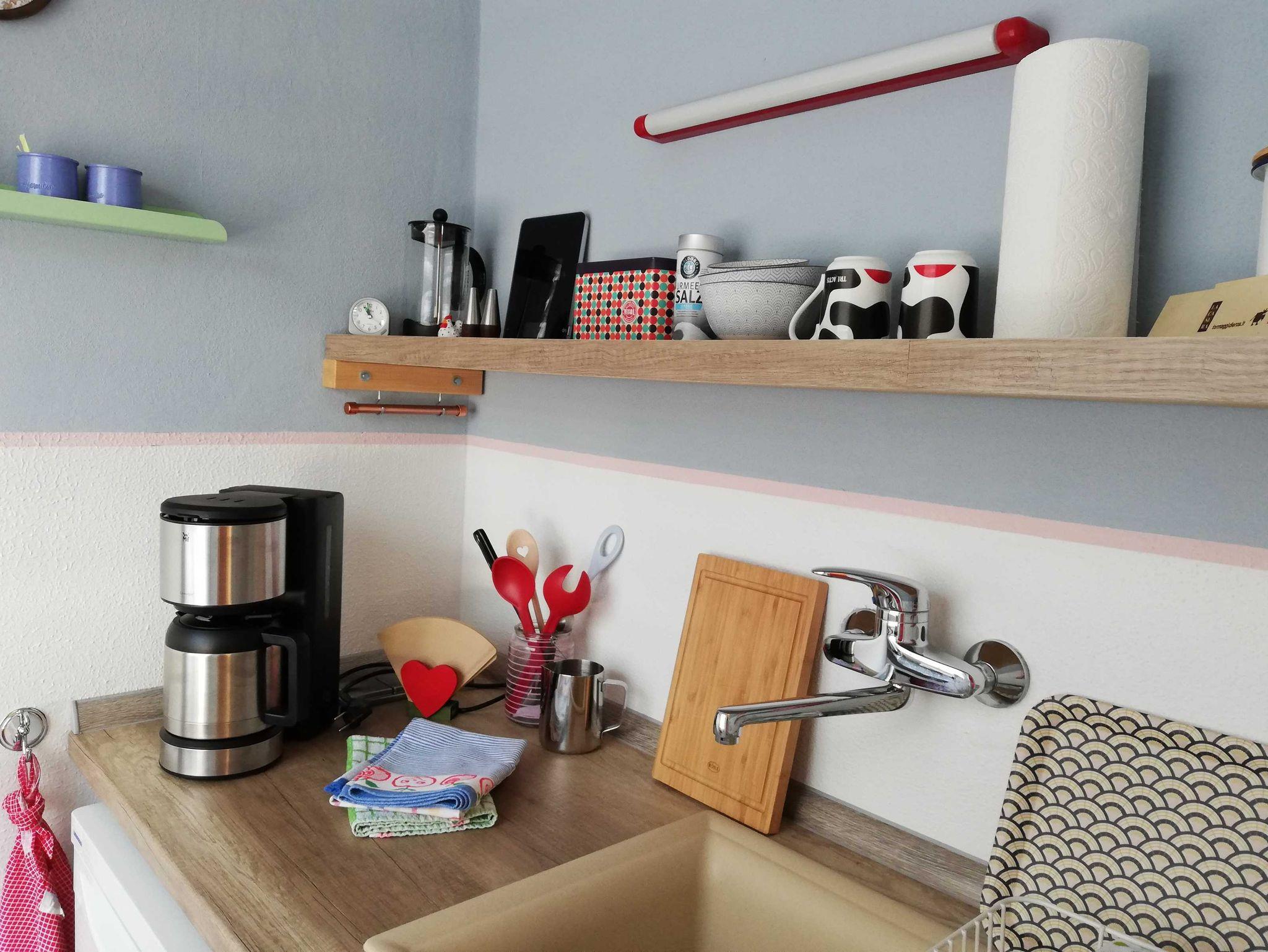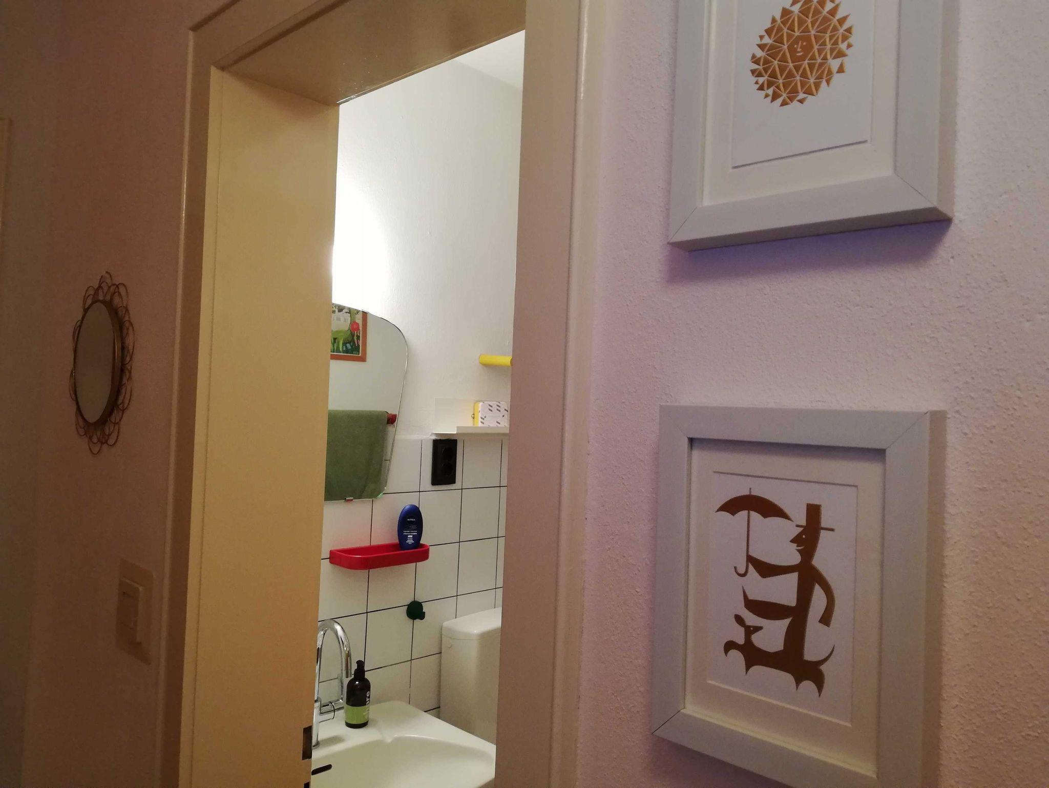 Die Nichtraucher-Wohnung verfügt über ein Wohnzimmer mit Balkon. Vom Frühstückstisch aus genießen Sie den Blick ins Grüne. Die kleine Küche ist mit Kühlschrank, Elektro-Herd, Kaffeemaschine, Toaster, Wasserkocher sowie mit Geschirr vollständig ausgestattet. Im Bad gibt es eine Dusche und auch eine Waschmaschine. Das Schlafzimmer verfügt über zwei separate Betten, Sitzgelegenheit und ausreichend Stauraum.