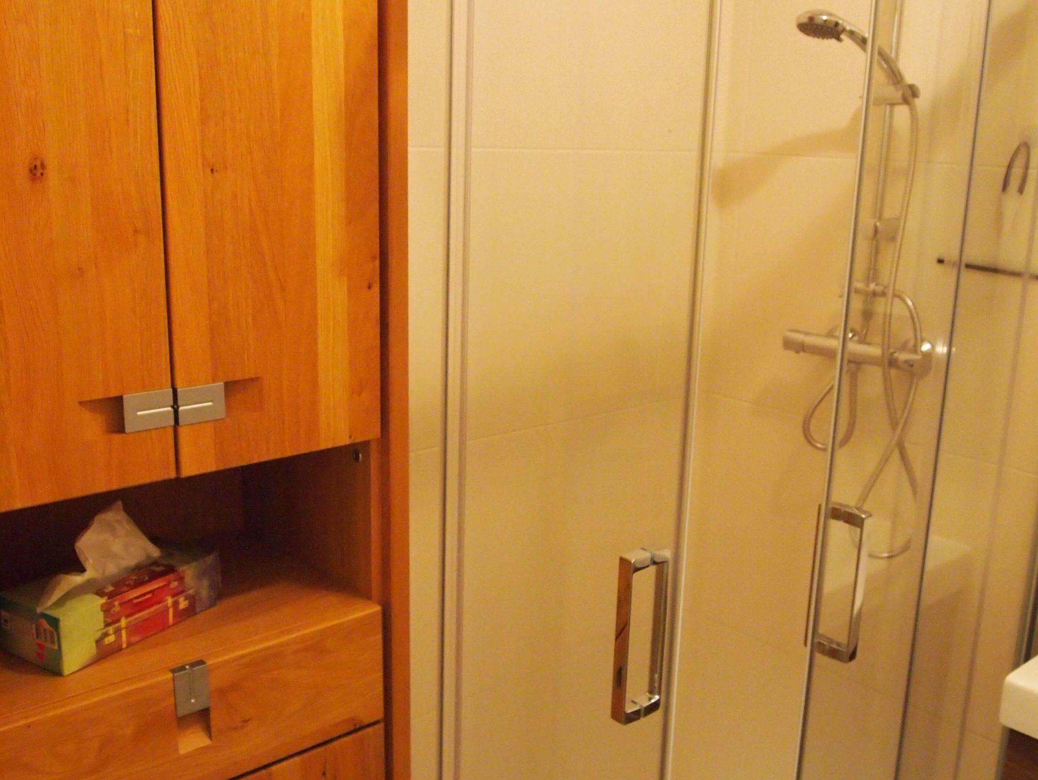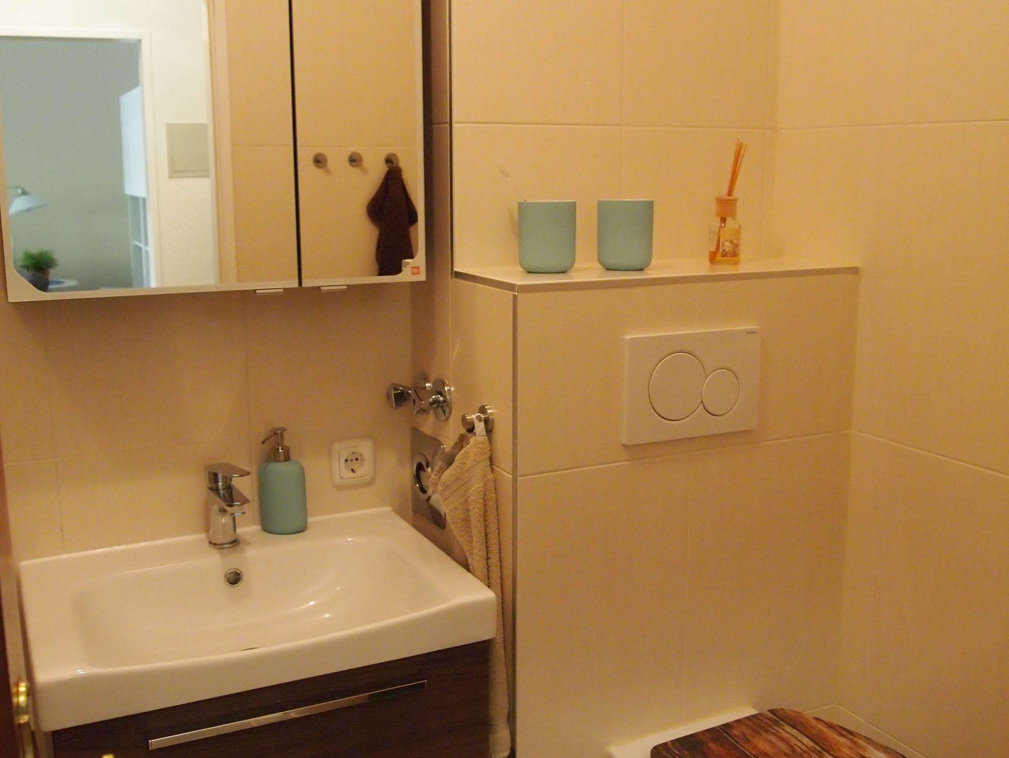 Im Badezimmer gibt es eine Dusche mit Abtrennung, ein Waschbecken und ein höheres Hänge-WC.