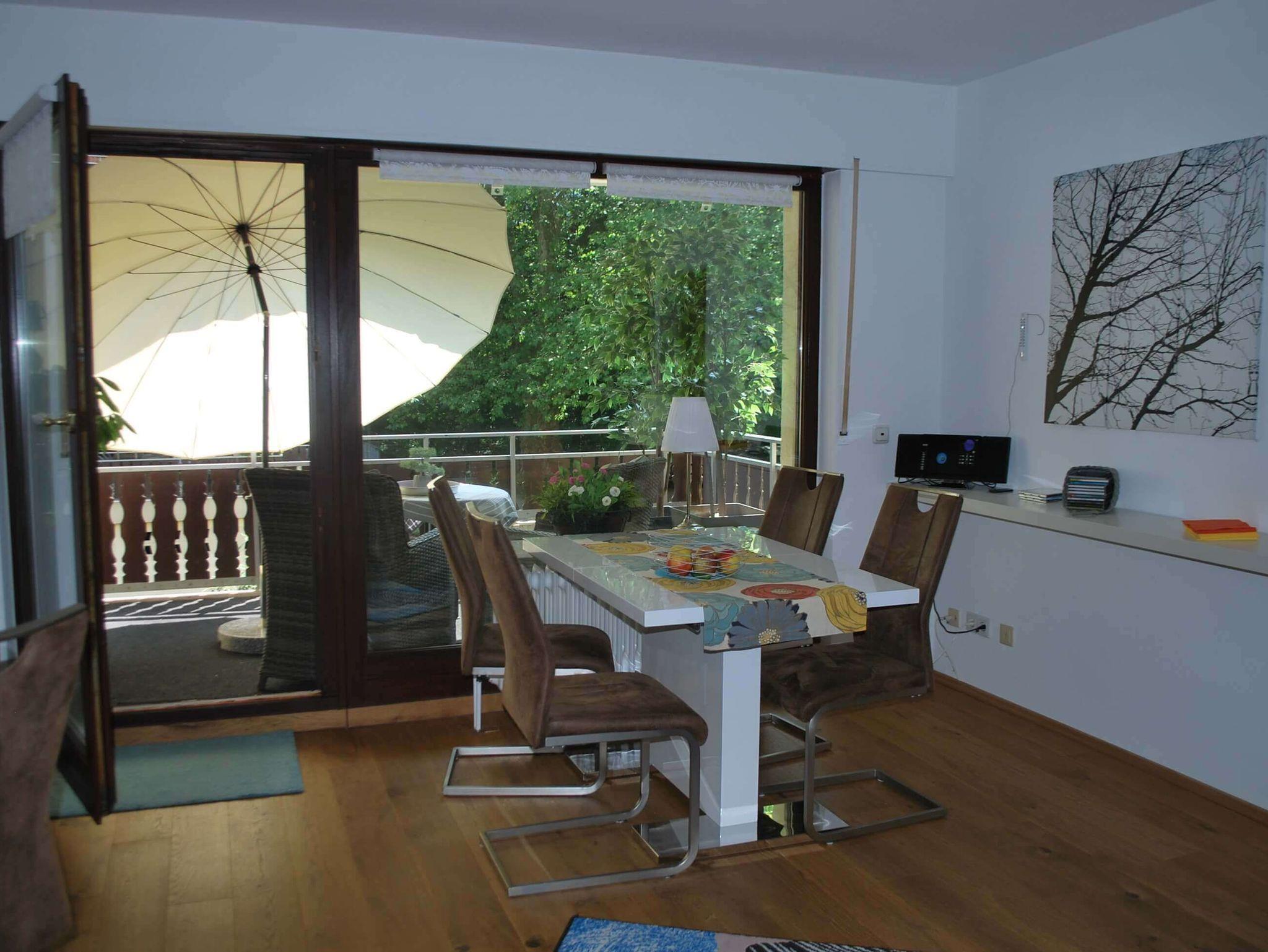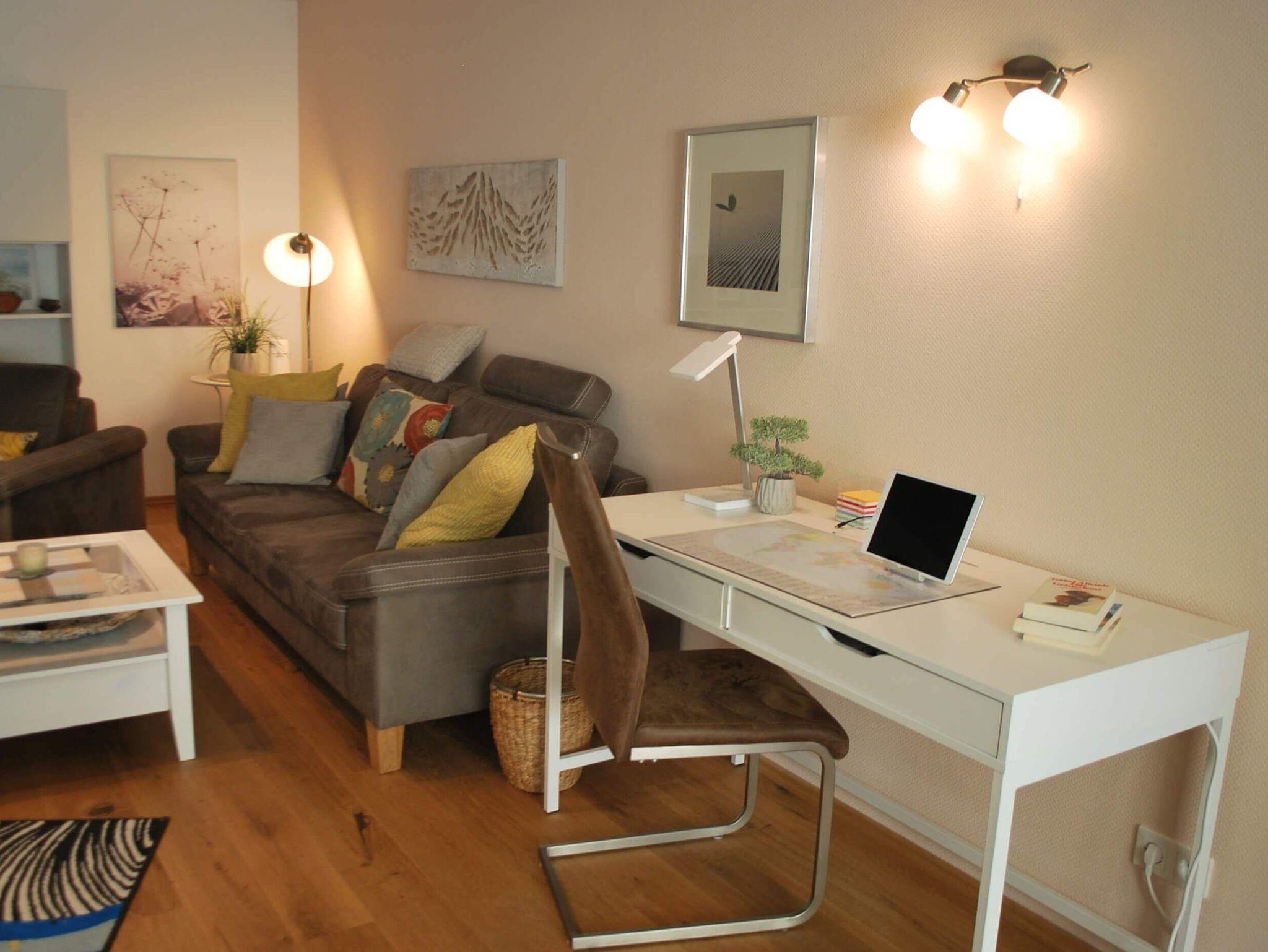 Im Wohnzimmer wartet eine moderne Couch und ein Sessel mit Fußhocker, ein Esstisch mit 4 Stühlen vor dem Balkonfenster, einen Schreibtisch, einen Flachbild-TV und eine Stereoanlage auf Sie.