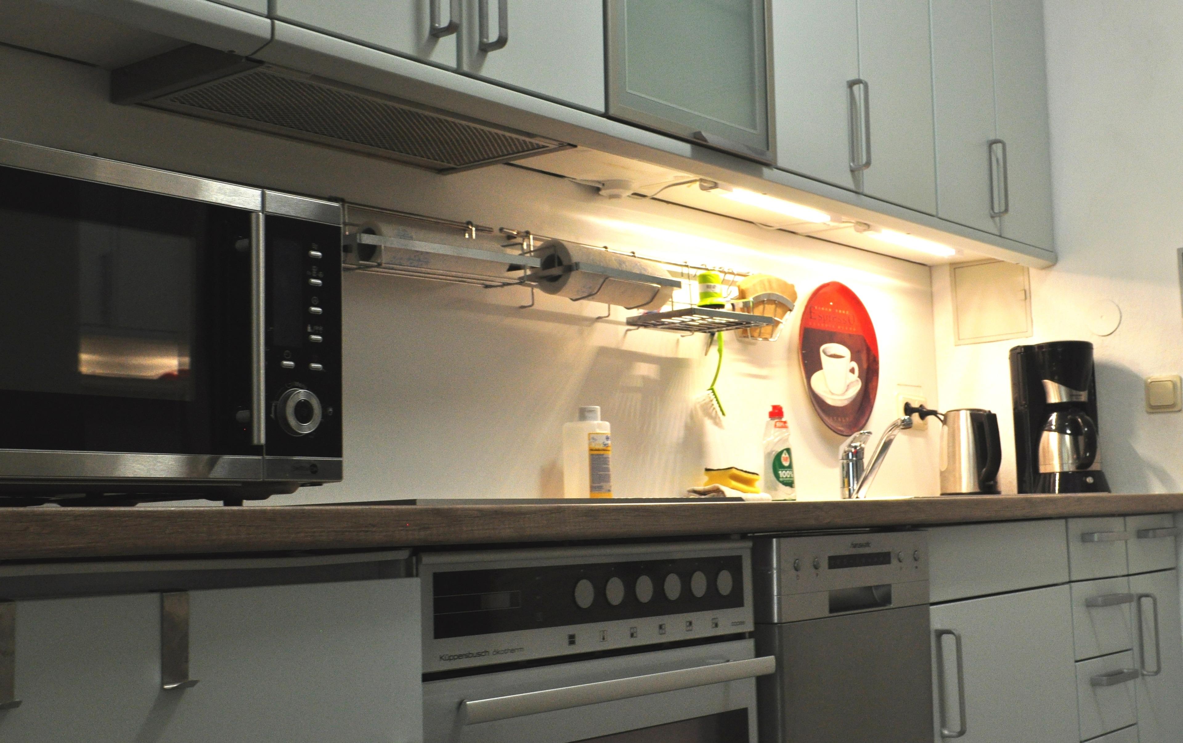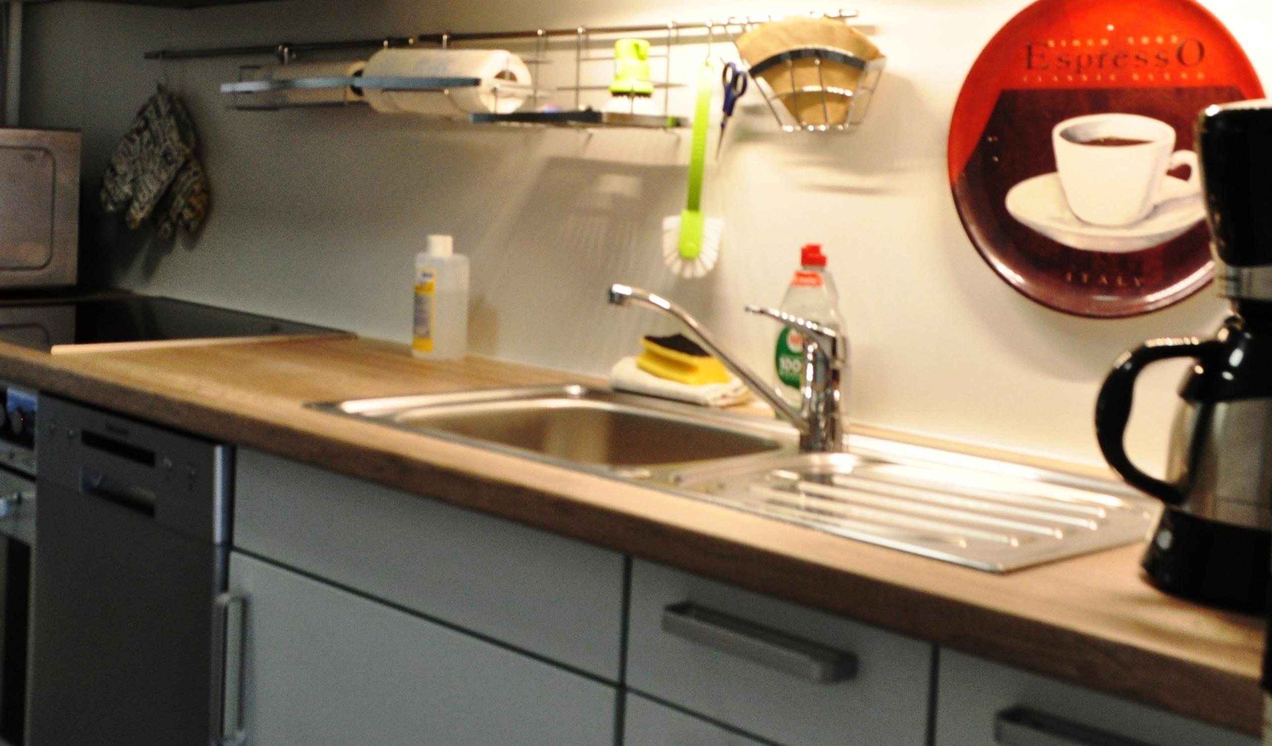 Die gut ausgestattete Küche besitzt unter anderem einen Toaster, Wasserkocher und eine Kaffeemaschine.