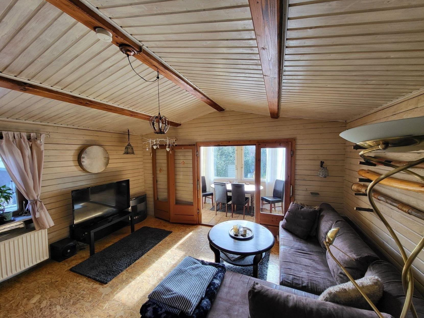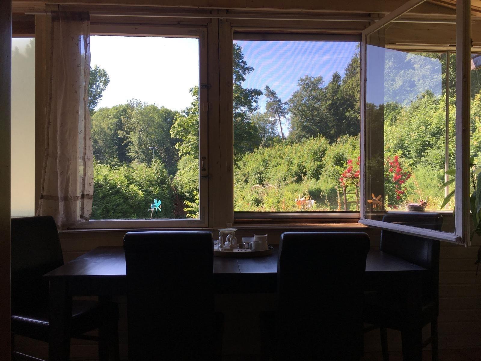Sie ist urig wie ein Schwedenhaus, was eine warme Atmosphäre schafft. Sie verfügt über einen Wintergarten mit Blick in den wundervollen Wald.