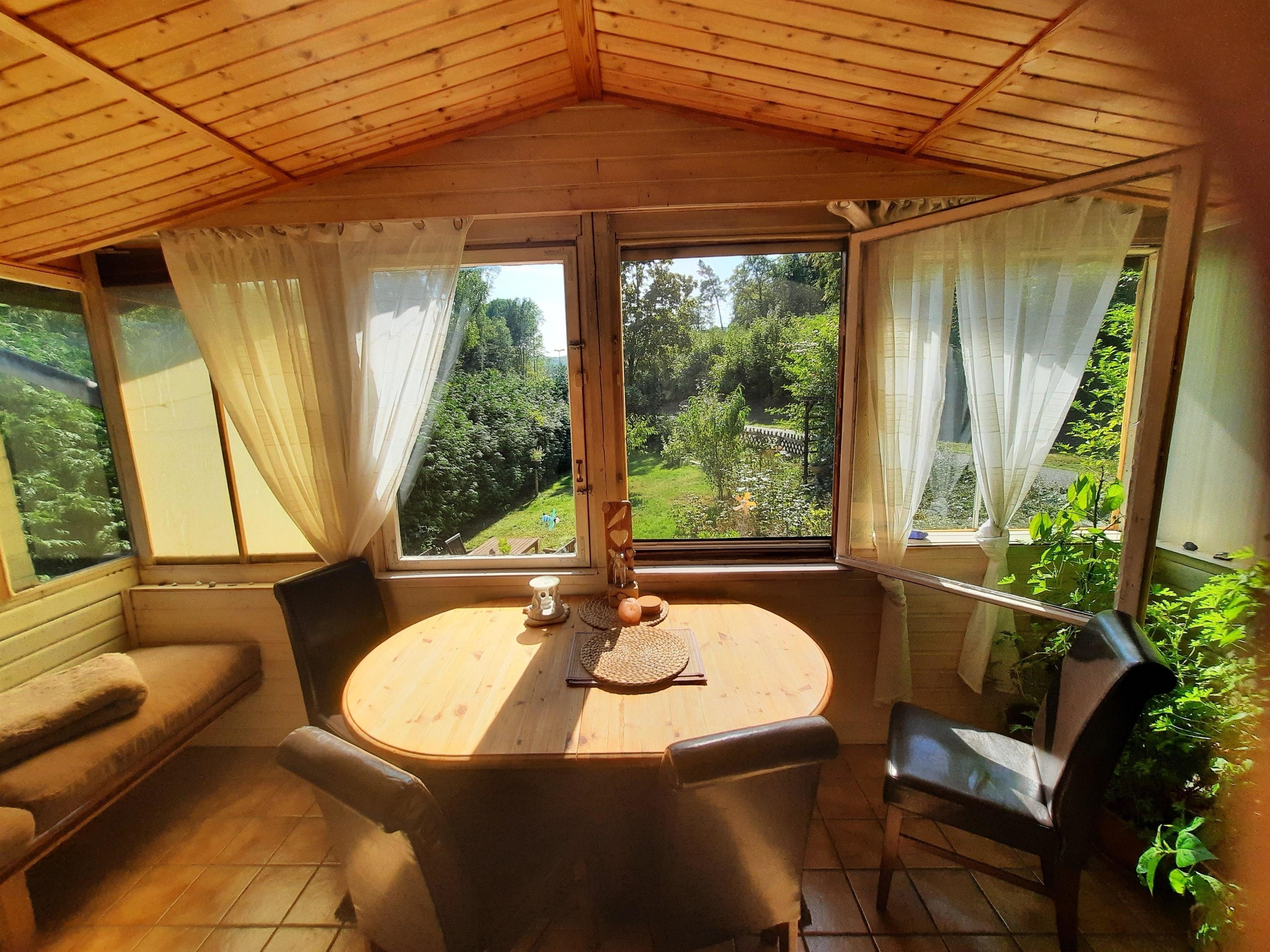 Besonders schön ist das Wohnzimmer mit Wintergarten/ Esszimmer. Von hier aus genießen Sie eine wunderbare Aussicht in den Wald.