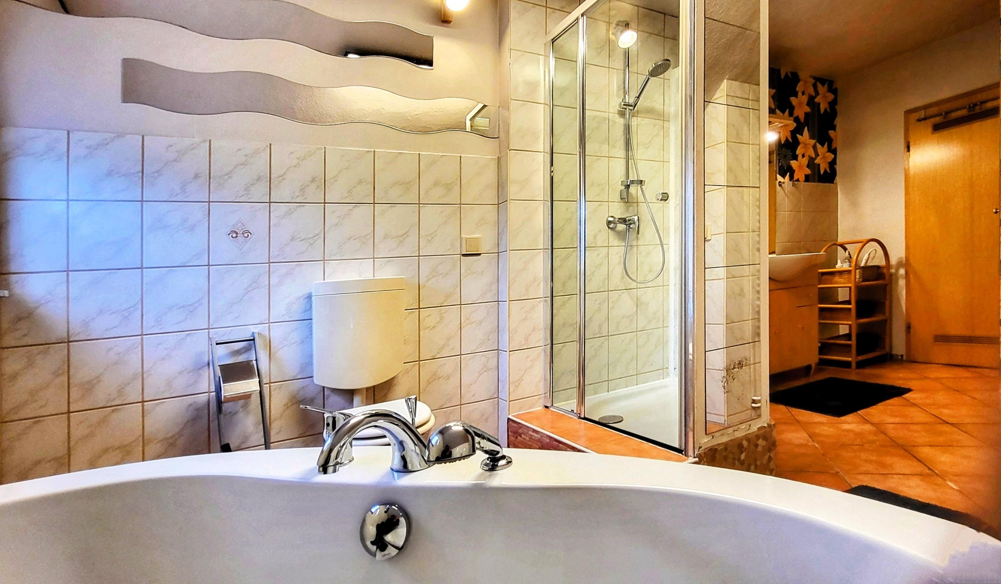 * ein geräumiges Tageslichtbad mit Eckwanne, Dusche und WC