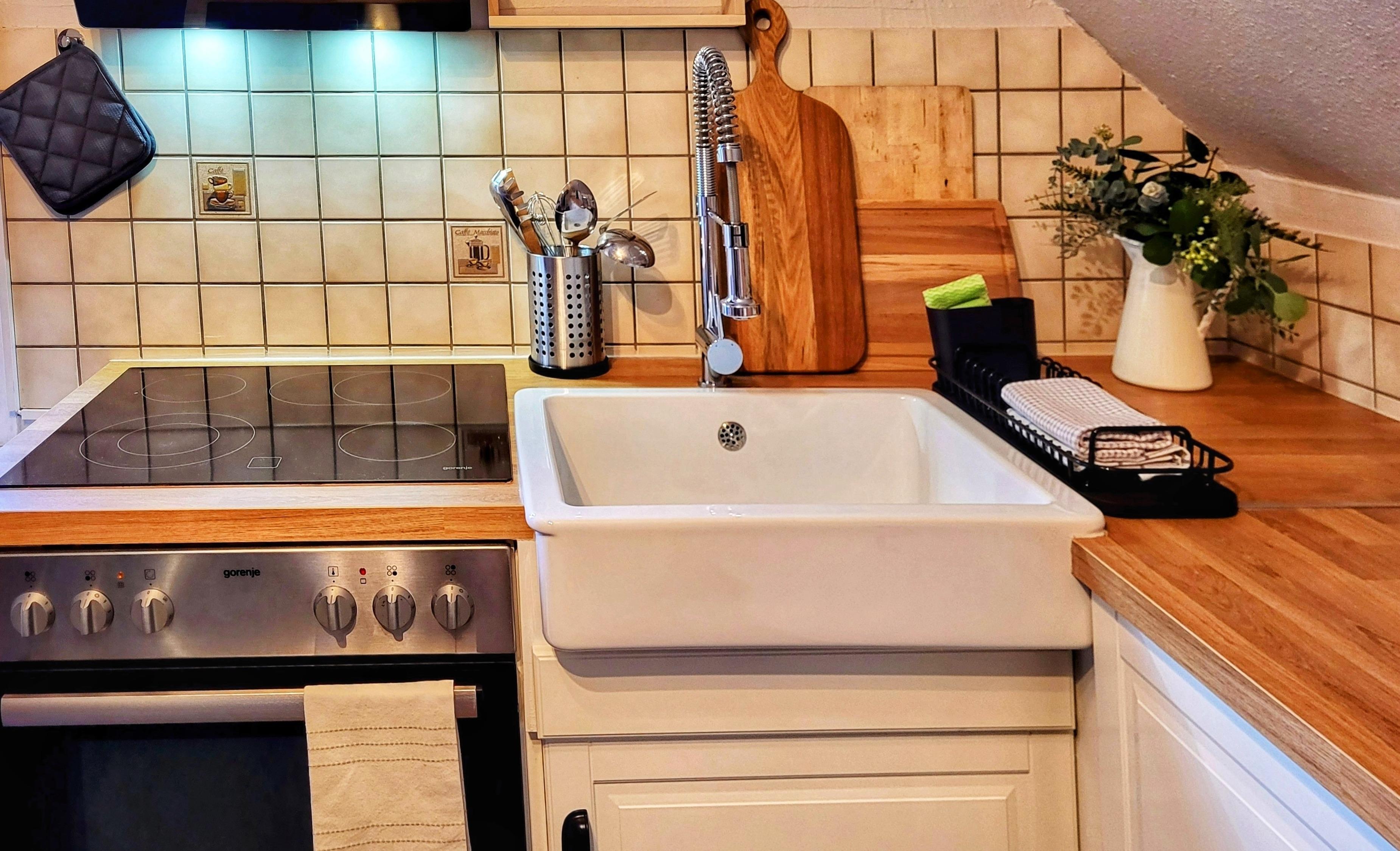 * eine separate Küche inkl. Kühlschrank mit 3 Gefrierfächern, 4-Platten-Ceranfeld mit Backofen, Kaffeemaschine, Mikrowelle